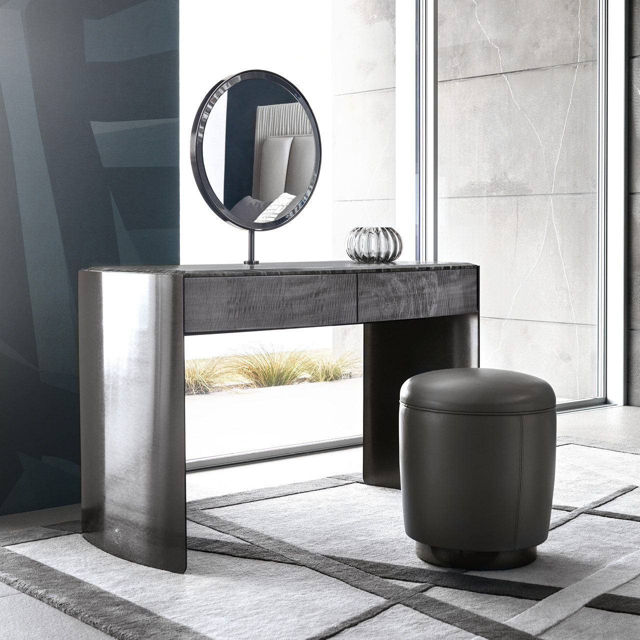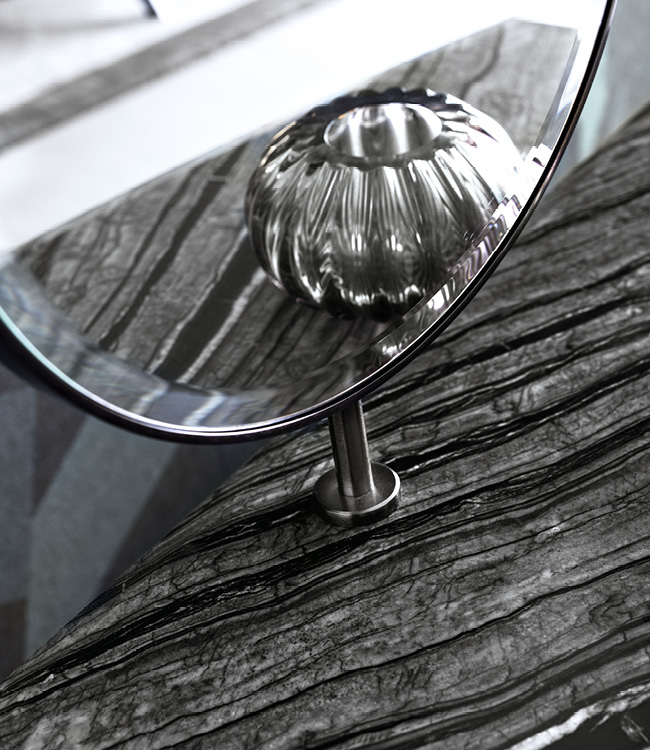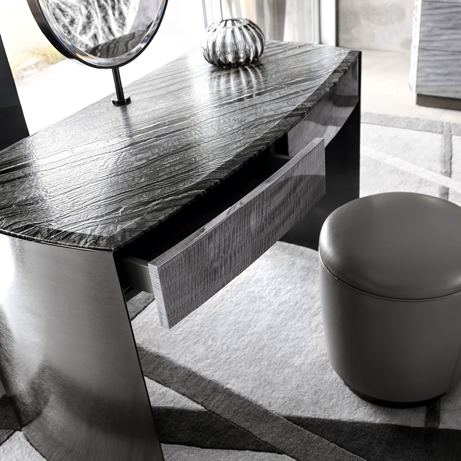 Vanity desk in Madagascar figured Mowingui veneer in high gloss polyester finish. Top in Kenya black marble. Curved legs in satin black nickel stainless steel with lasered Giorgio Collection logo. 2 center full extension drawers with bottom part in velvet fabric.