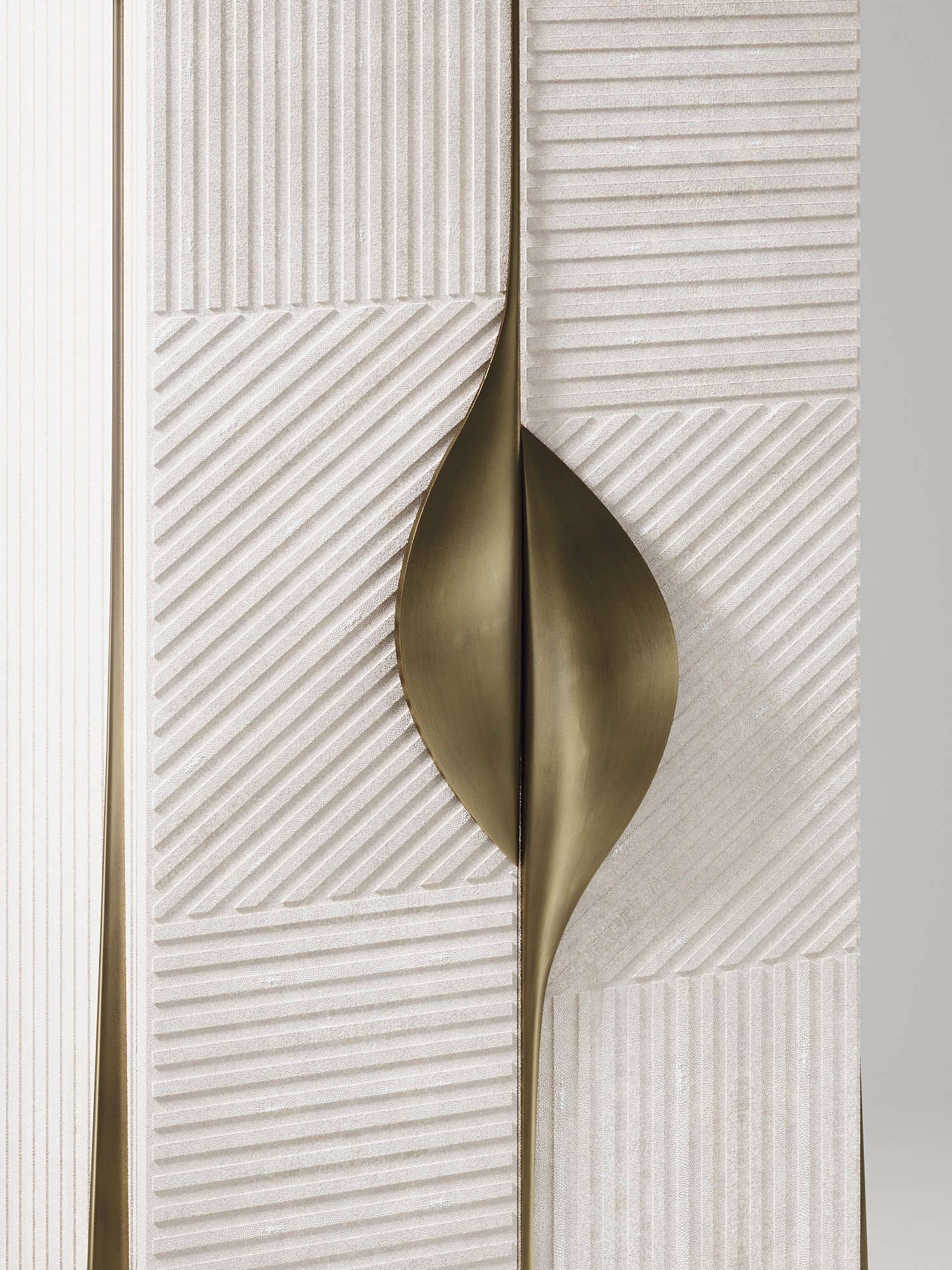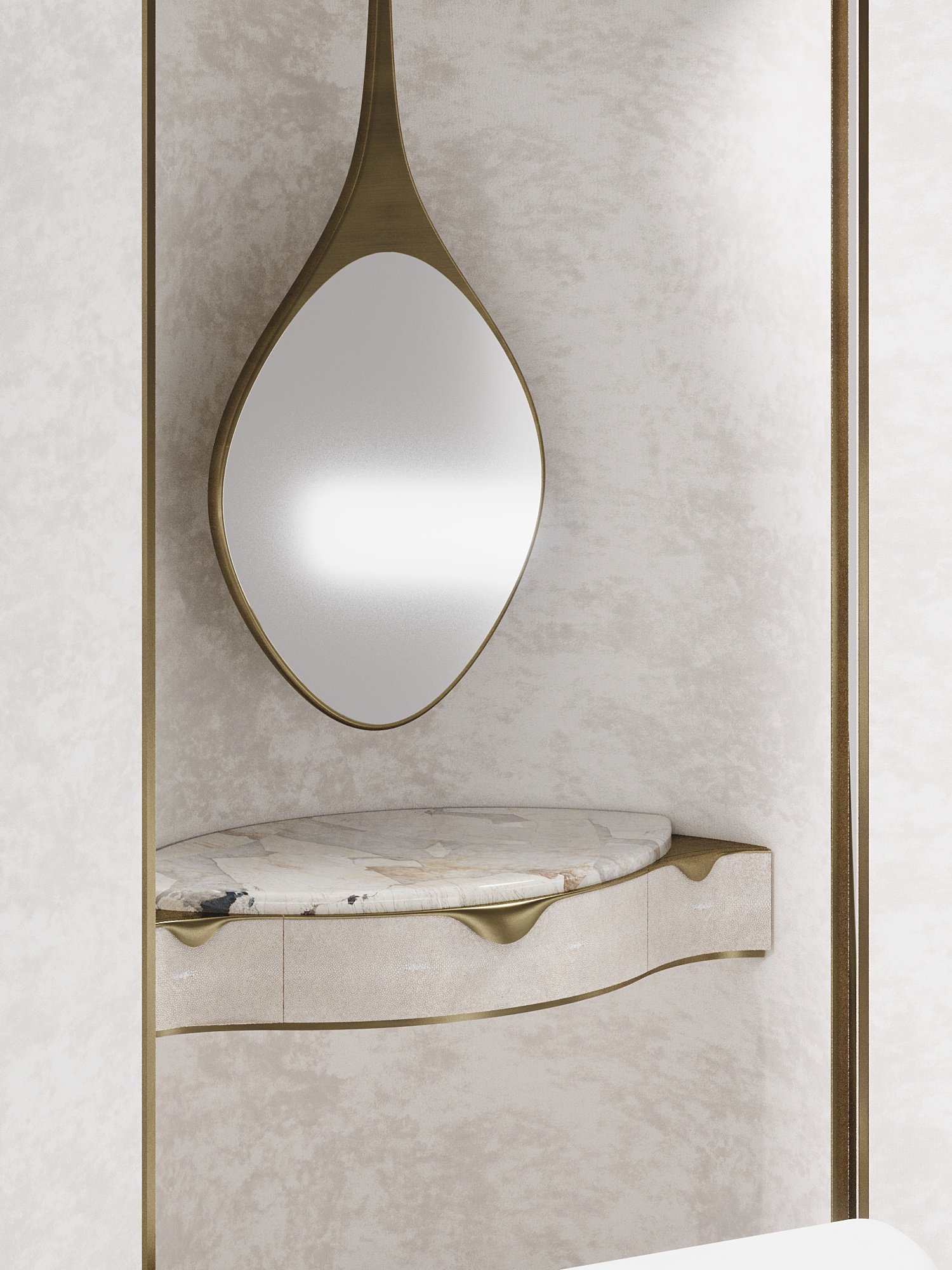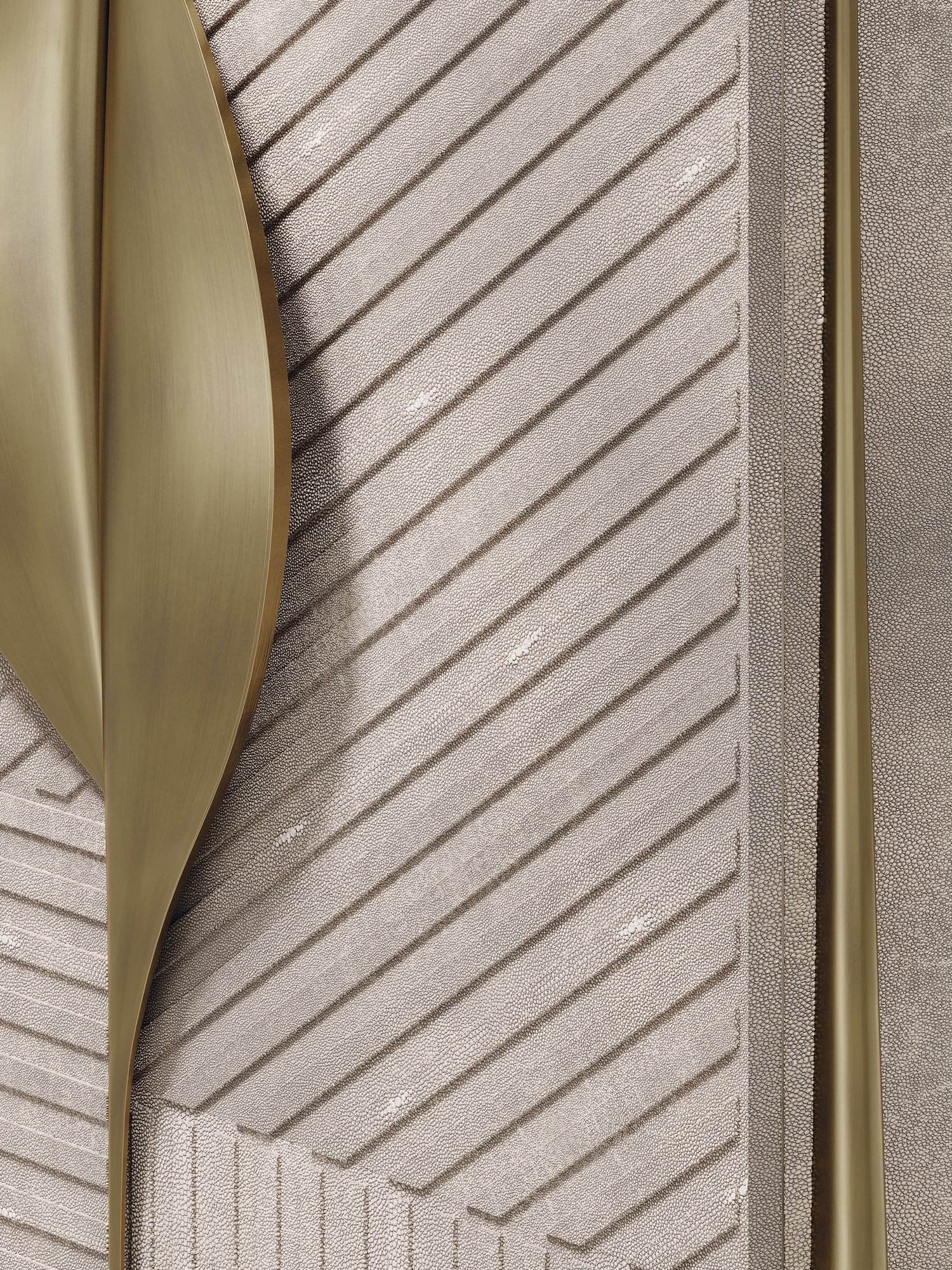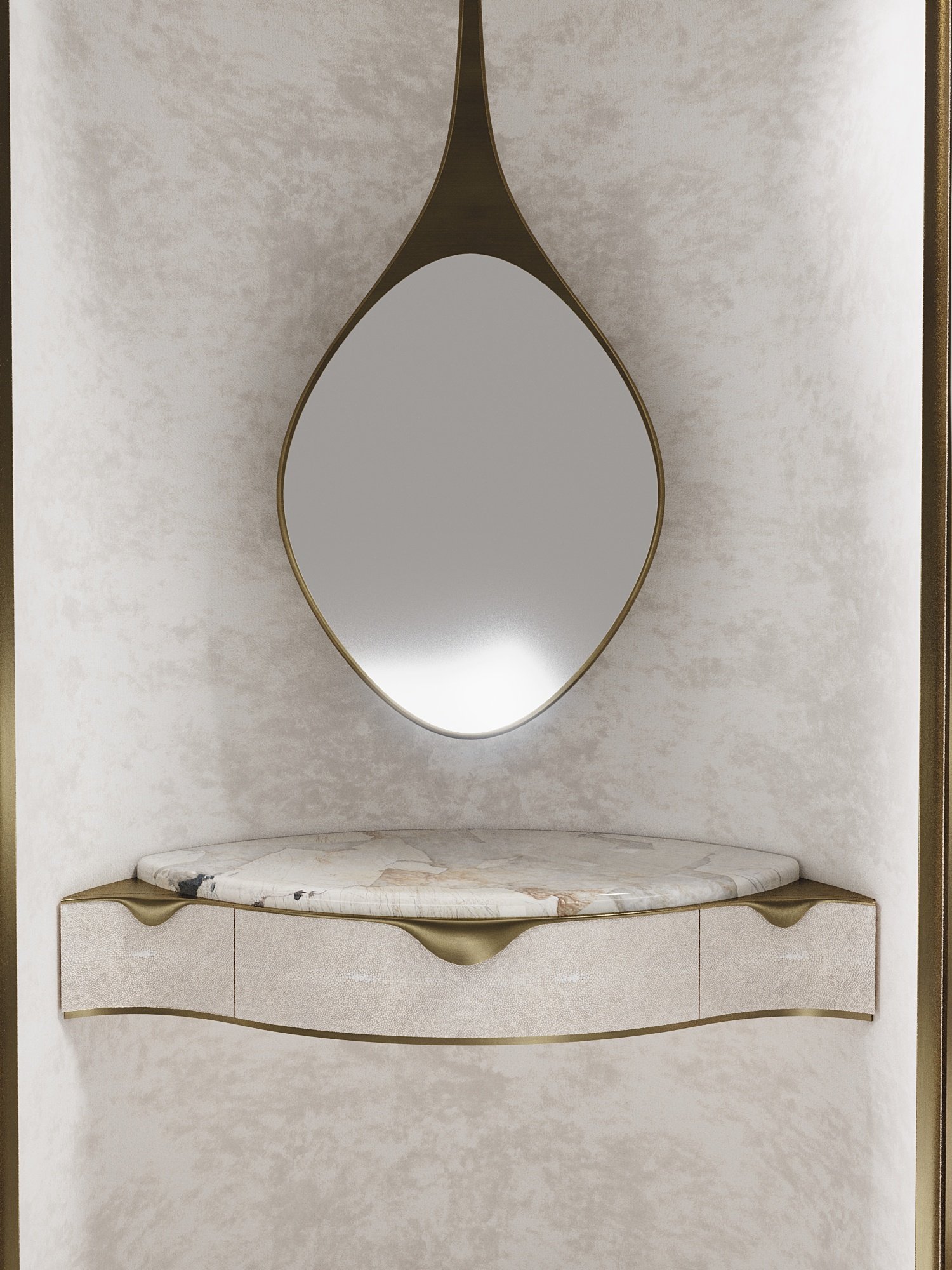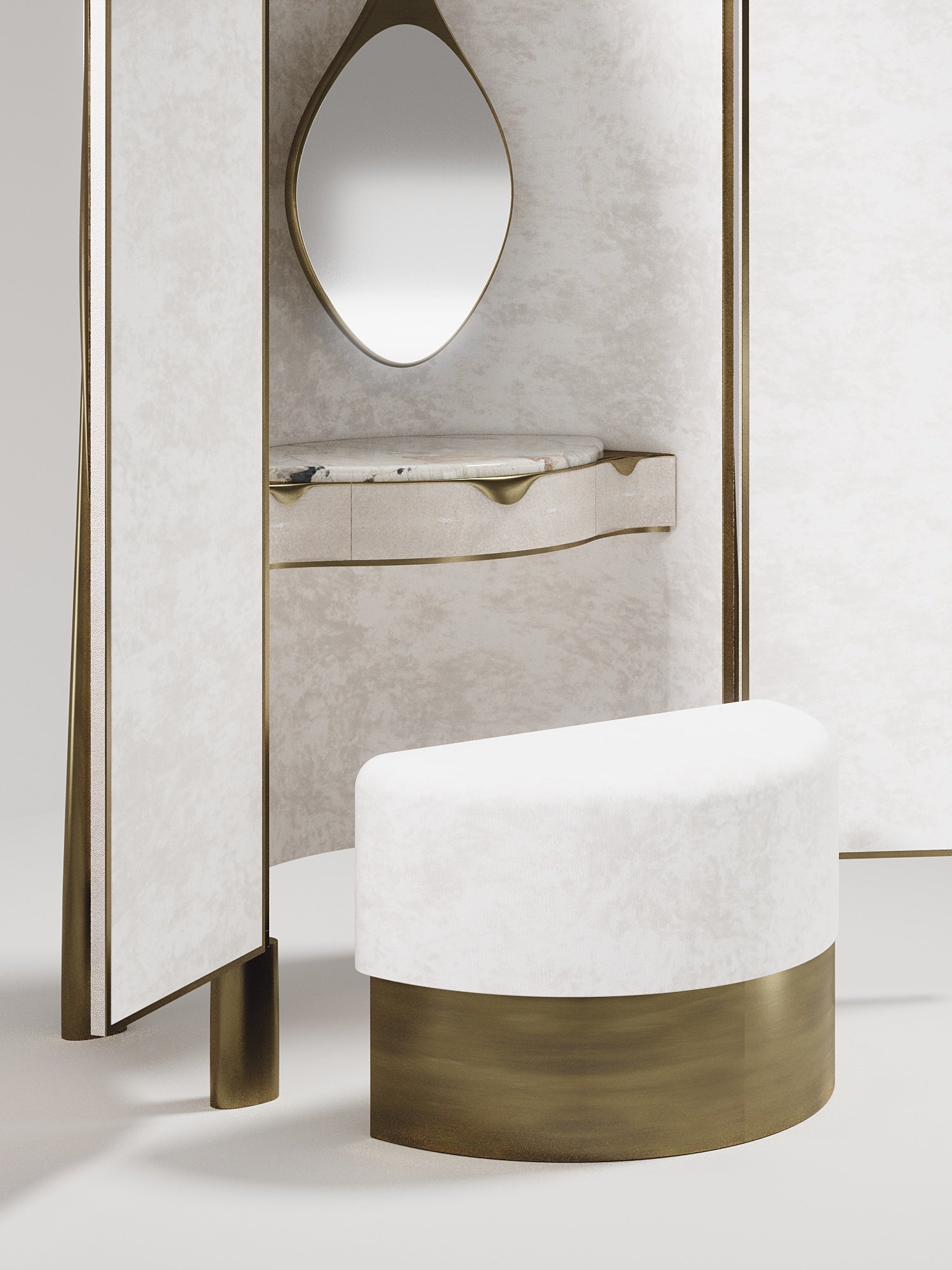 The Wave Vanity Cabinet by R&Y Augousti is one of a kind statement piece. The overall piece is inlaid in cream shagreen, with the exterior hand-carved in an updated version of the signature Augousti "rhomboid" pattern. The door handles and legs are in a bronze-patina brass. The interior of the piece opens up to an ultra luxe vanity. An elegant pendant mirror floats above a patagonia semi-precious stone top, while the interior walls are lined in a plush cream velvet. This piece comes with a matching cream velvet / bronze-patina brass stool that tucks inside the cabinet when closed. Available in other finishes and as a bar cabinet