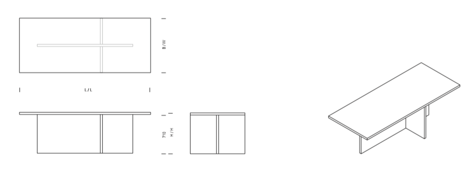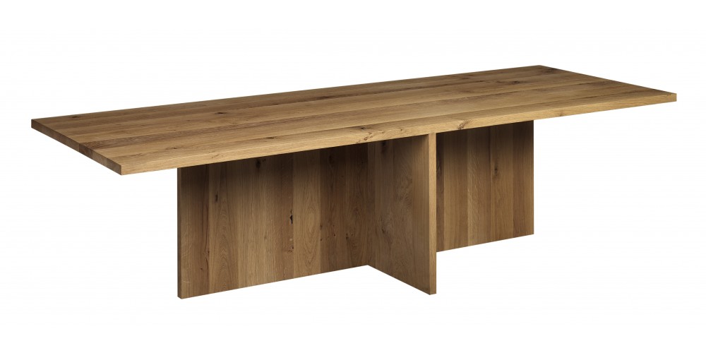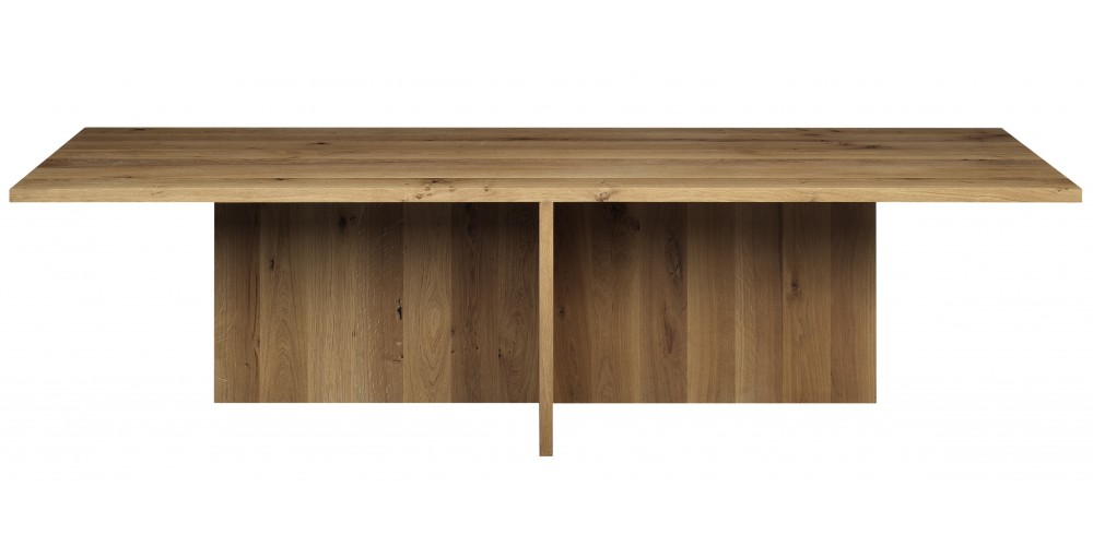 The table ZEHN has through the complete reduction to its geometric form a sculptural appearance. Due to its simple middle leg, which dependant on the length of the table, is symmetrically positioned underneath the table top, the usual protruding stilts are omitted. With a solid wood thickness of table top and leg of 40 MM (1 5/8 INCH), ZEHN is available in oiled European oak. Its reduced form enables the table to suit various interiors as a conference or dining table. ZEHN offers seating for up to eight people with a length of 2400 MM (94 1/2 INCH) and up to ten people with a length of 3000 MM (118 1/8 INCH). The table ZEHN is perfectly complemented with side chairs HOUDINI or THIS. The clearance underneath the table top measures 710 MM (28 INCH).