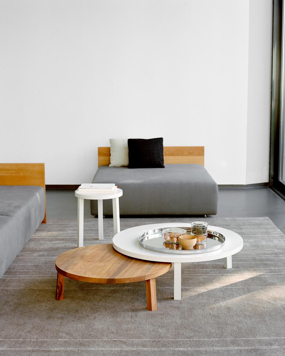 With its rounded, minimalistic forms, the LEILA coffee table supplies a compelling contrast to the rectangular structure of sofas and chairs. Given its different size options, the LEILA possesses exceptional versatility. LEILA is available in selected materials, such as solid European oak and walnut. The oak version is also available in colour stained and matt varnished surface tones. This combination produces a capturing effect by allowing the natural wood grain patterns to shimmer forth from beneath the varnish, highlighting the origin and authenticity of the materials. The ideal companions of the LEILA are the tables ALEX and the HABIBI tray.