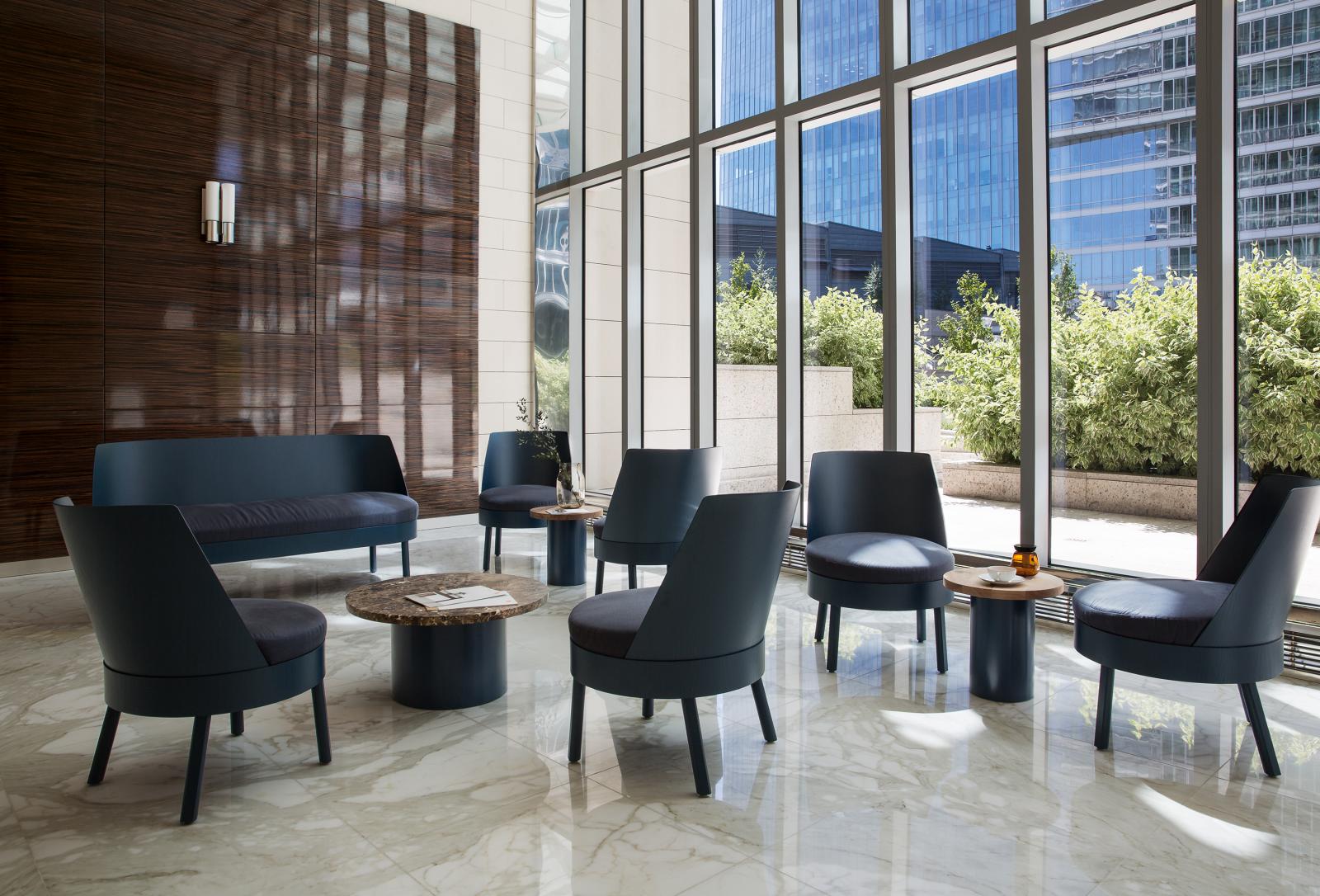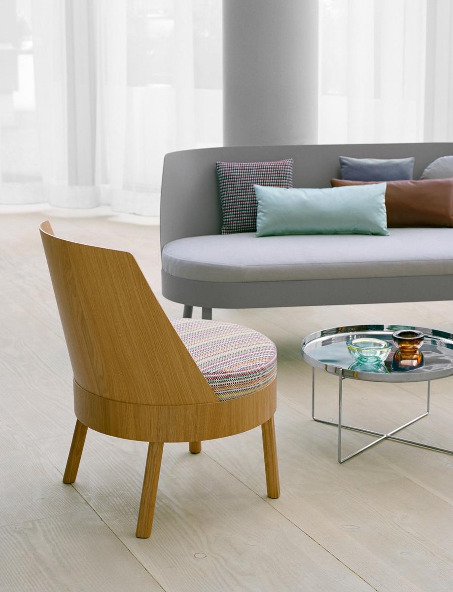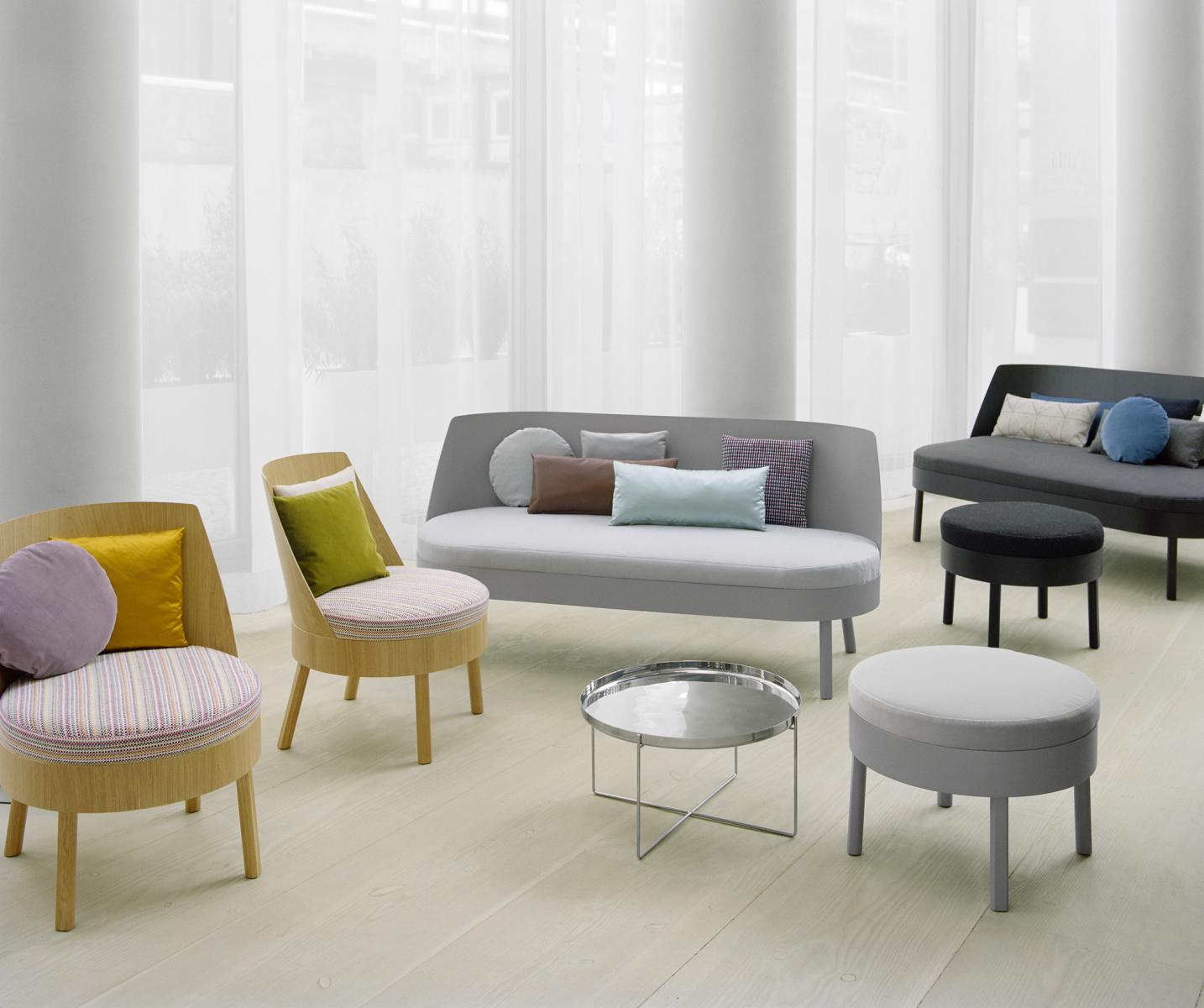 The stool BESSY with its round upholstered seat is made from flexible oak-veneered plywood. Space-saving BESSY is suitable for private use as well as for contract use especially in hotel lobbies and bars. The upholstered seat is not fixed.