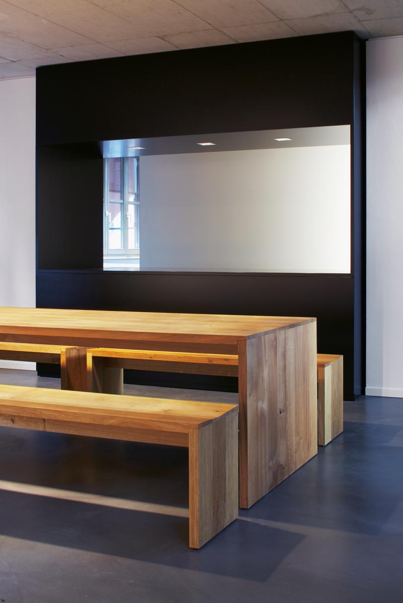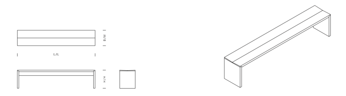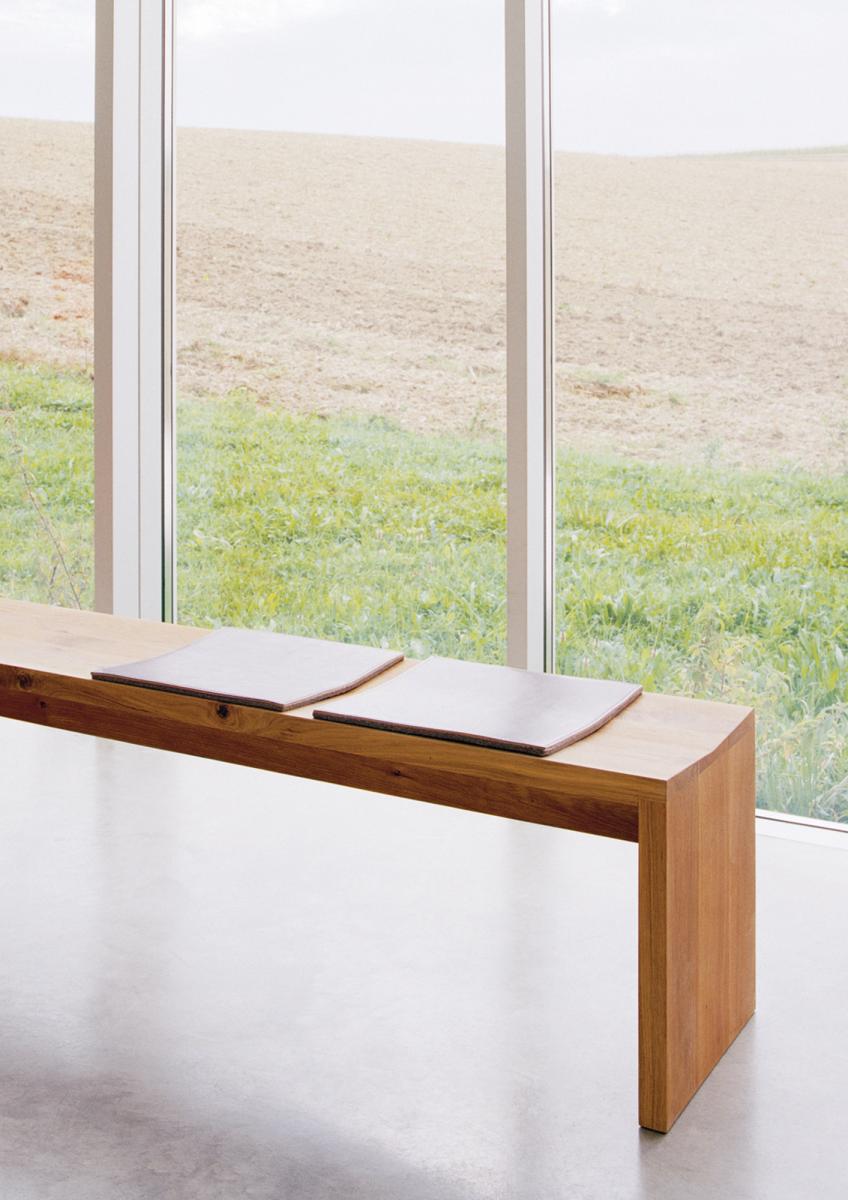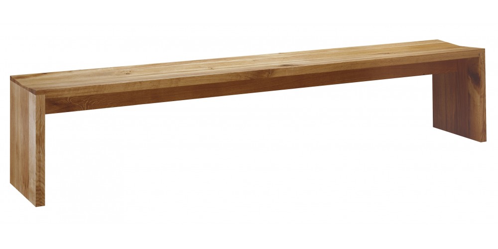 The solid wood bench CALLE consists of a contoured seat, two sides flushed with the seat and a support beam underneath. The top surface tapers toward the middle to allow comfortable sitting. The wood for the bench is 40 MM (1 5/8 INCH) thick, the seat consists of three boards.