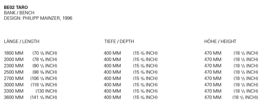 The sides of bench TARO are pushed slightly inward to enhance stability, therefore this bench can be offered in a standard length of up to 3600 MM (141 3/4 INCH). The wood is 40 MM (1 5/8 INCH) thick and the top tapers toward the middle for comfortable sitting. This bench, with its clean lines is made of three boards and works well in combination with the tables BIGFOOT? and JAPAN. TARO is delivered as on piece.