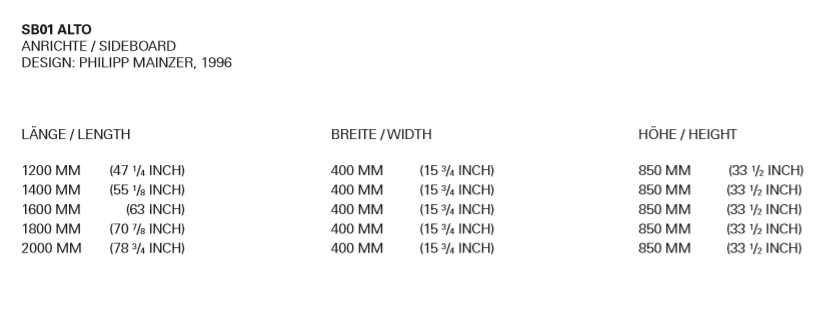 With its clear design language and pure materiality, sideboard ALTO is perfectly suitable for both private and public interiors. The corner joints offer a distinctive e15 design detail, with the 40 MM (1 5/8 INCH) thick top milled to half of its thickness at the ends.