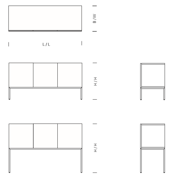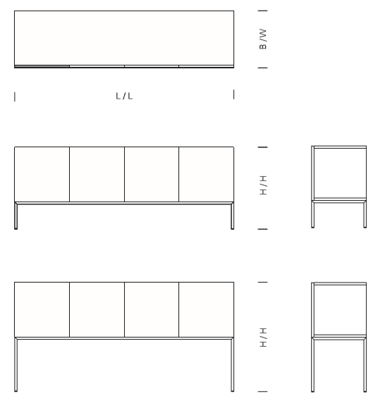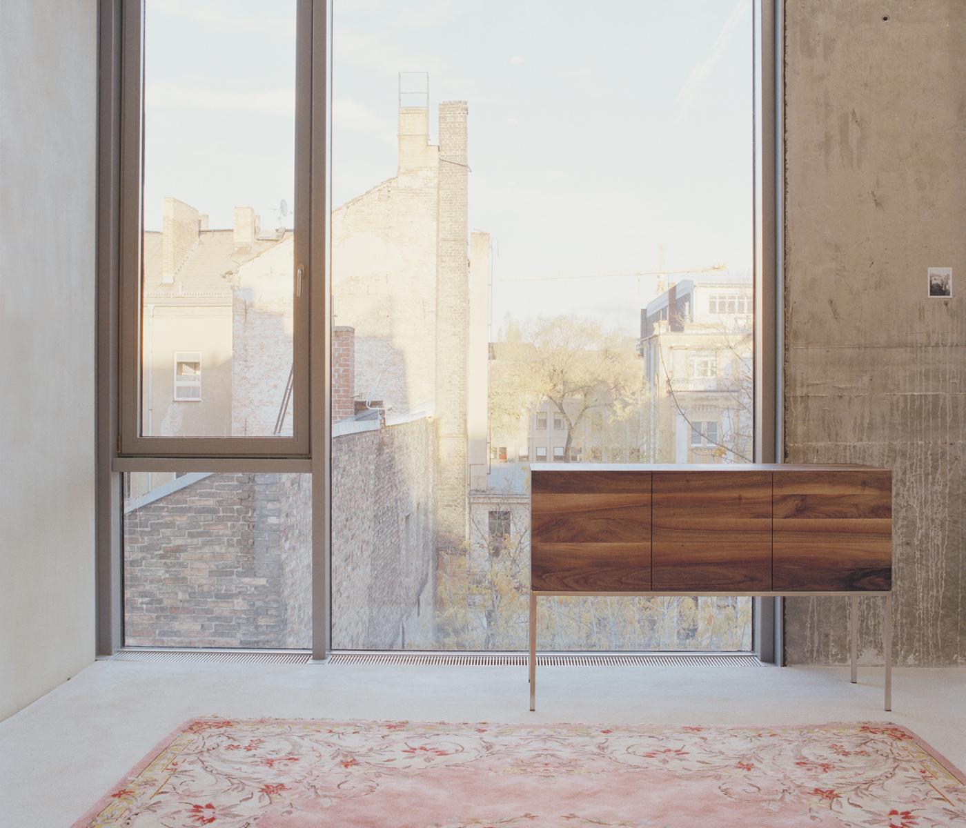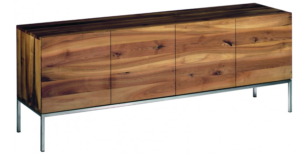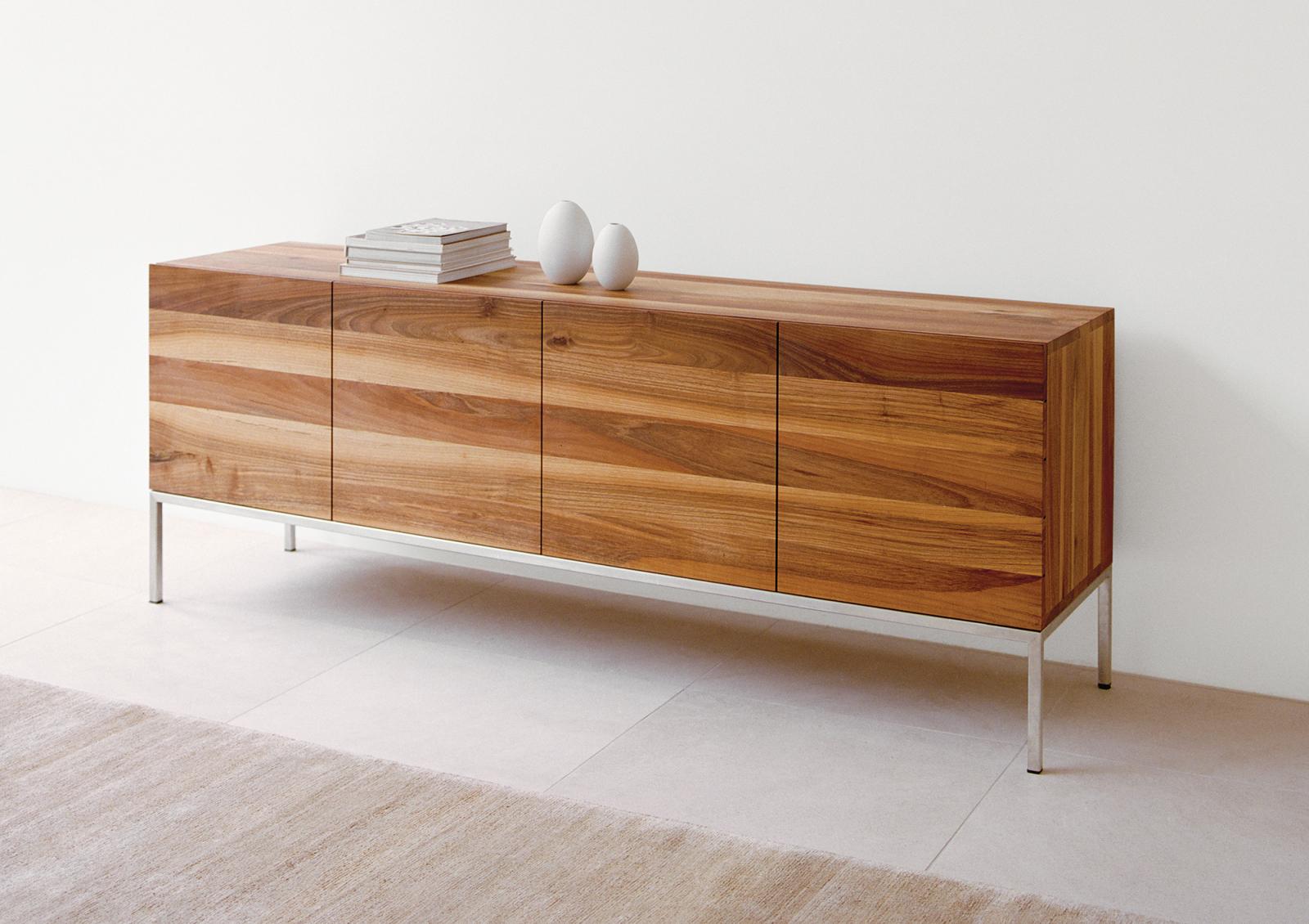 The sideboard FARAH is a refined storage solution. The horizontal display of the solid wood grain makes each sideboard unique and elegantly highlights the combination of solid wood and a seamless stainless steel frame. Aluminium strips inserted inside the door panels ensure further stability, enabling a solid wooden front structure without a visible supporting frame. The frame is also available in powder-coated steel.