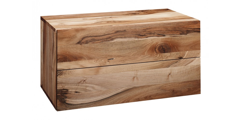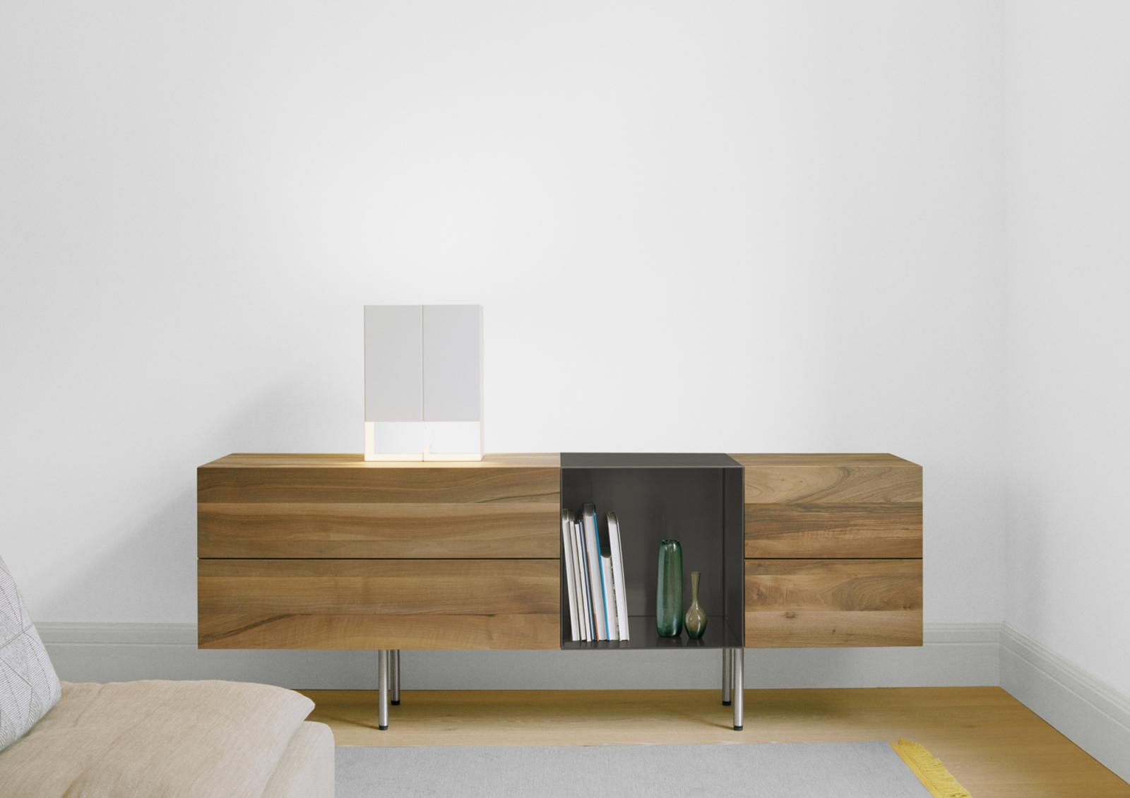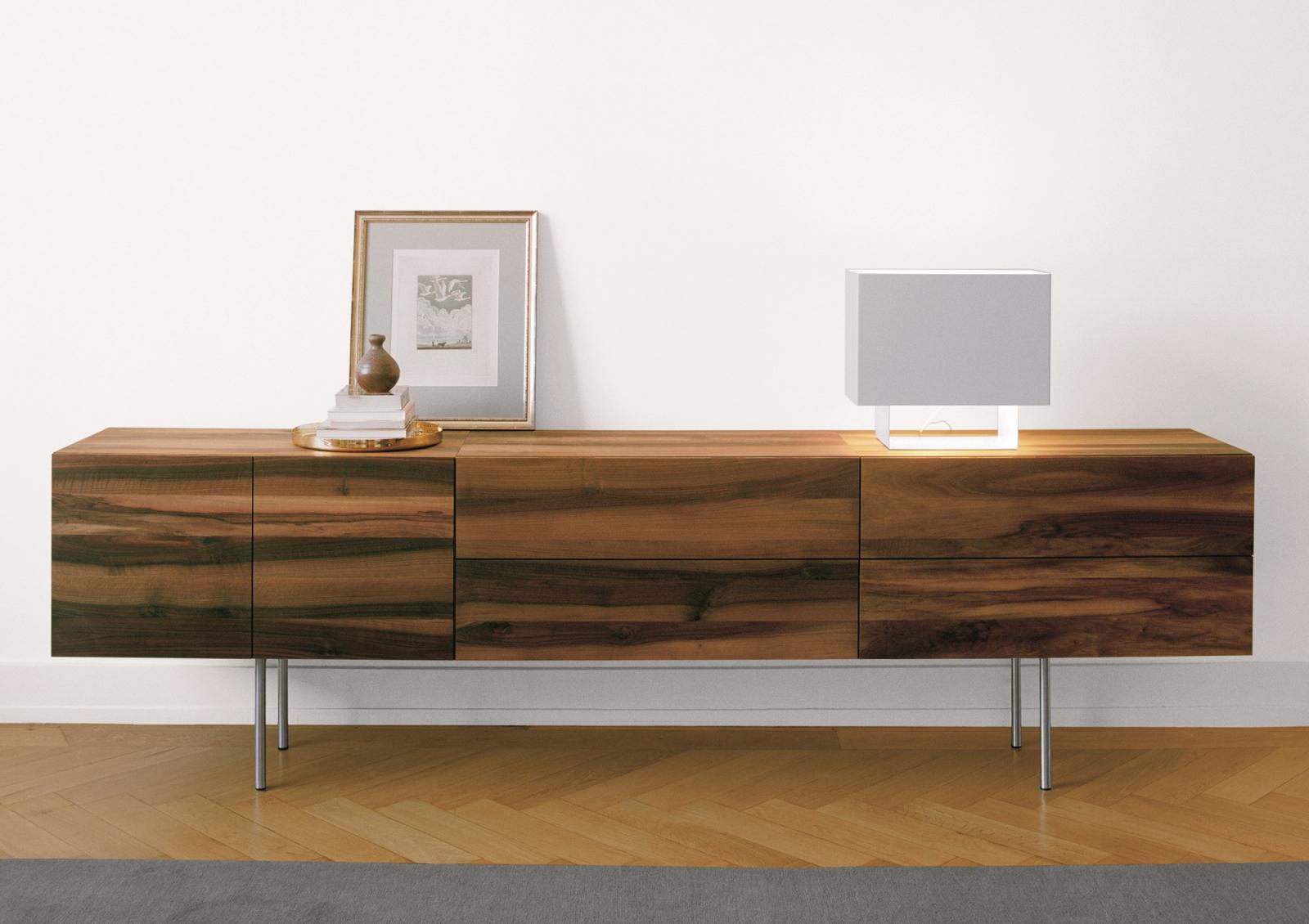 Chest of drawers MAHNAZ is the wall-mounted adaption of the sideboard FATIMA. Even its body is made of solid wood, the sideboard floats effortlessly. The clear design of MAHNAZ benefits from a concept that eliminates visible frames and excludes all unnecessary and obtrusive elements. MAHNAZ can be combined the bar cabinet ARAQ and open shelf DARA.