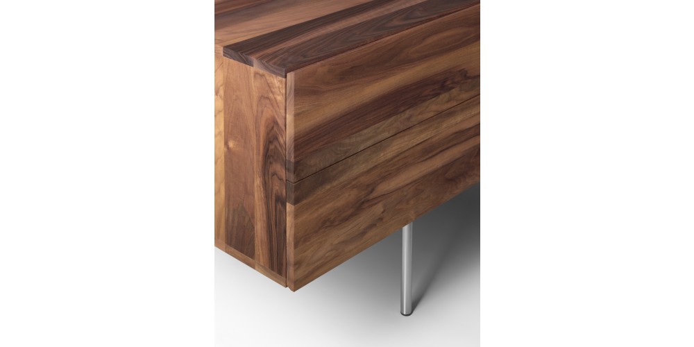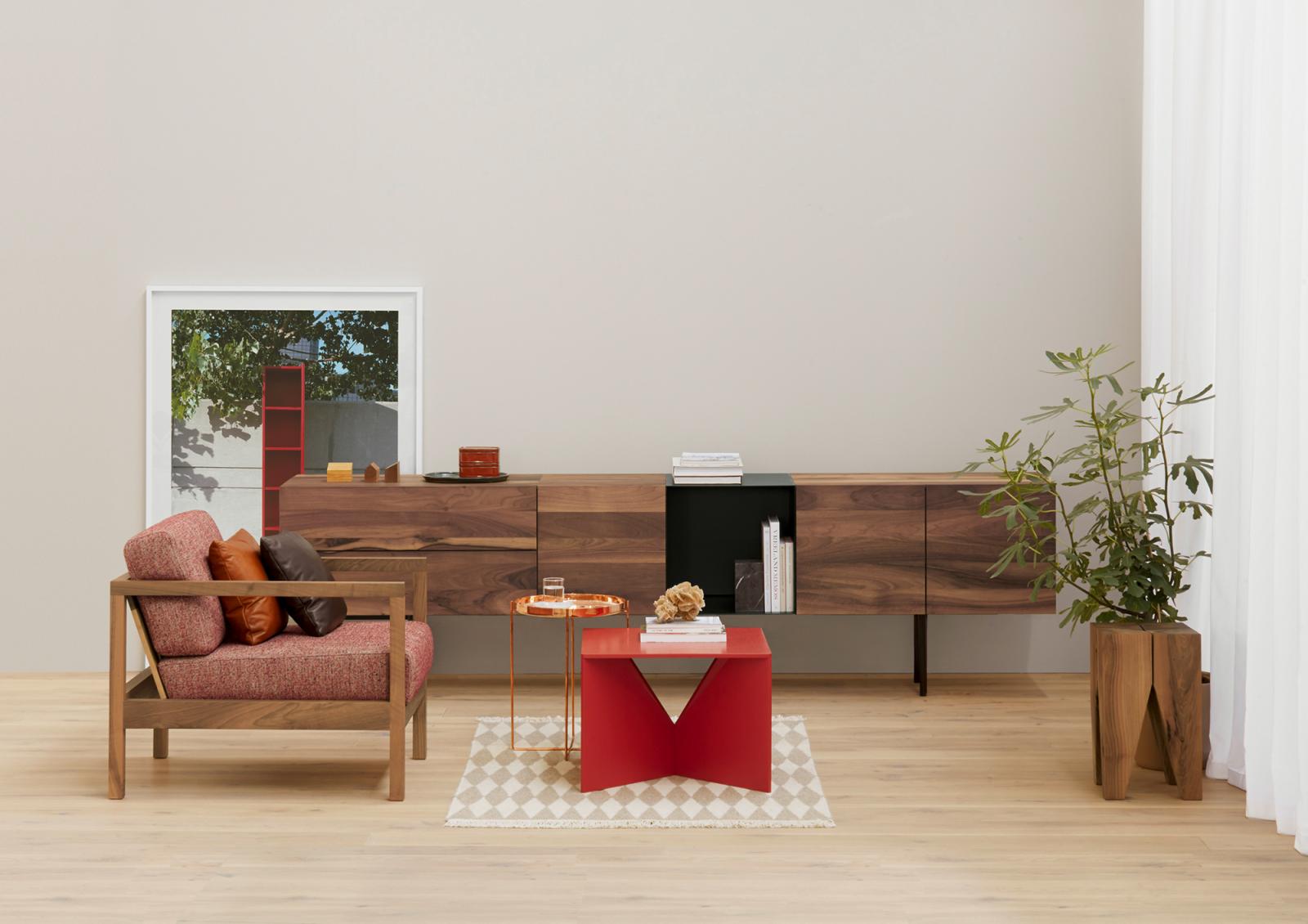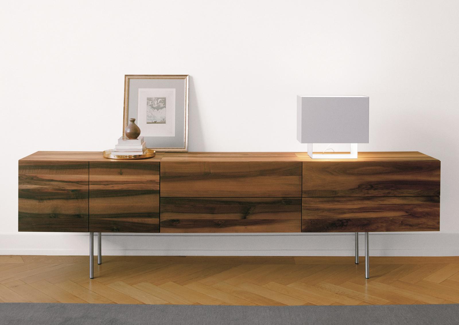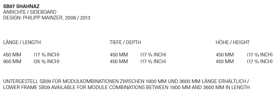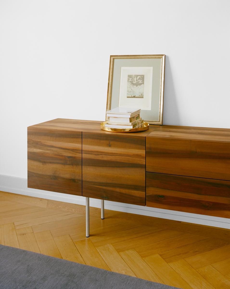 The modular, wall-mounted sideboard SHAHNAZ appears light and elegant. The visual buoyancy is achieved with an intricate construction without visible frames. SHANHNAZ is modularly combinable with chest of drawers MAHNAZ, bar cabinet ARAQ and open shelf DARA.