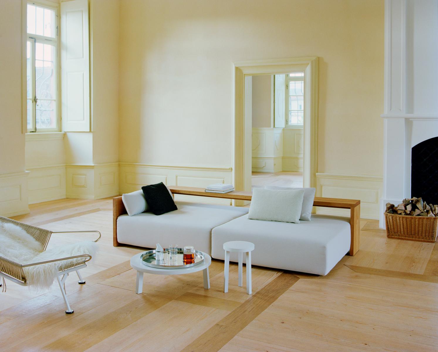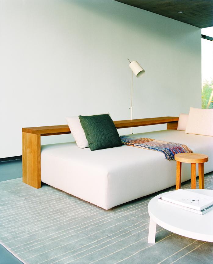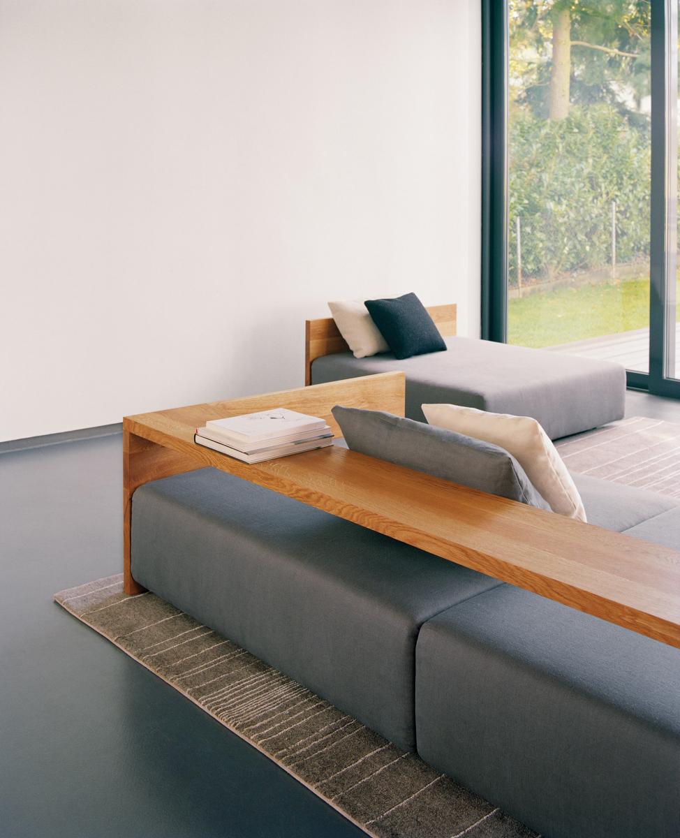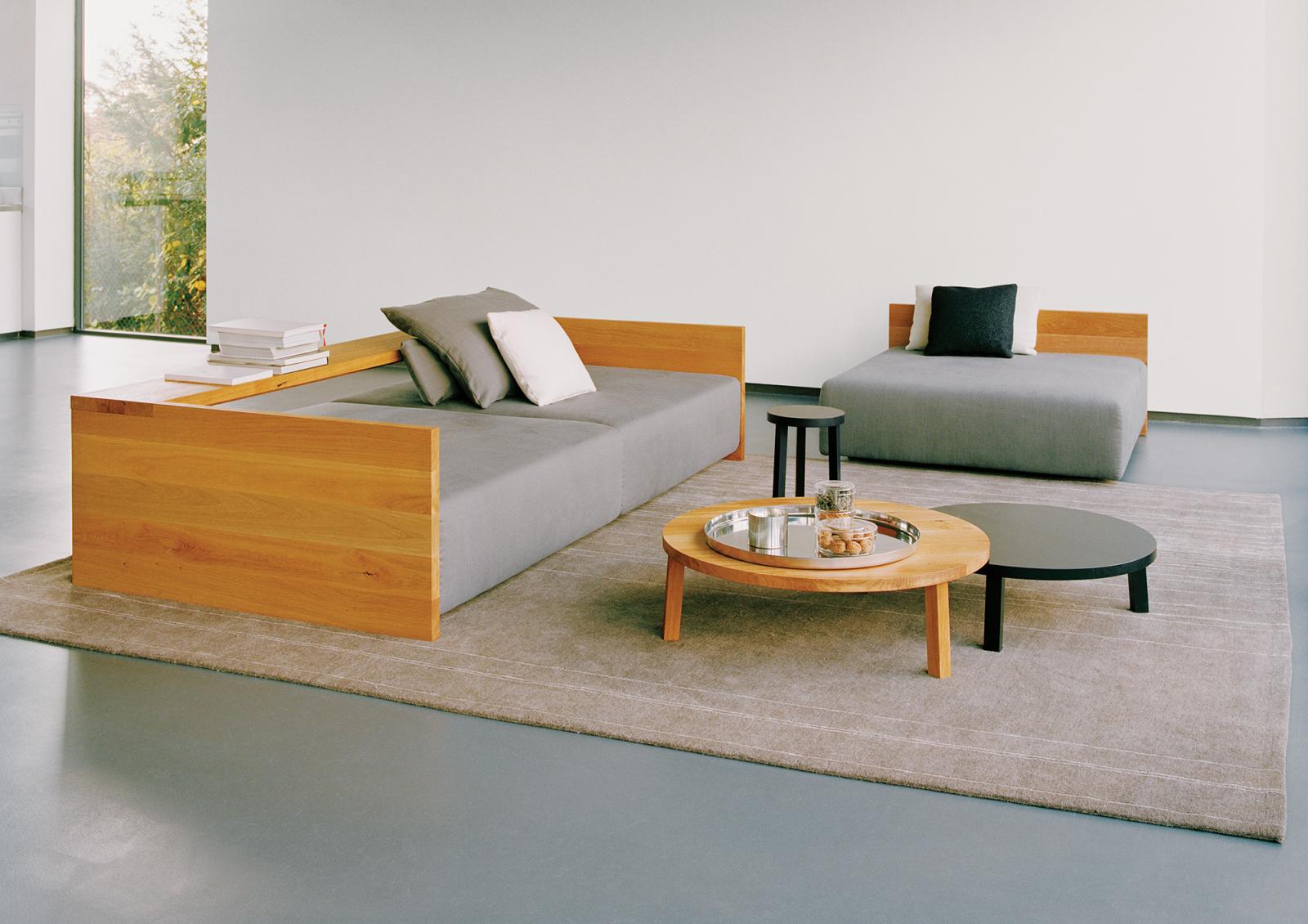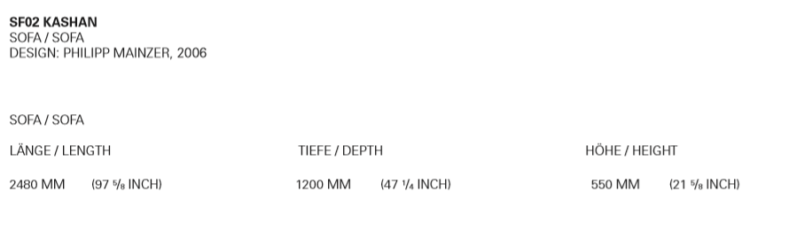 In its form and material, the KASHAN sofa epitomizes the logical continuation of e15 design. The 550 MM (21 5/8 INCH) tall backrest is notched to the equally tall side frames, underscoring the contrast of the cross grain and the end grain where the two intersect. The seating height is 350 MM (13 3/4 INCH). Removable fabric covers are available in different textures and colours. Six pre-selected fabric combinations, as well as sample fabrics for individual selections are available from e15 upon request.
