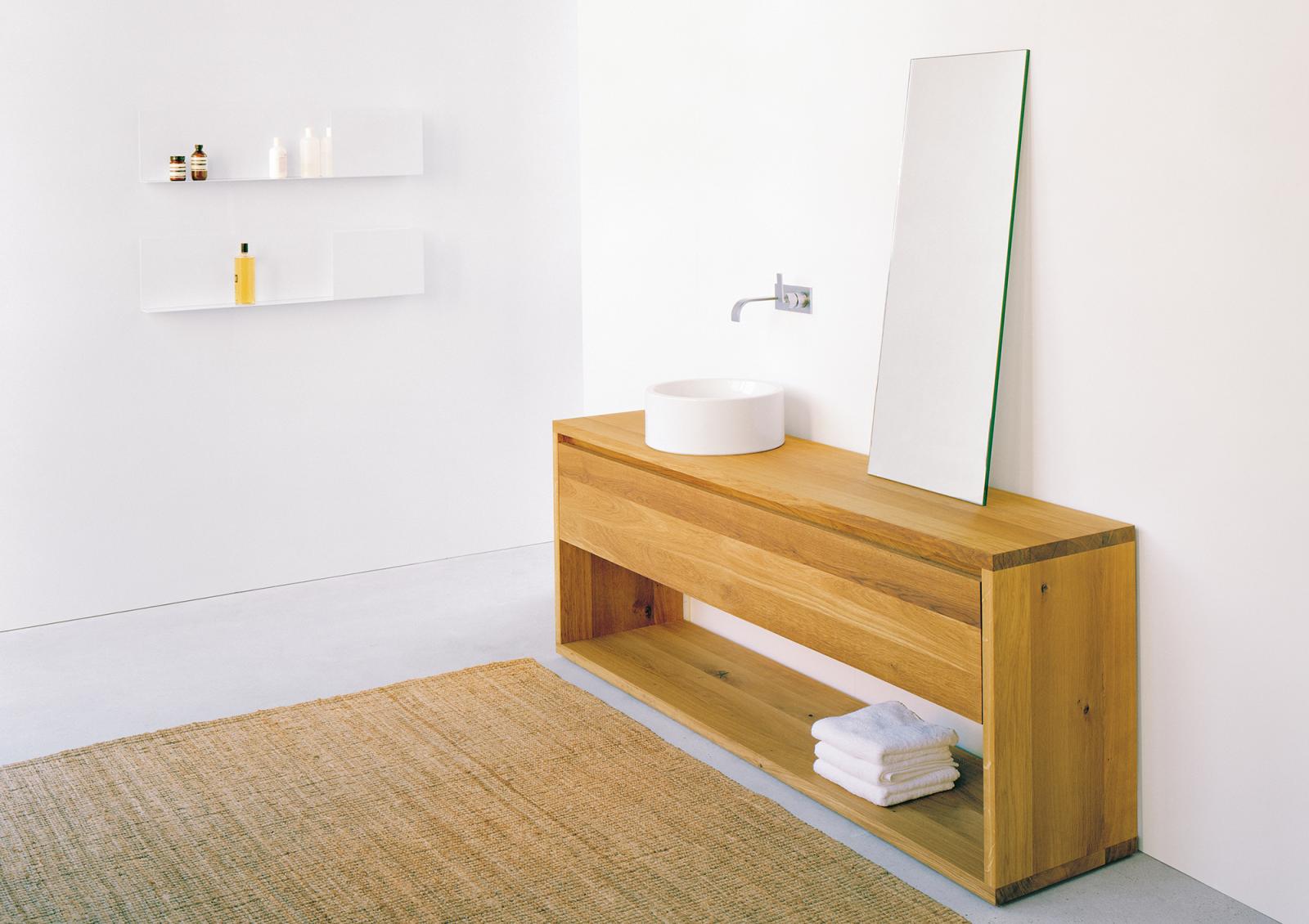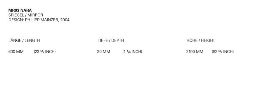 This mirror is placed on the floor and simply leans against a wall. There is an eyelet on the rear enabling it to be secured with a wall in place. The mirror is framed with a 3 MM (1/8 INCH) thick stainless steel edge that finishes flush with the mirror at the front. The NARA mirror is 30 MM (1 1/8 INCH) thick.