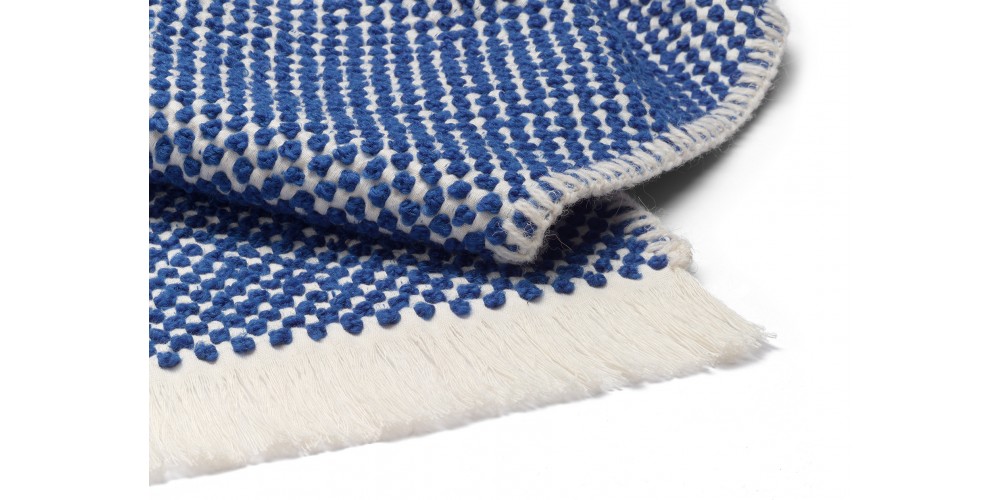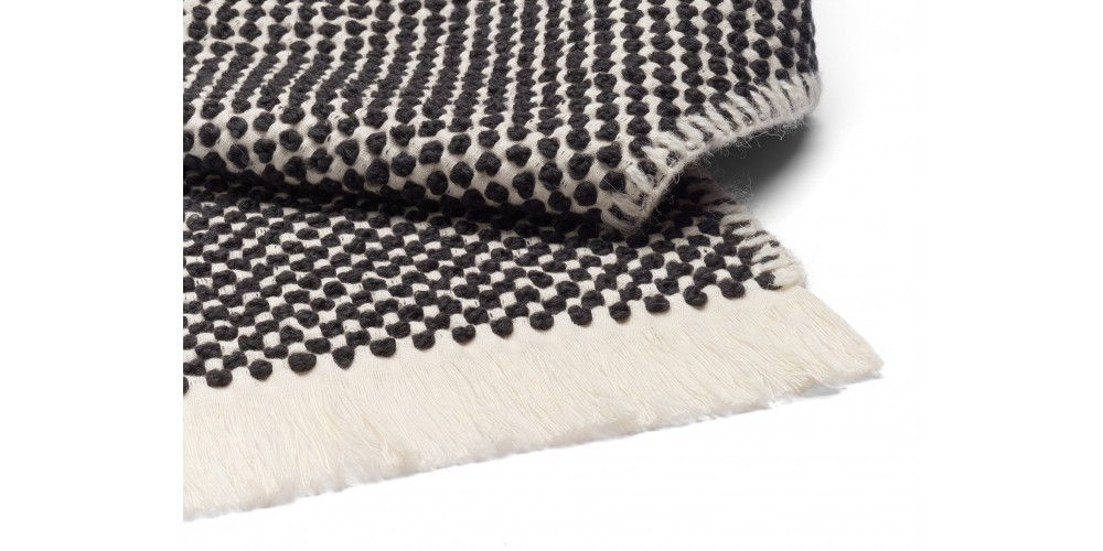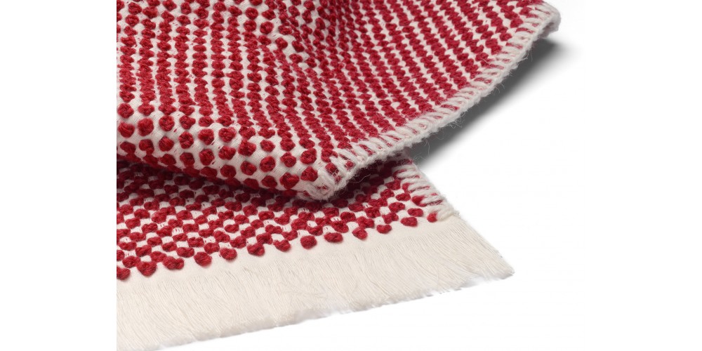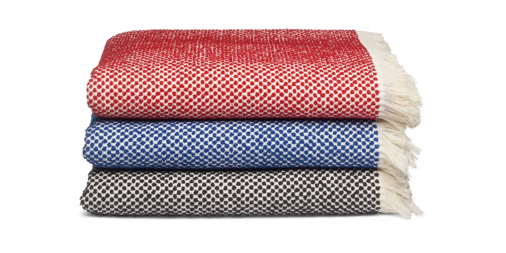 DOTTO is a playful blanket available in three rich colours. Spun atop an ivory cotton base, the dots are made from deep red, blue or black wool yarn creating a three dimensional dot pattern and intriguing surface feel, which is identical on both sides of the blanket. Made in Belgium, DOTTO is a distinct blanket suitable for all seasons.