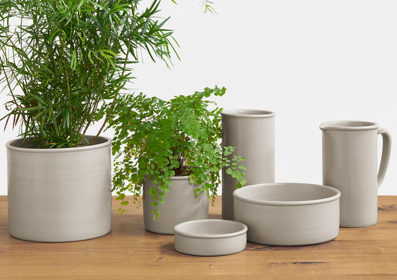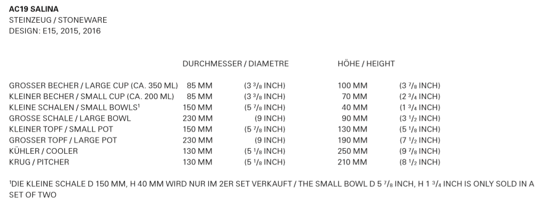 Inspired by traditional pottery from the Frankfurt region, stoneware series SALINA combines modern design with handcrafted production methods. Reduced to the essentials, the cylindrical forms elegantly highlight the beauty of the material, which develops a unique texture through the treatment with salt. Each piece is handmade in a small workshop in the Southwest of Germany and carries the signature of the potter as well as an e15 logo at the bottom. The SALINA series consists of six impermeable forms open to individual usage.