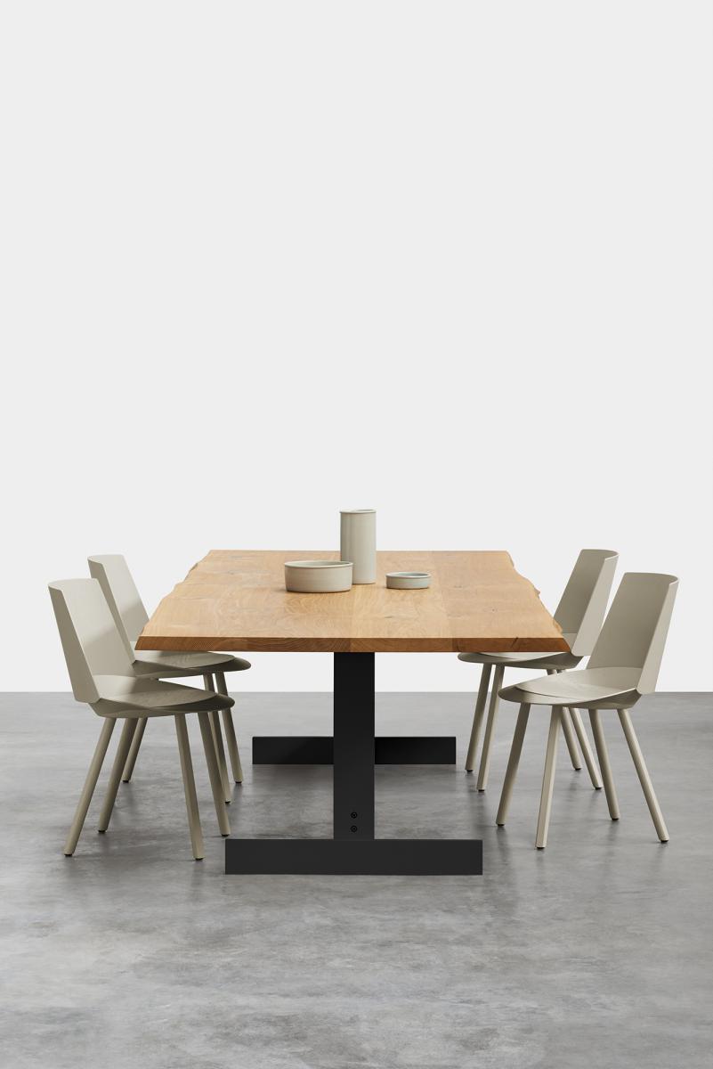 Inspired by Suprematist compositions, table KAZIMIR by Philipp Mainzer features a bold mix of geometric forms and materials. Focussing on a distinct construction, the tabletop made from solid European oak or walnut rests on a metal centre base, allowing for various interpretations in private and public spaces. Available in a range of standard and custom colours as well as exclusive materials such as galvanised zinc, blackened steel and brushed brass, the frame features a characteristic refectory table construction, which provides stability for tables up to 3600 MM (141 34 INCH) and generous seating at the table ends. KAZIMIR RAW features solid wood boards with a width of up to 250 MM (9 78 INCH) exposing the brushed natural edges of the tree.