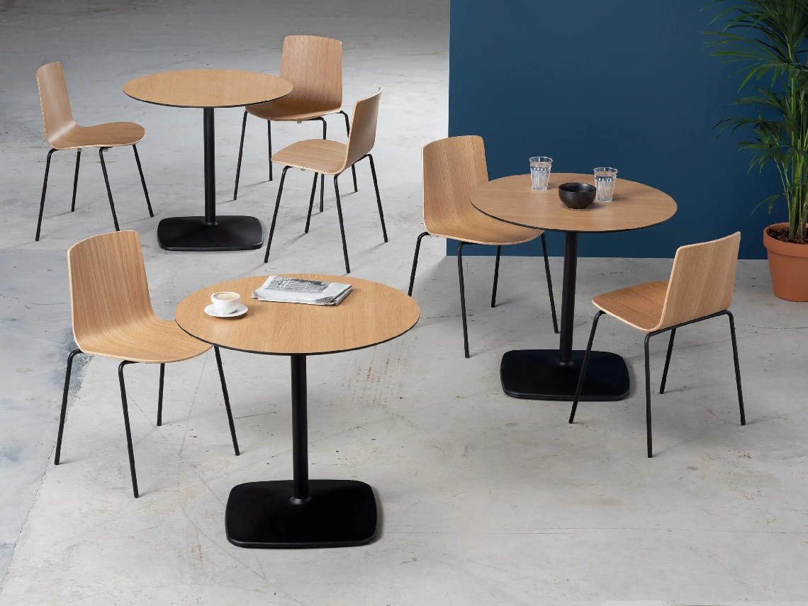 Iron table has a steel structure lacquered in any of our colours that provides absolute stability. Having variable heights, different finishes and table top shapes, it is perfect for cafes, bars, restaurants and hotels, though it is also adequate for more corporate environments.