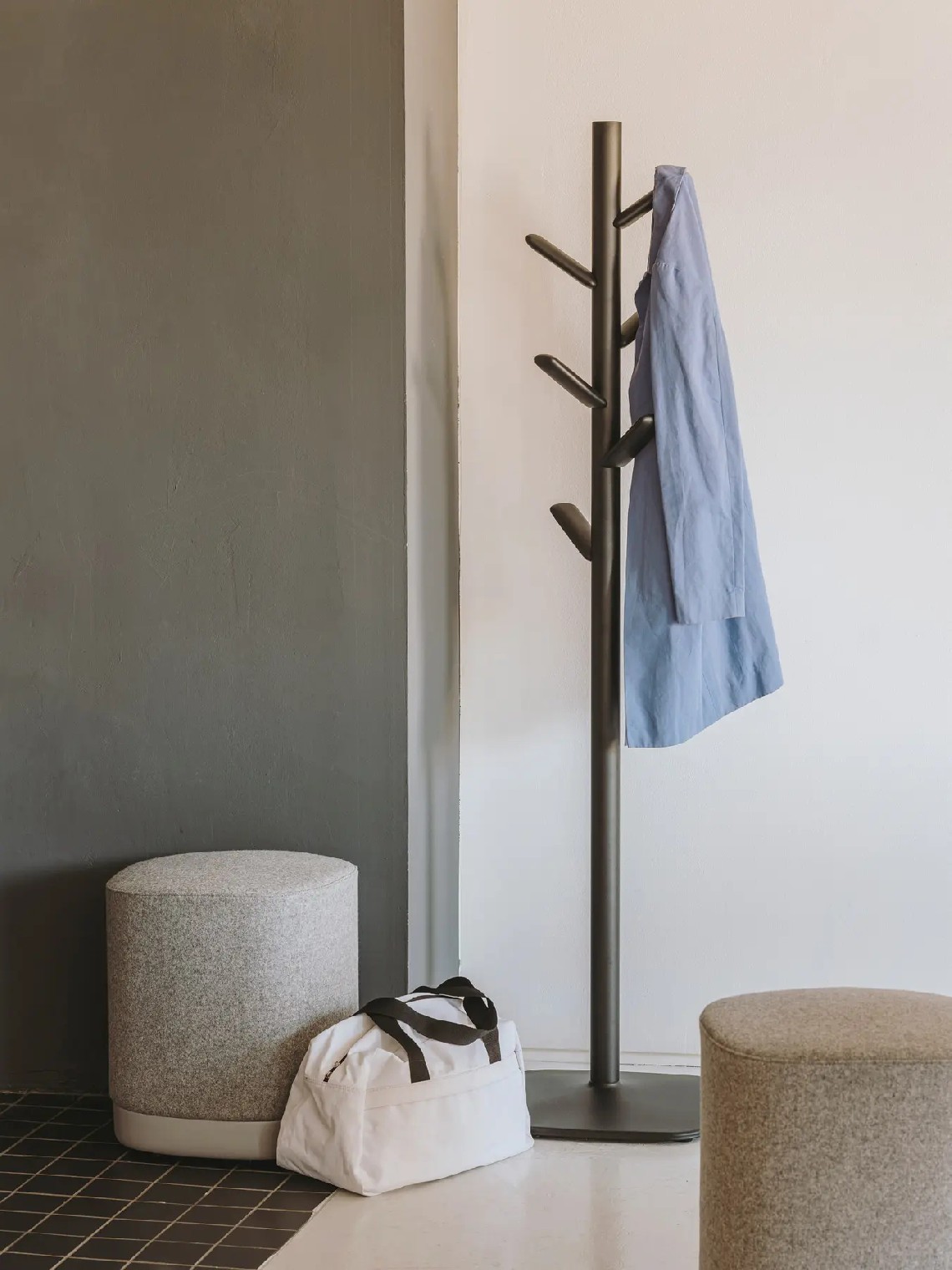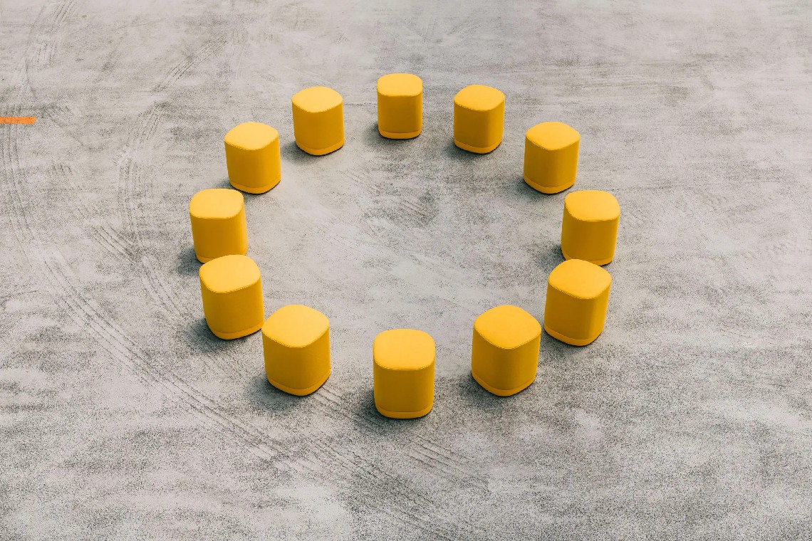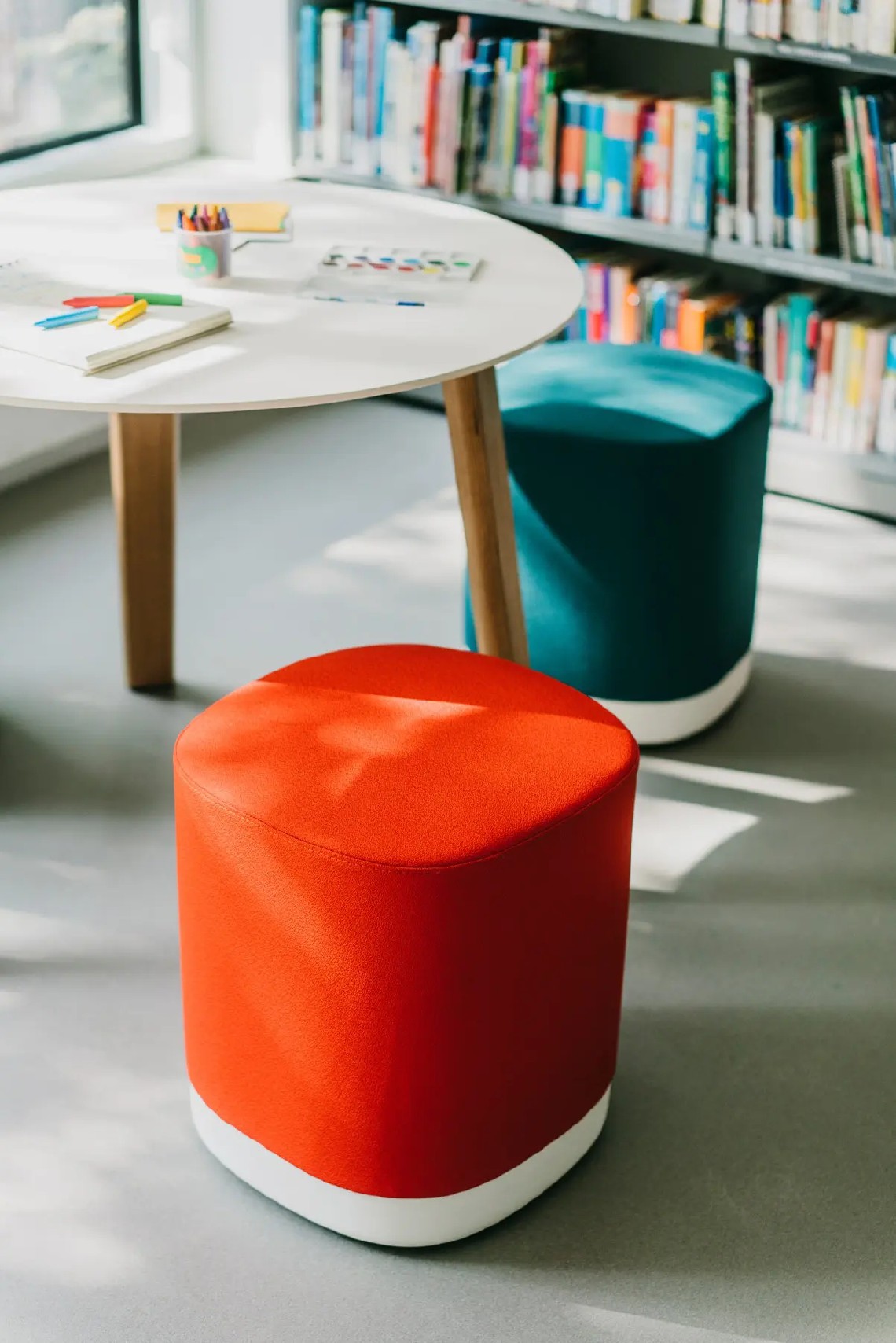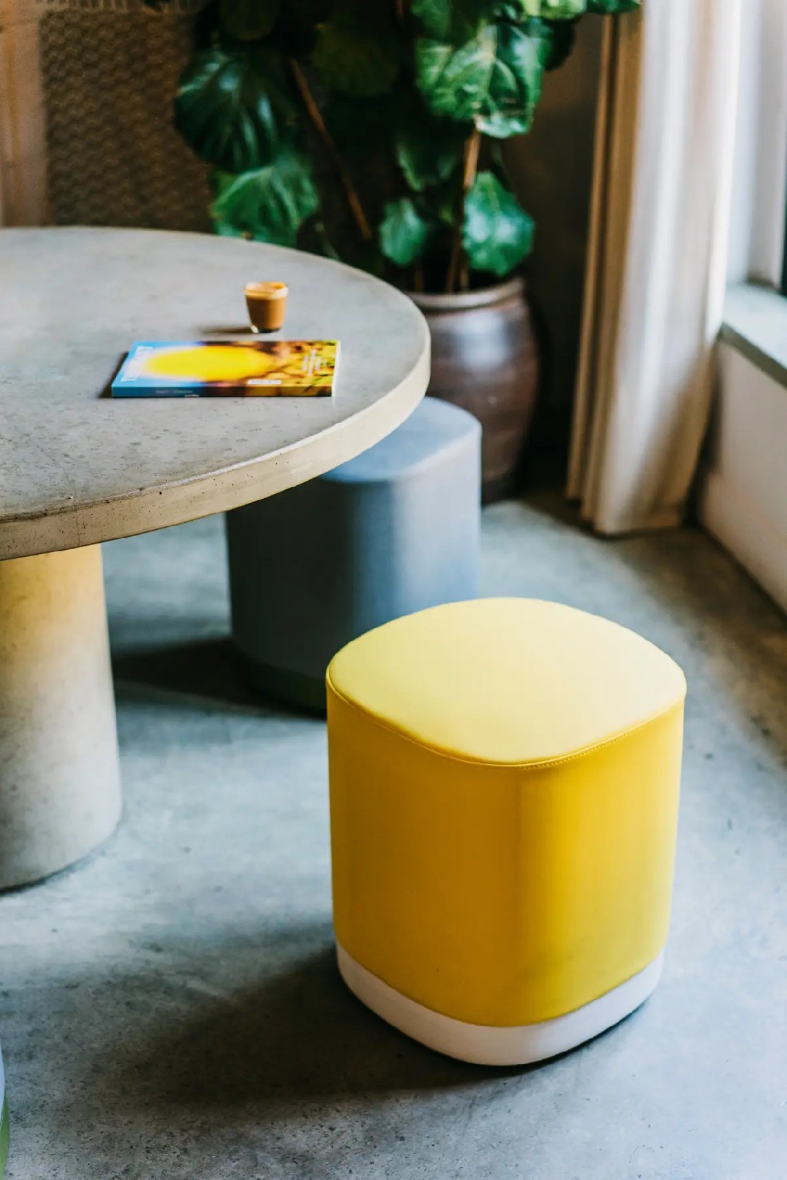 The Puck pouf has an aluminium base lacquered in any of our colours and with or without castors. The seat can be upholstered in one or two fabrics and that is the reason why it is possible to combine one, two or three tones in the same pouf.
