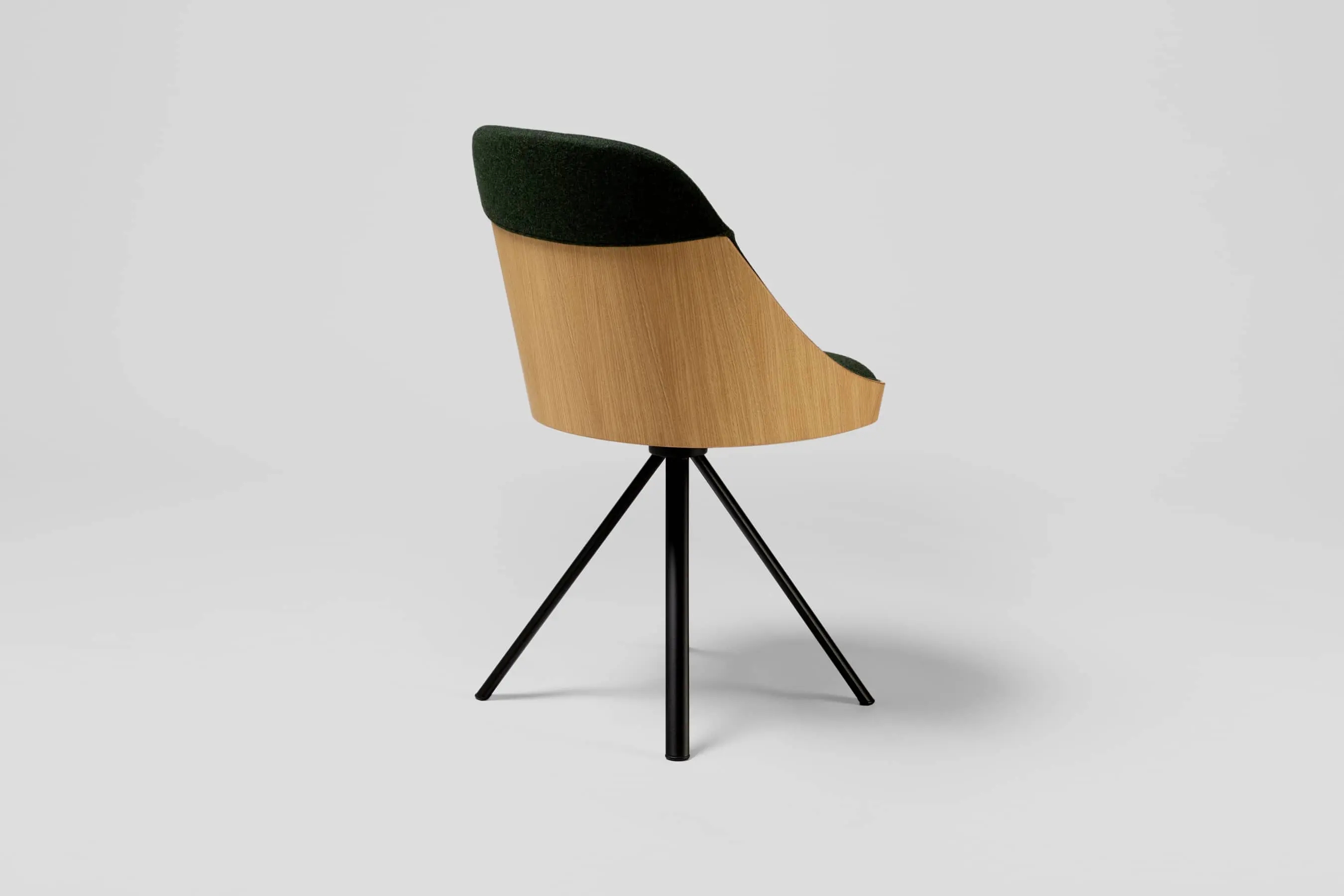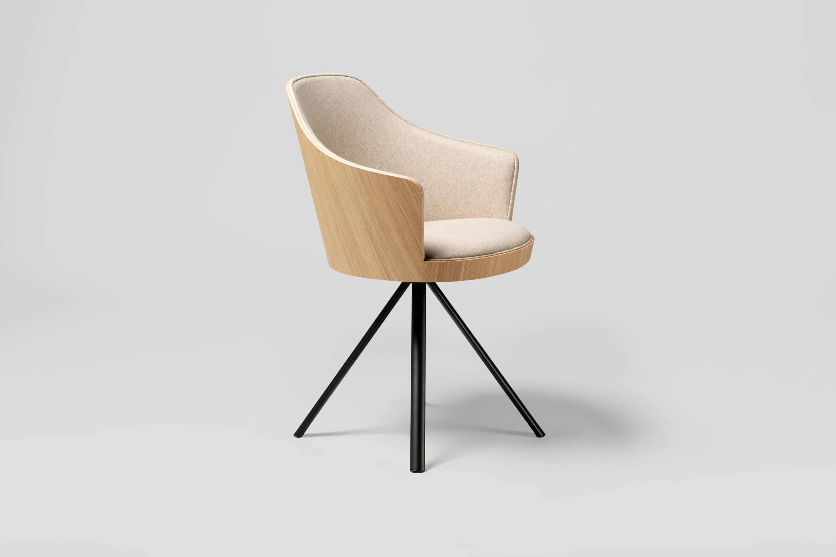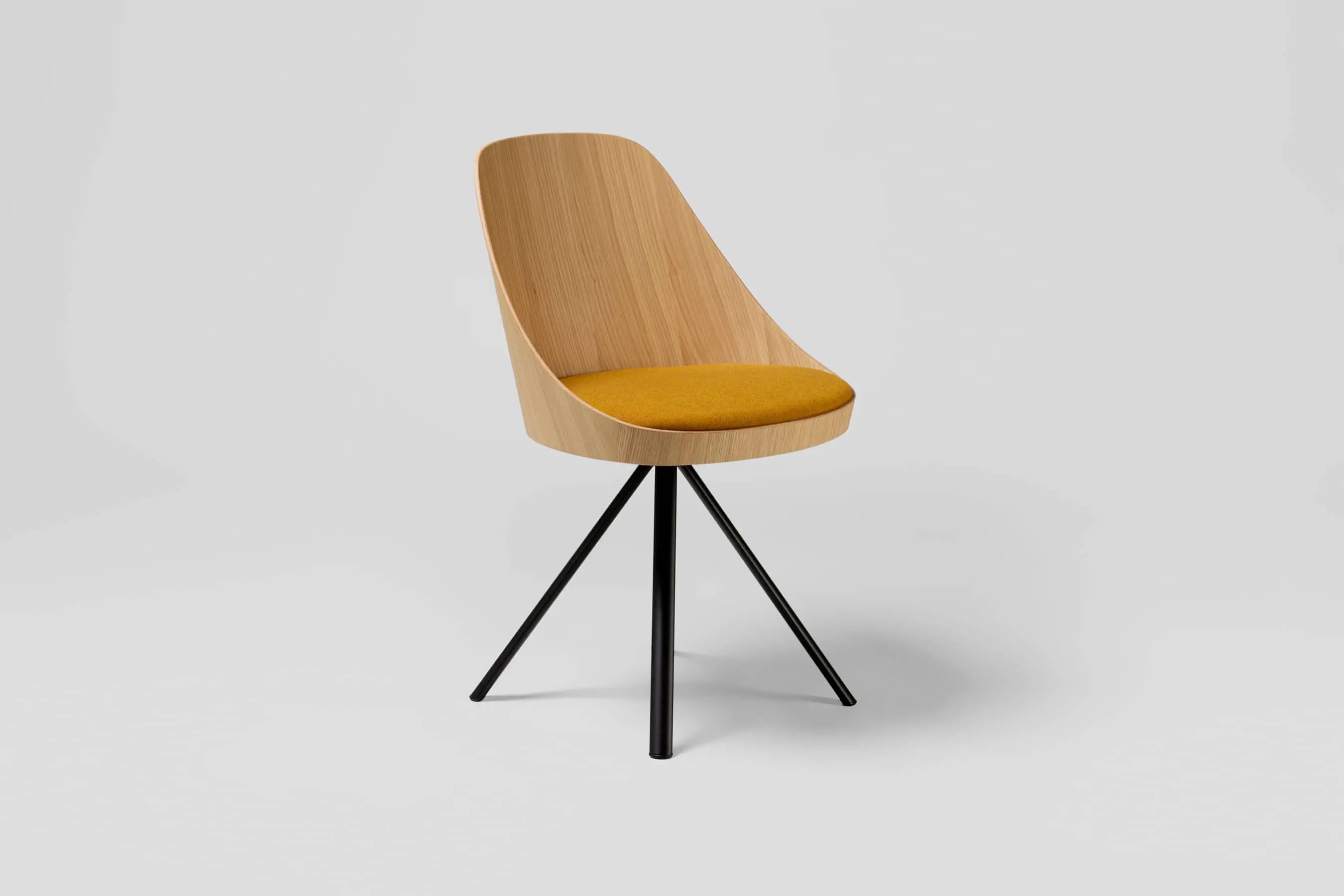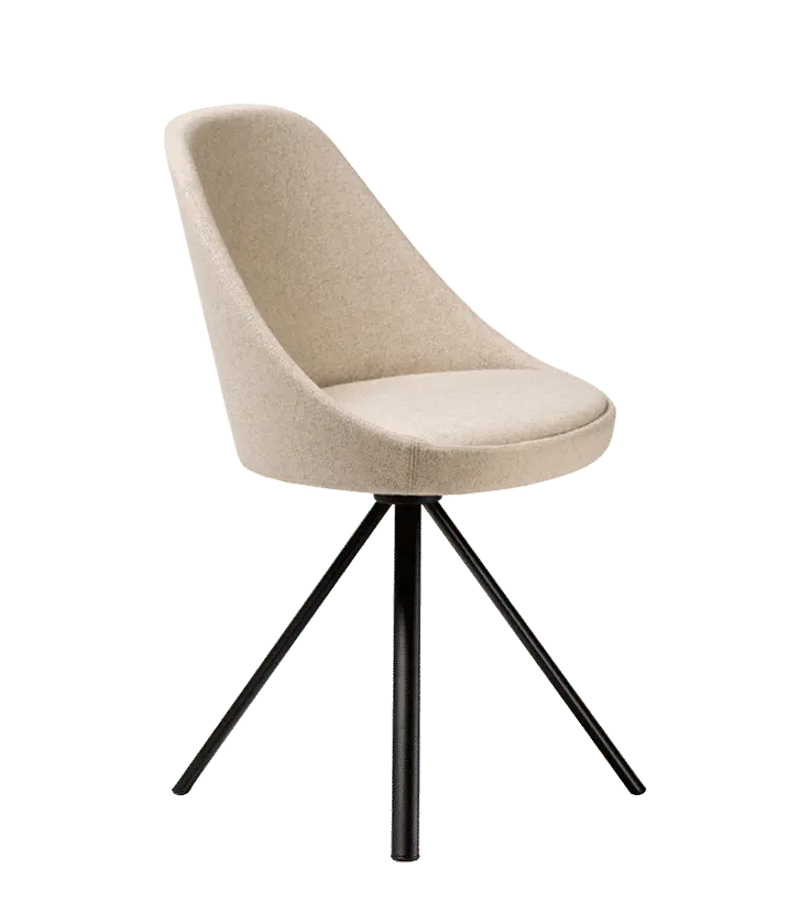 The shell of Kaiak spin chair is made of natural or stained oak wood and it has a broad range of upholstery options available: fully upholstered, upholstered seat, three quarters upholstered and inside upholstery. Thanks to its 4-legged lacquered steel structure, the chair can be swivel or fixed.