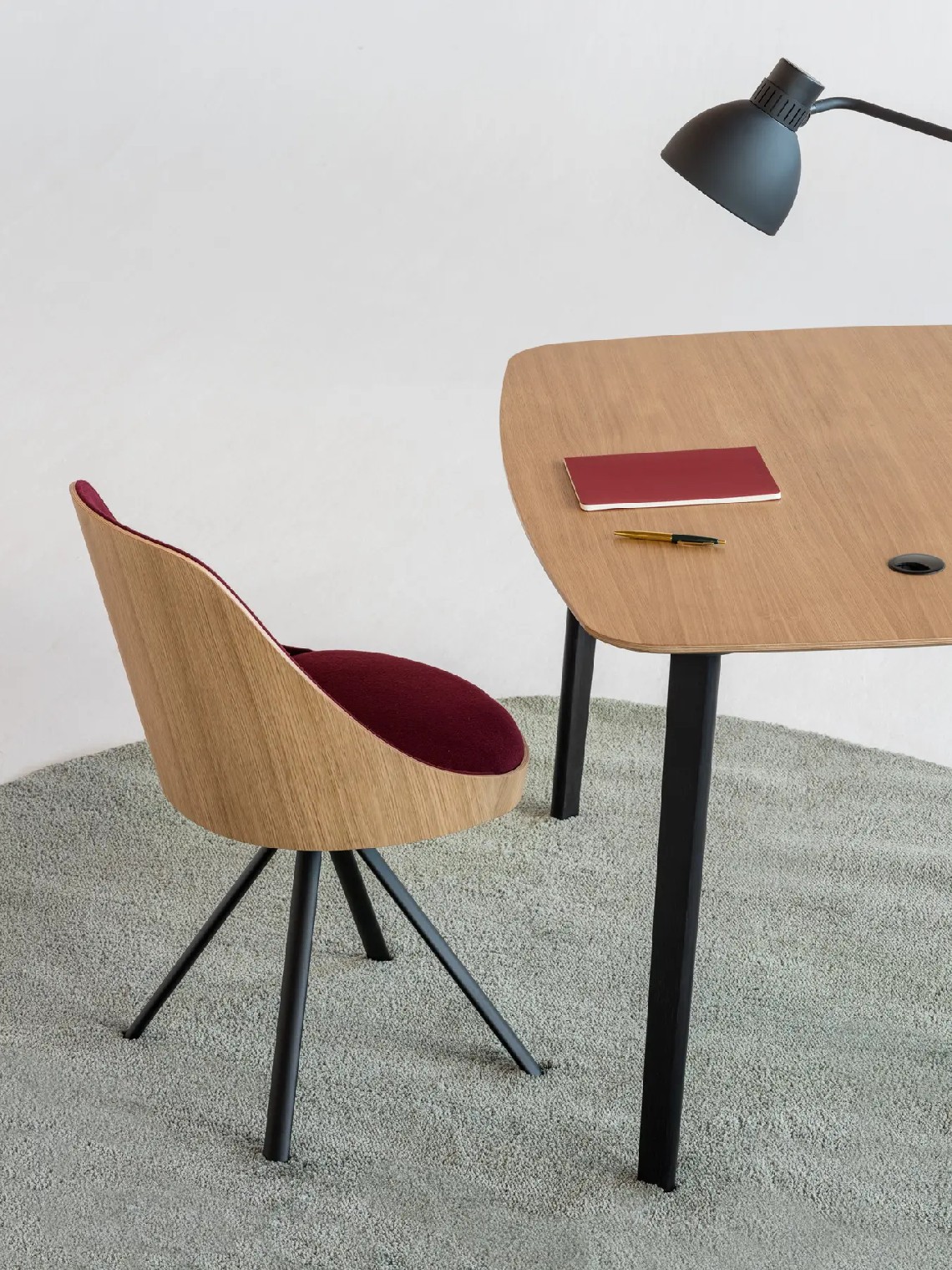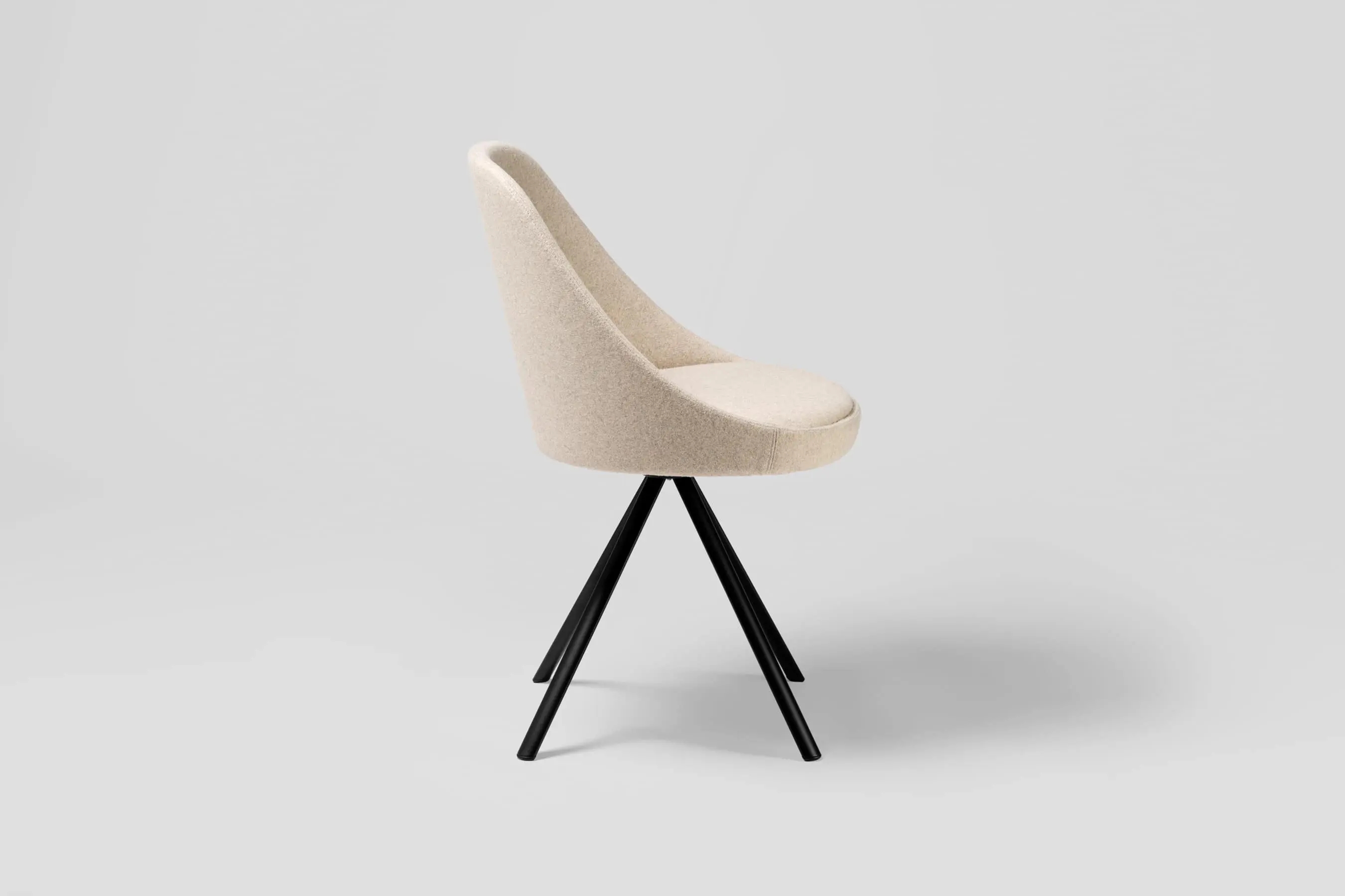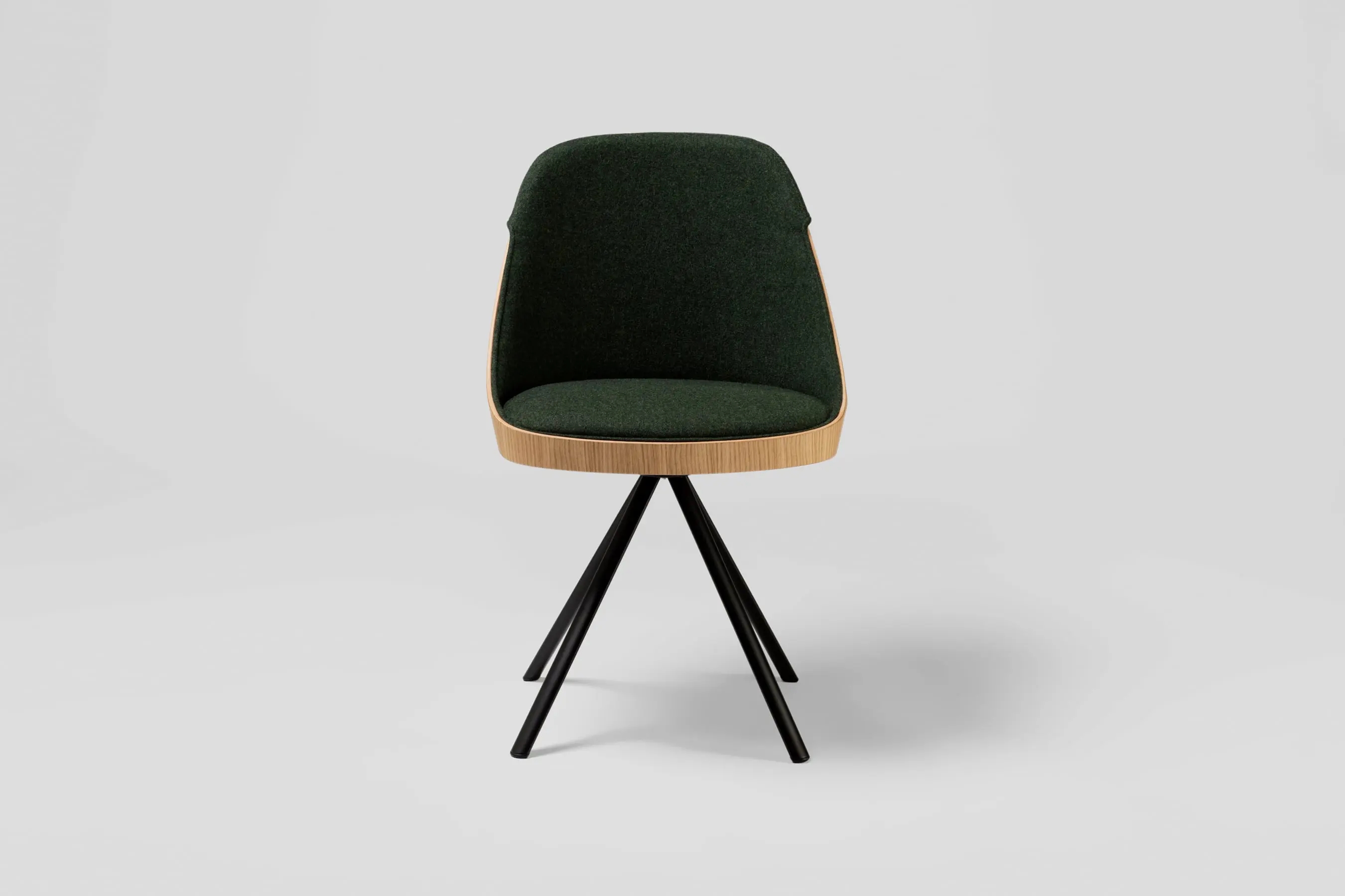 The shell of Kaiak spin chair is made of natural or stained oak wood and it has a broad range of upholstery options available: fully upholstered, upholstered seat, three quarters upholstered and inside upholstery. Thanks to its 4-legged lacquered steel structure, the chair can be swivel or fixed.