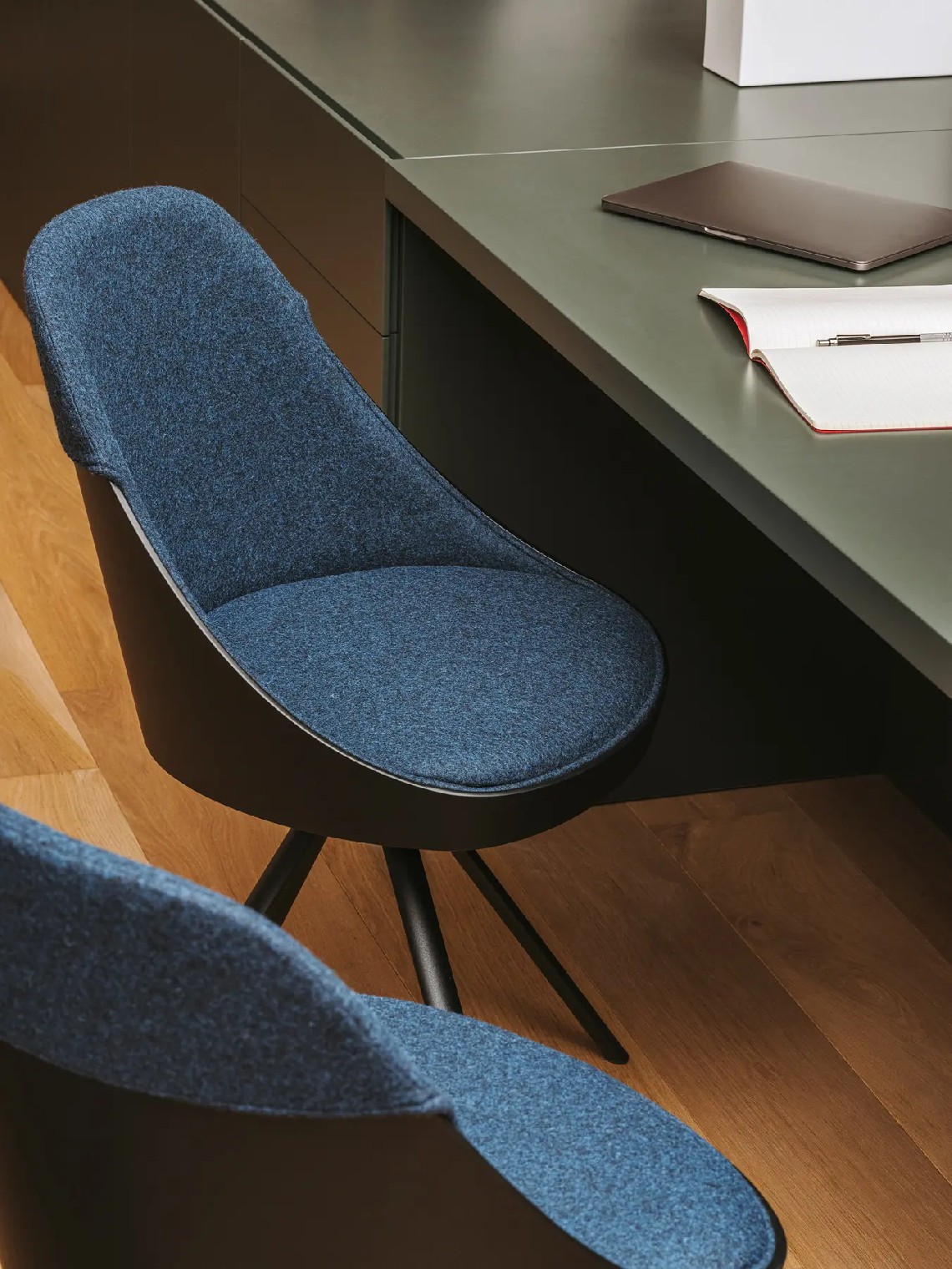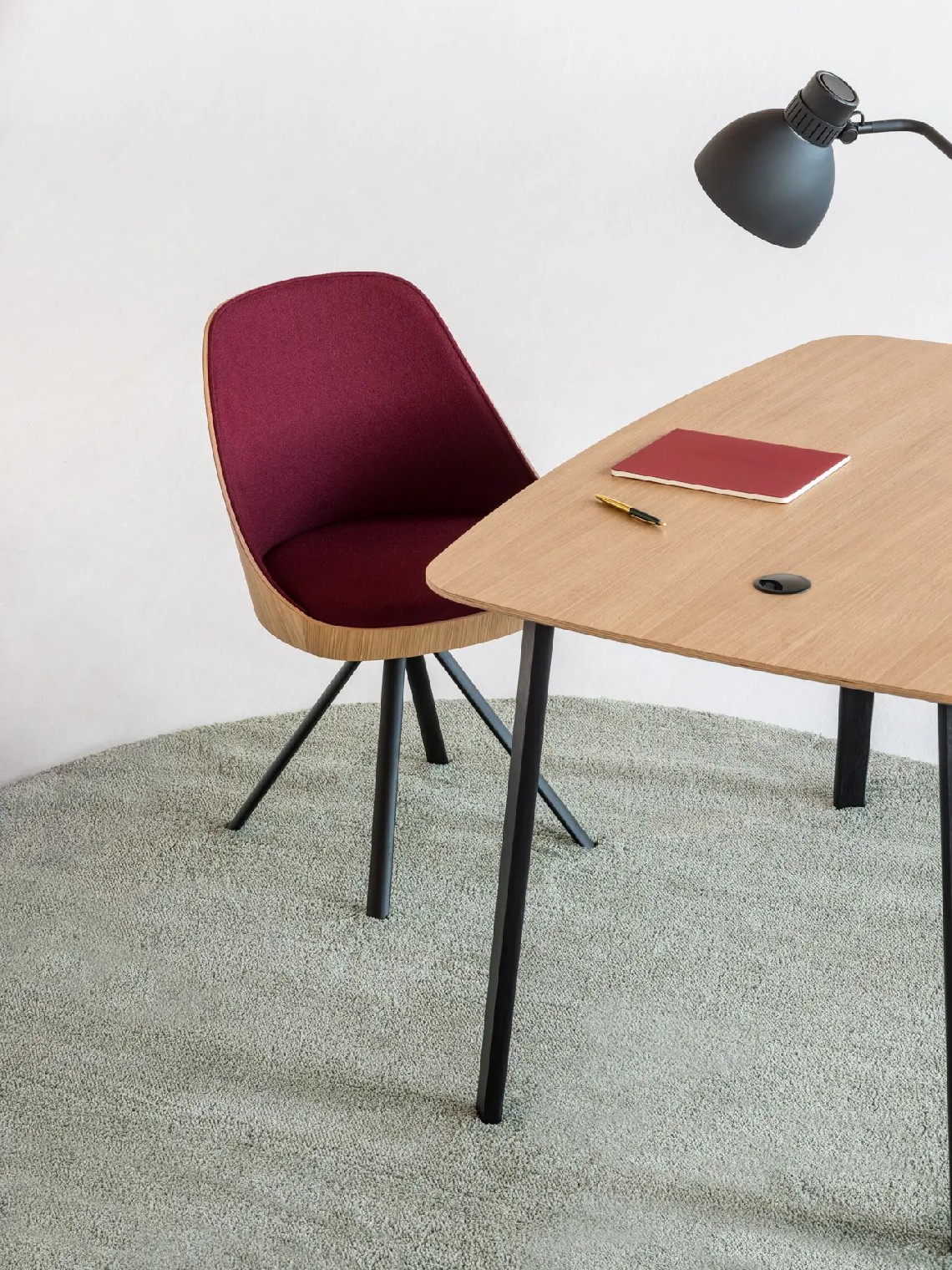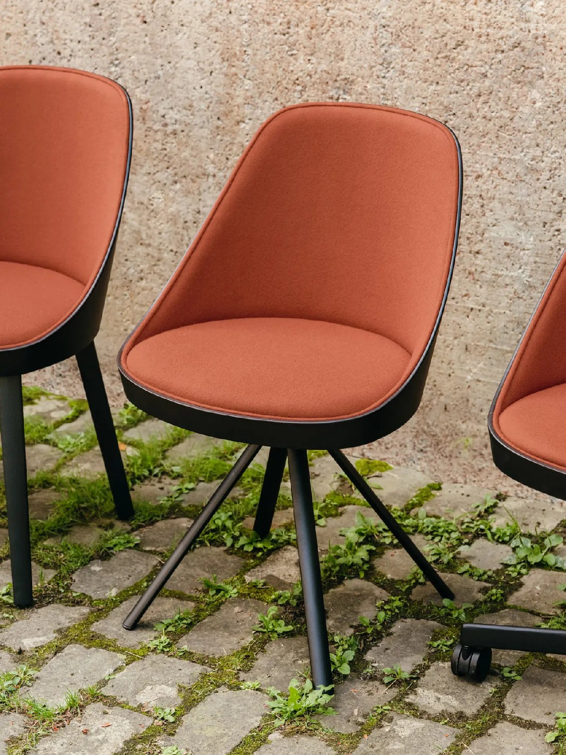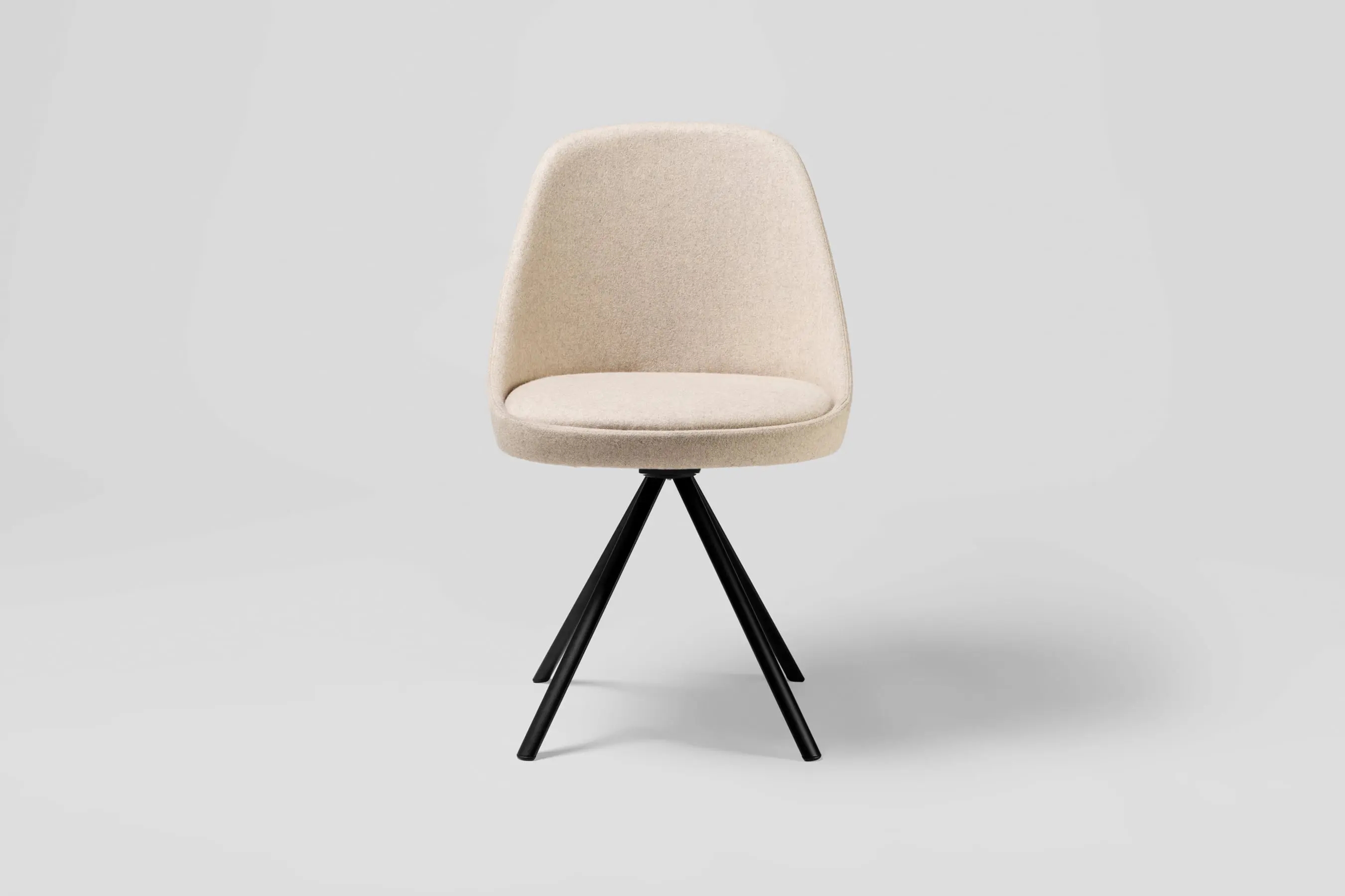 The shell of Kaiak spin chair is made of natural or stained oak wood and it has a broad range of upholstery options available: fully upholstered, upholstered seat, three quarters upholstered and inside upholstery. Thanks to its 4-legged lacquered steel structure, the chair can be swivel or fixed.