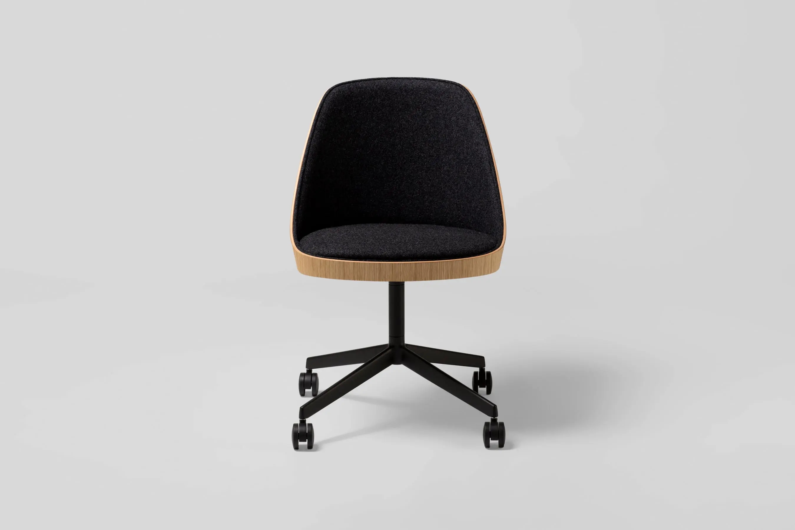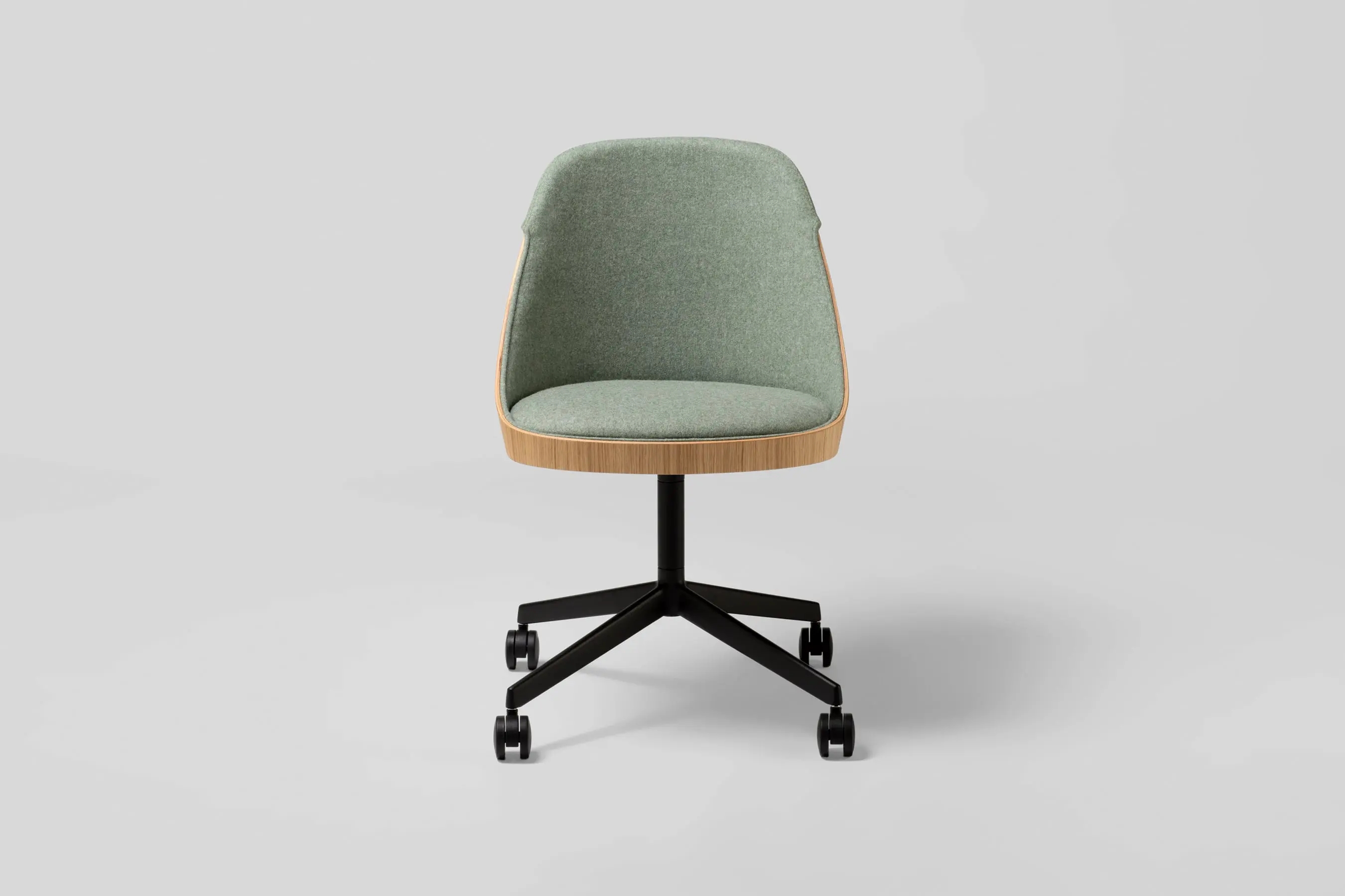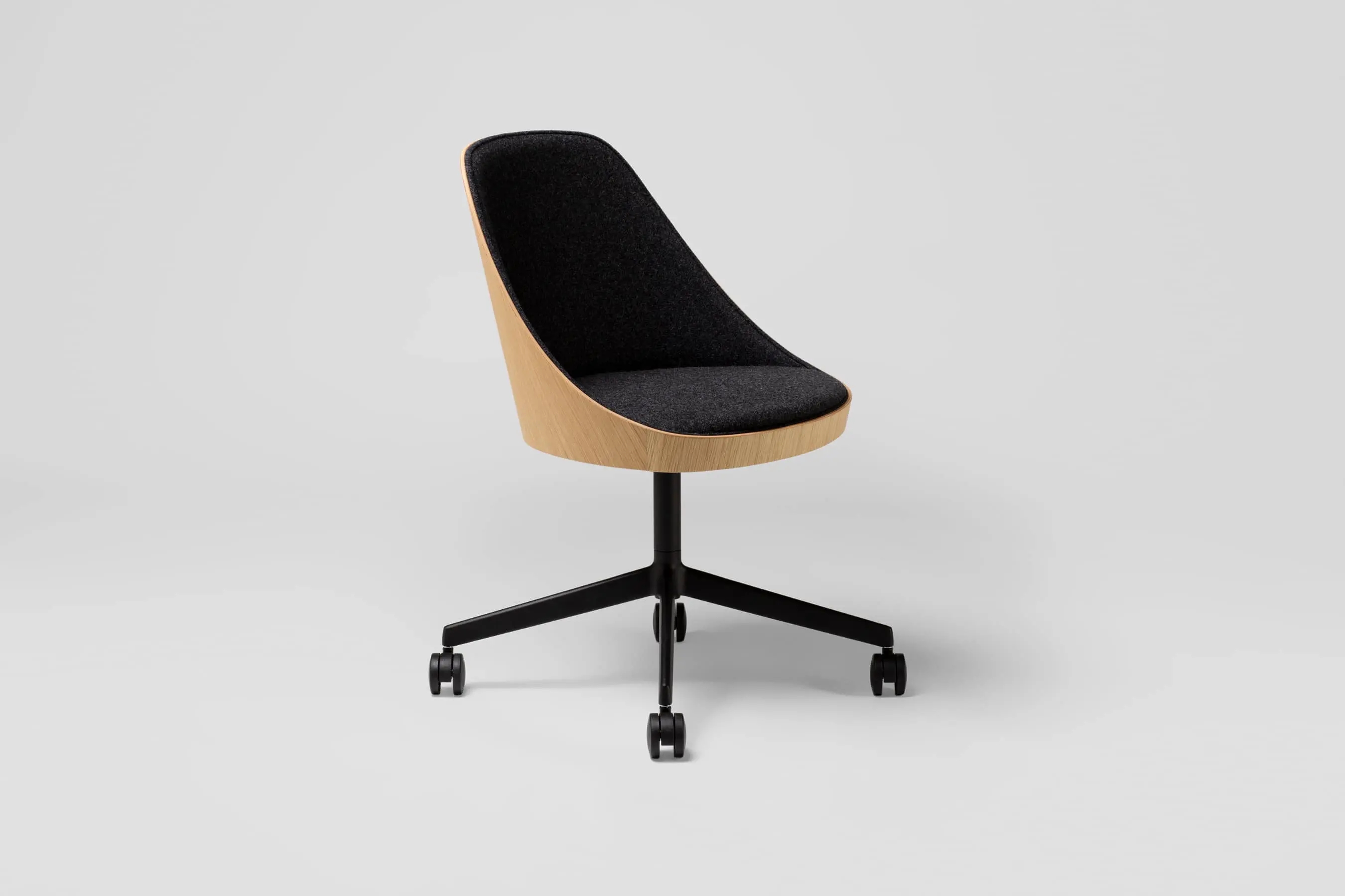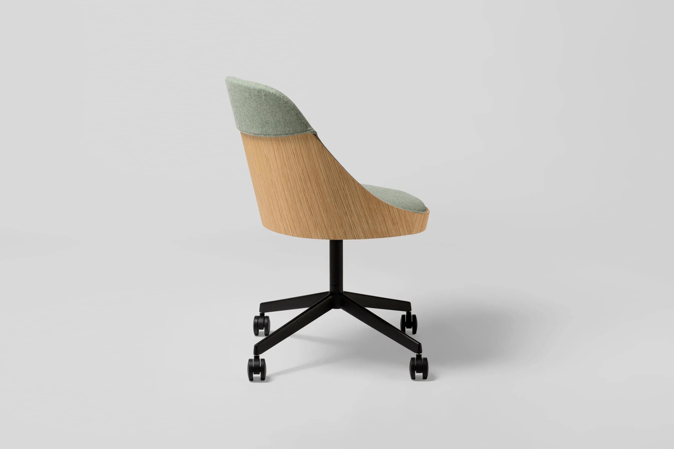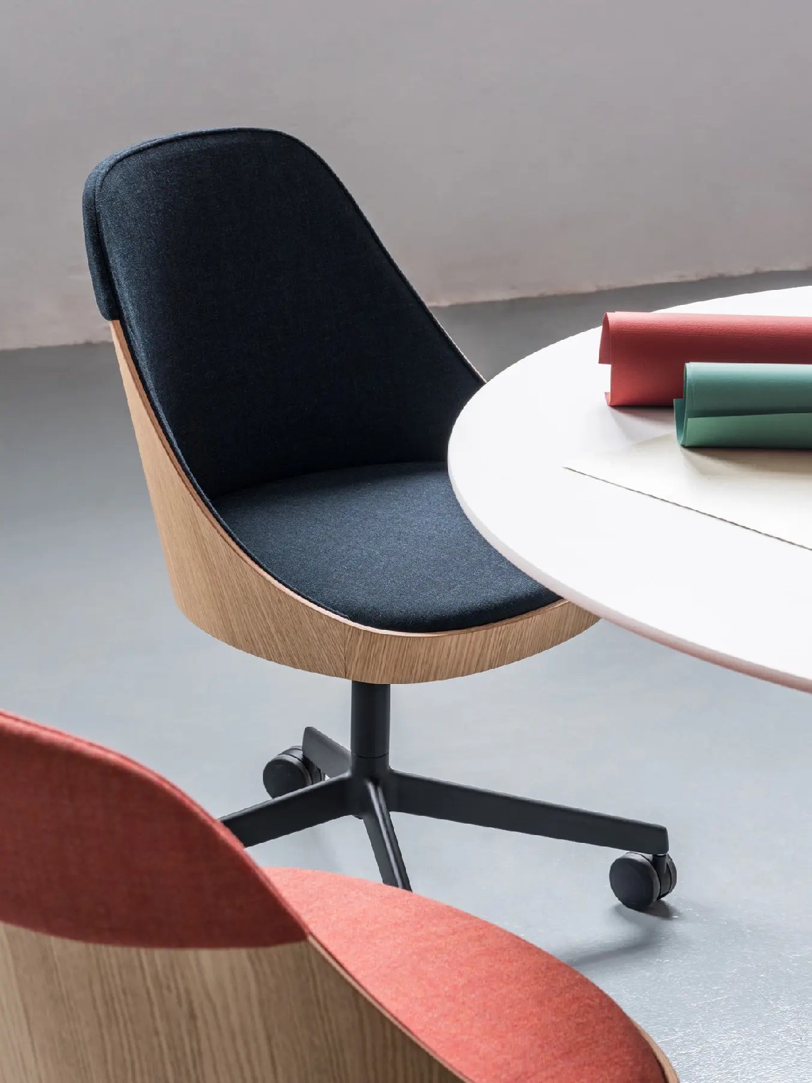 The shell of Kaiak confident chair with castors, available with or without arms, is made of natural or stained oak wood and has a broad range of upholstery options available: fully upholstered, upholstered seat, three quarters upholstered and inside upholstery. Its 4-star base is fixed due to the castors and can be lacquered in any of our colours.