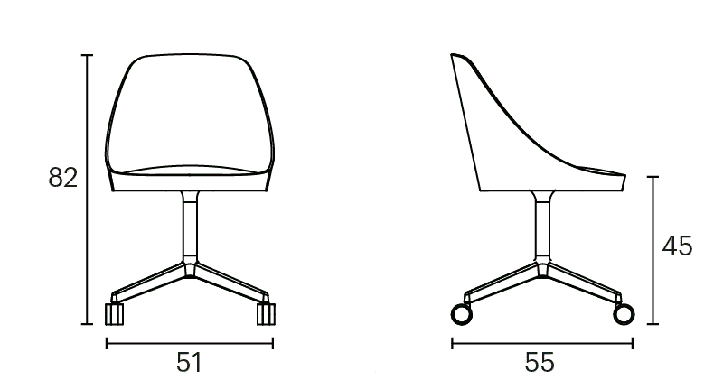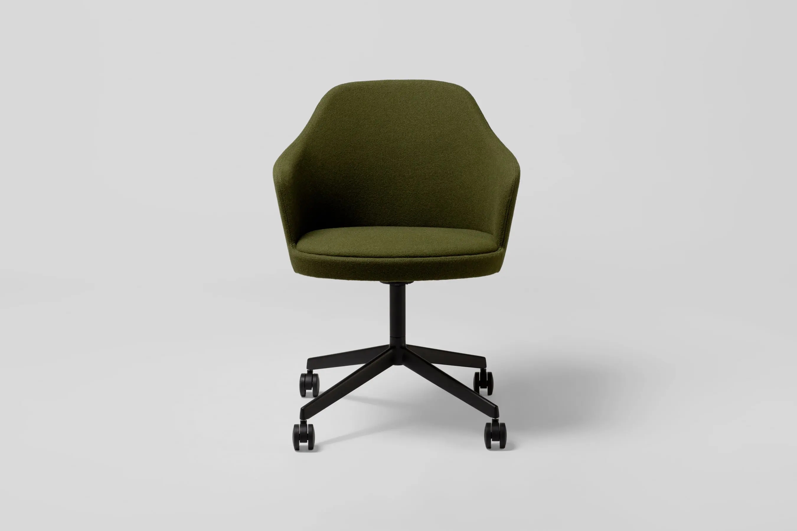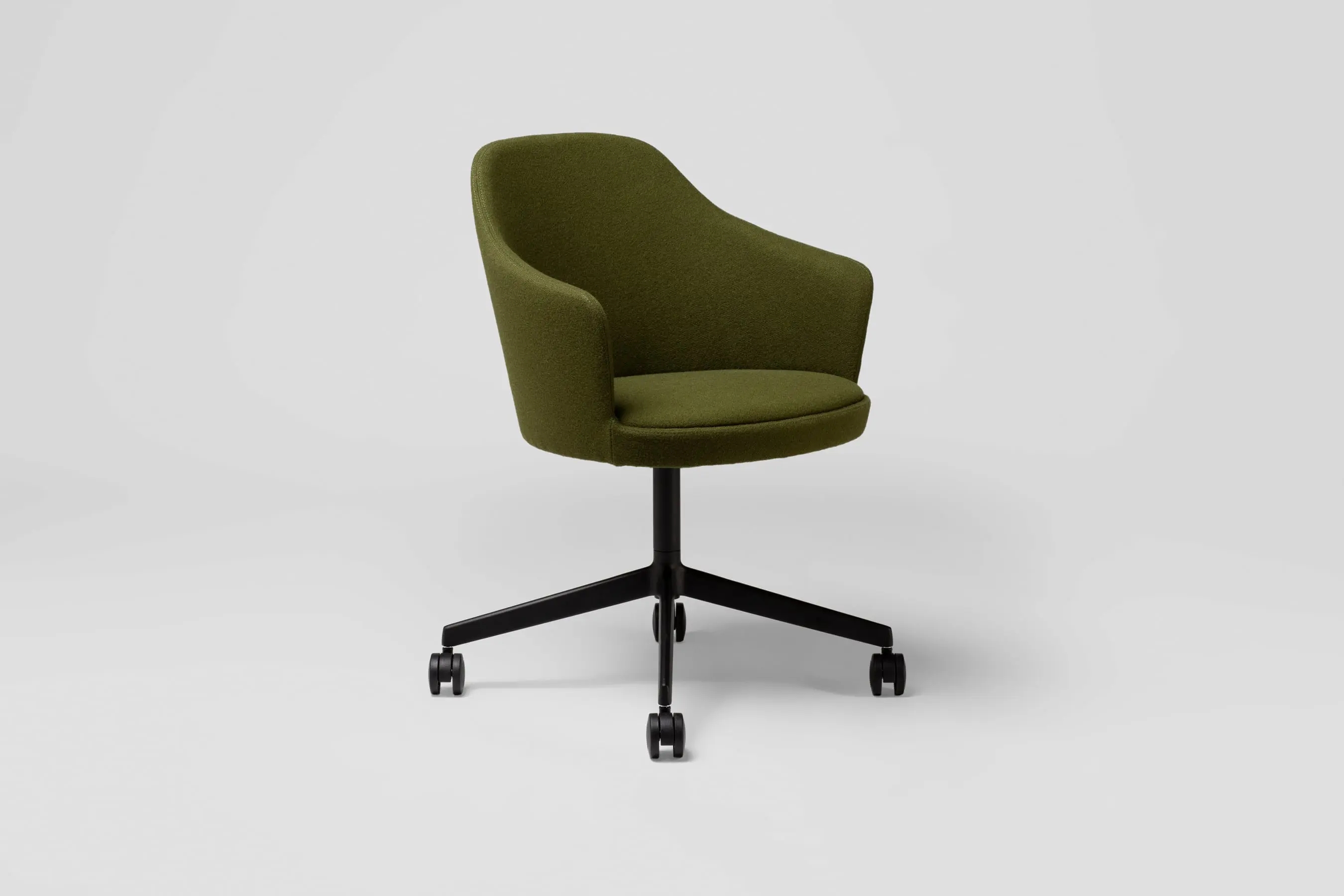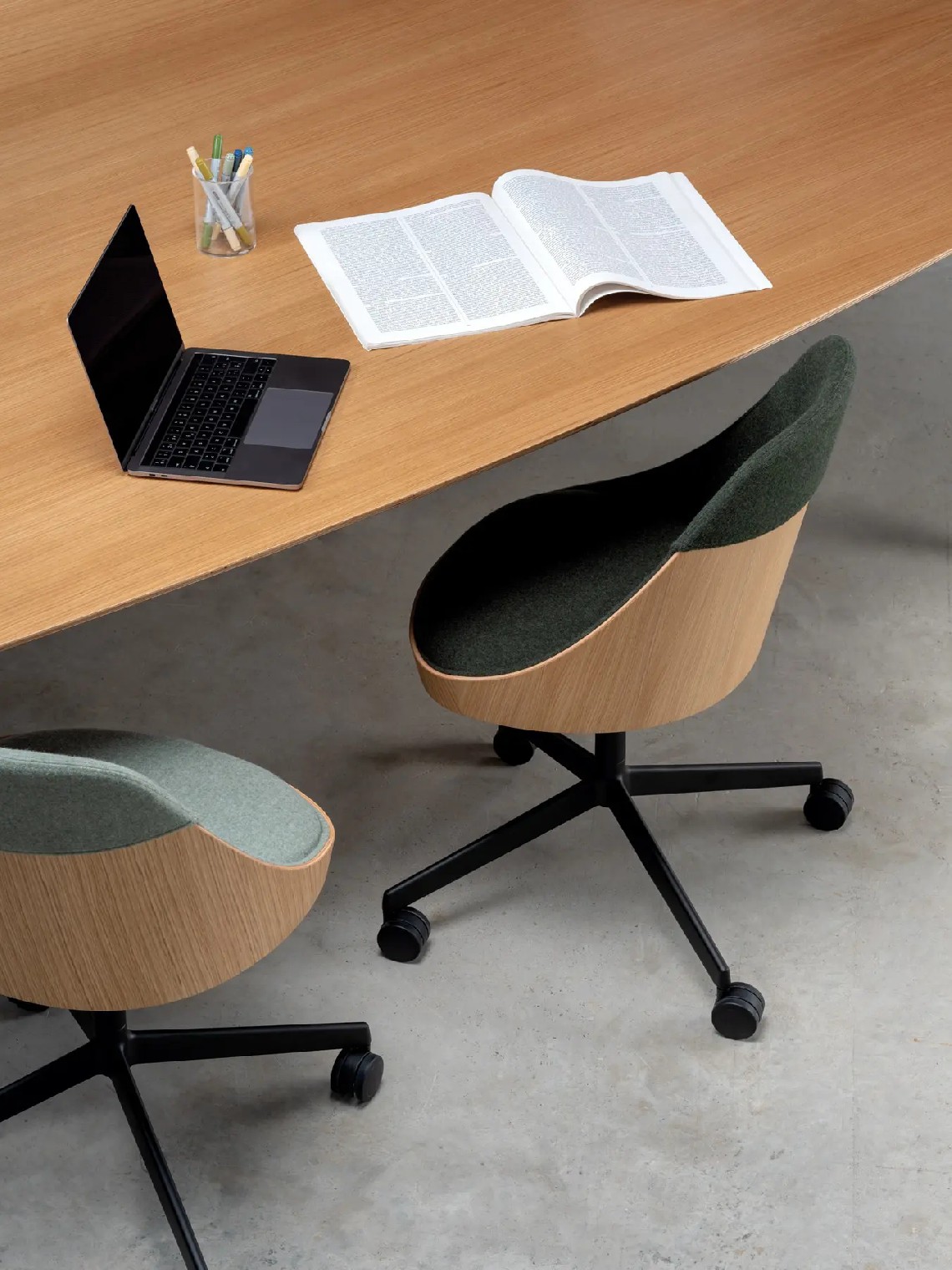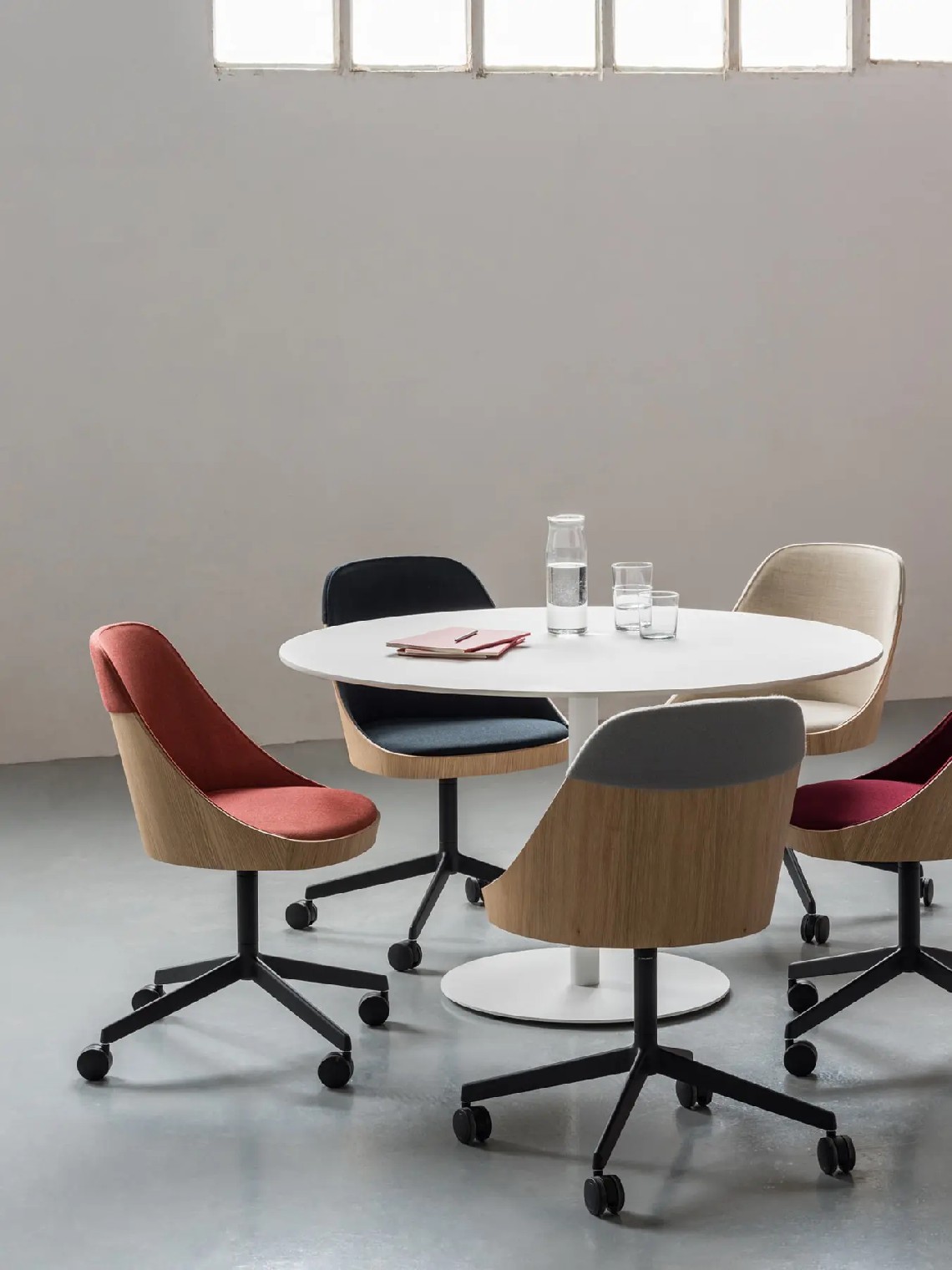 The shell of Kaiak confident chair with castors, available with or without arms, is made of natural or stained oak wood and has a broad range of upholstery options available: fully upholstered, upholstered seat, three quarters upholstered and inside upholstery. Its 4-star base is fixed due to the castors and can be lacquered in any of our colours.