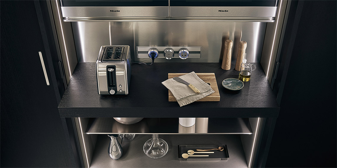 采用開孔型黑橡木制作,帶有伸縮門,配有大量內部配件。拉出式桌子和抽屜、鋼制擱板、鋁材/玻璃擱板、瓶架和玻璃架。Led Line 系列照明配有開口傳感器和電動導軌。