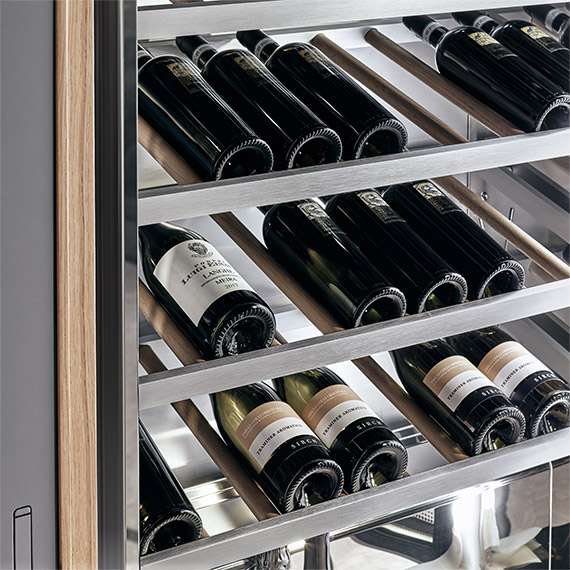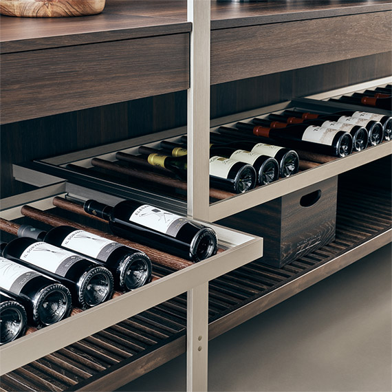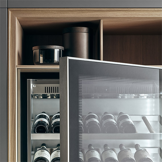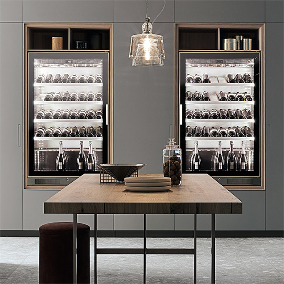 酒窖與廚房系統(tǒng)完美契合,也可以進一步擴展其功能:葡萄酒鑒賞家的完美生活區(qū)。冷藏式酒窖柜,周圍和開口部分采用北歐橡木制作。