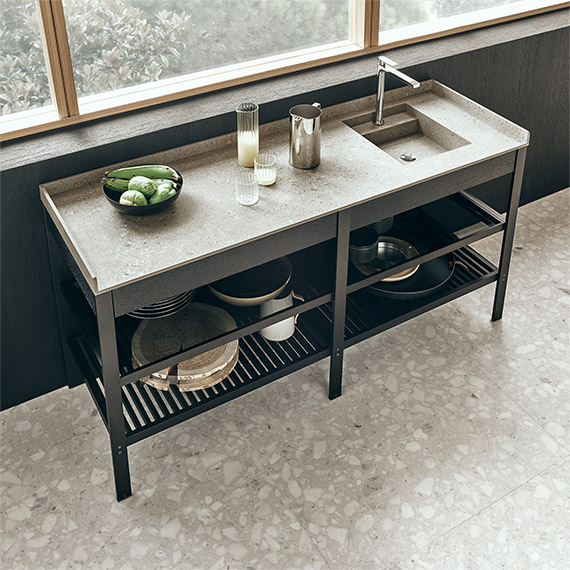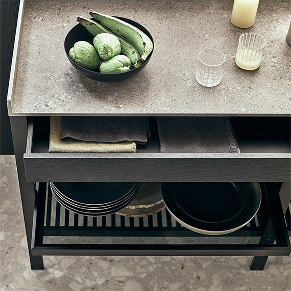 獨(dú)立式清洗整柜帶有拉出式擱板,在這里采用縞瑪瑙 metallix 鋁材和透明灰玻璃制作。固定擱板和拉出式抽屜采用開(kāi)孔型黑橡木制作。操作臺(tái)采用 Cervino 柏油石材+ 制作。背面板采用開(kāi)孔型黑橡木制作。