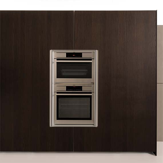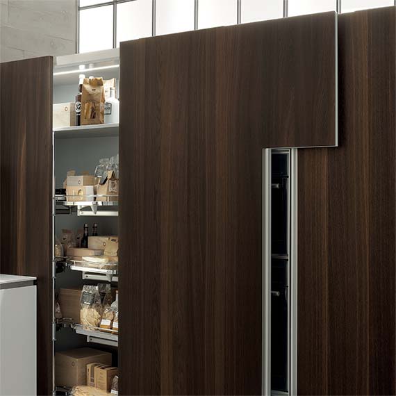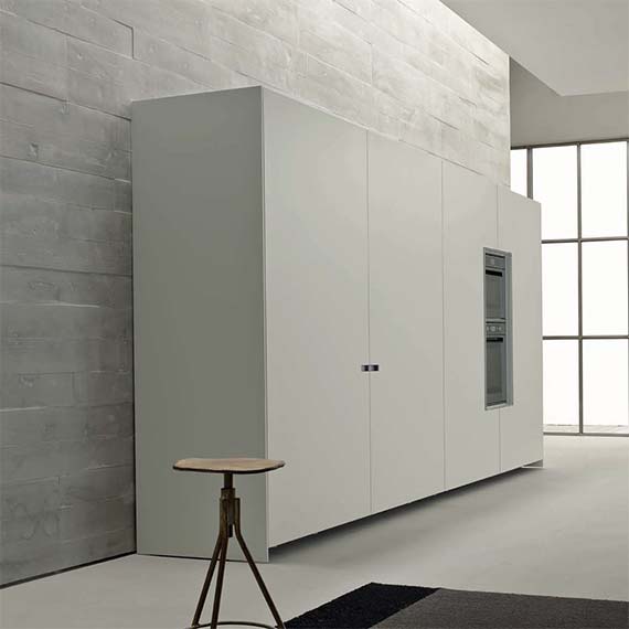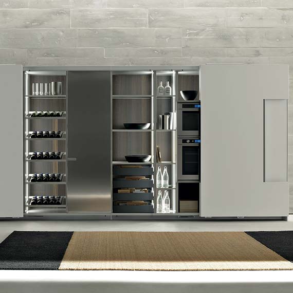 柜門采用受電弓設計的櫥柜系統,能與廚房的模塊化方案完美融合。既可以在特定部分中放置可見的電器,也可以借助“Ernestomeda 安全烤箱關閉”選配安全系統隱藏電器。