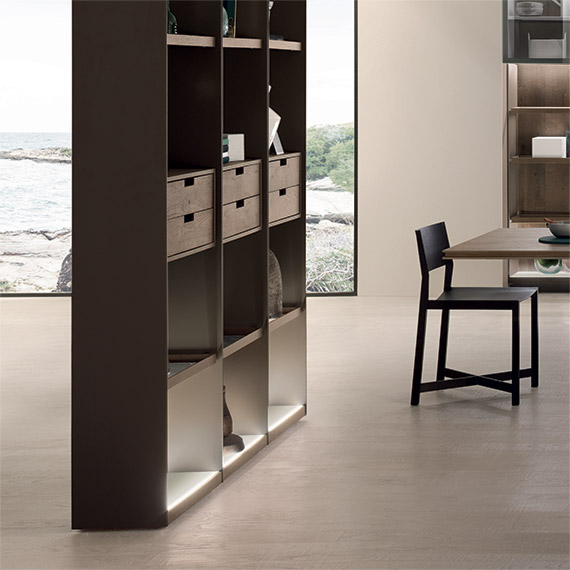 Mud Flat Matt 涂漆側板。透明灰色玻璃背板。透明灰色玻璃擱板,飾有多節 Terra d'Ombra 橡木鑲邊。多節 Terra d'Ombra 橡木材質的抽屜柜。特清磨砂玻璃頂板和地板,飾有多節 Terra d'Ombra 橡木鑲邊。