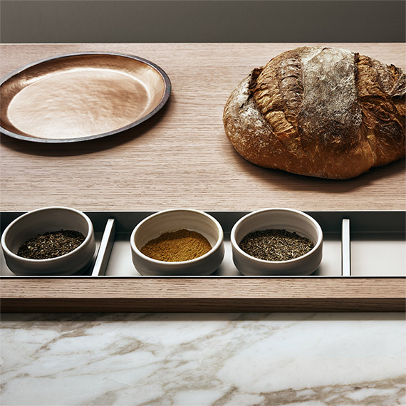 可以選擇三種 K-lab 橡木或高級木材(復古橡木和櫟木),設有可容納鋼制餐具托盤的凹槽。