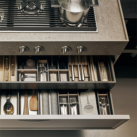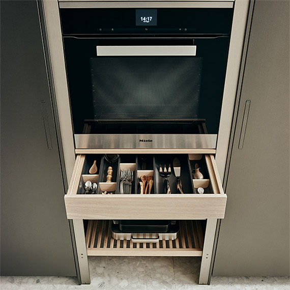 塊化內(nèi)部配件,適用于采用 Legrabox 側(cè)面的抽屜。由于種類繁多的定制配件可以滿足最廣泛多樣的需求(刀具、香料、小容器、罐子和廚用薄膜支架)并發(fā)揮不同尺寸的可拆卸隔板的潛力,通過對各個細節(jié)的精心設(shè)計,可以根據(jù)個人品味定制模塊化抽屜內(nèi)部空間。Peltrox 陽極氧化鋁框架配有北歐橡木隔板。