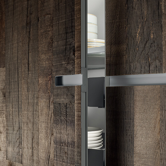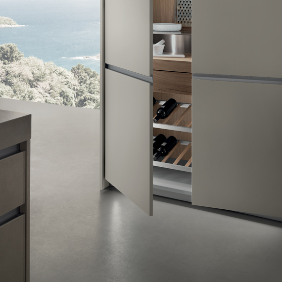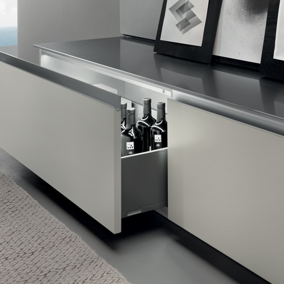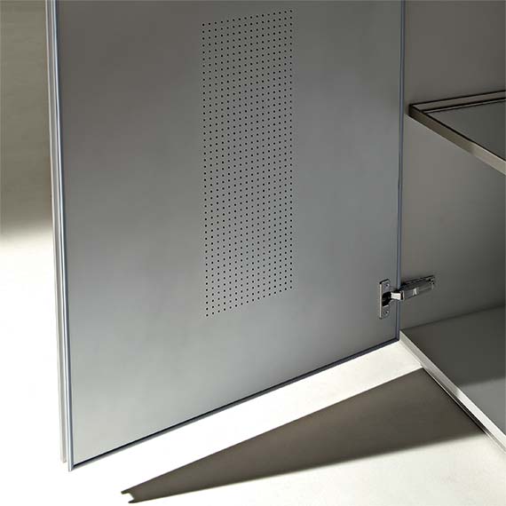 AIR(通氣)門的隱藏邊緣(地柜及櫥柜門的底邊,墻壁組合柜門的頂邊)有一個通風過濾器,而且門內部的面板上布滿了許多孔。由于安裝了過濾器,進入內部的空氣更加清潔。更重要的是,當裝有通氣門的廚房用具靠近熱源(如烤箱)或靠近氣壓不均的區域(如排風罩)時,通氣門能更好地發揮作用,能夠加速增加廚房用具內部的空氣交換,確保食品儲放在最佳狀態。此外,圓周密封設計結構能夠確保門關閉后氣密性良好,防止灰塵和污垢的進入。應該注意的是,并非所有廚房的組成元件都安裝了通氣門。內部空氣循環系統由于其特定功能而無效的元件上并未安裝通氣門。 示例包括排水器、排風罩和爐灶用具、洗碗機和冰箱門以及室內柜門。