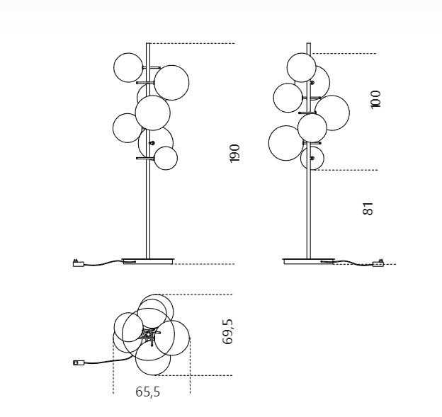 Lampada da terra a luce LED dimmerabile dotata di 7 sfere in cristallo trasparente soffiato a bocca. Disponibile anche versione con sfere colorate in cristallo soffiato a bocca nei colori “topazio”, “ambra”, “ametista” e “bronzite”. Parti metalliche in ottone brunito a mano. Dimmer presente sul cavo di alimentazione. Basamento in ottone brunito a mano e metallo laccato nero.