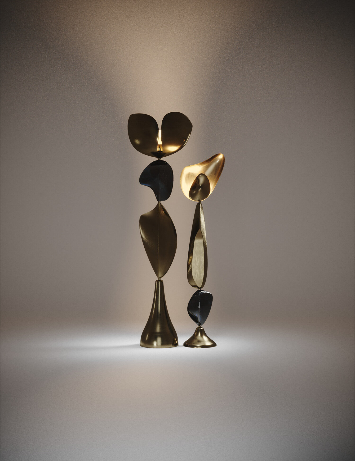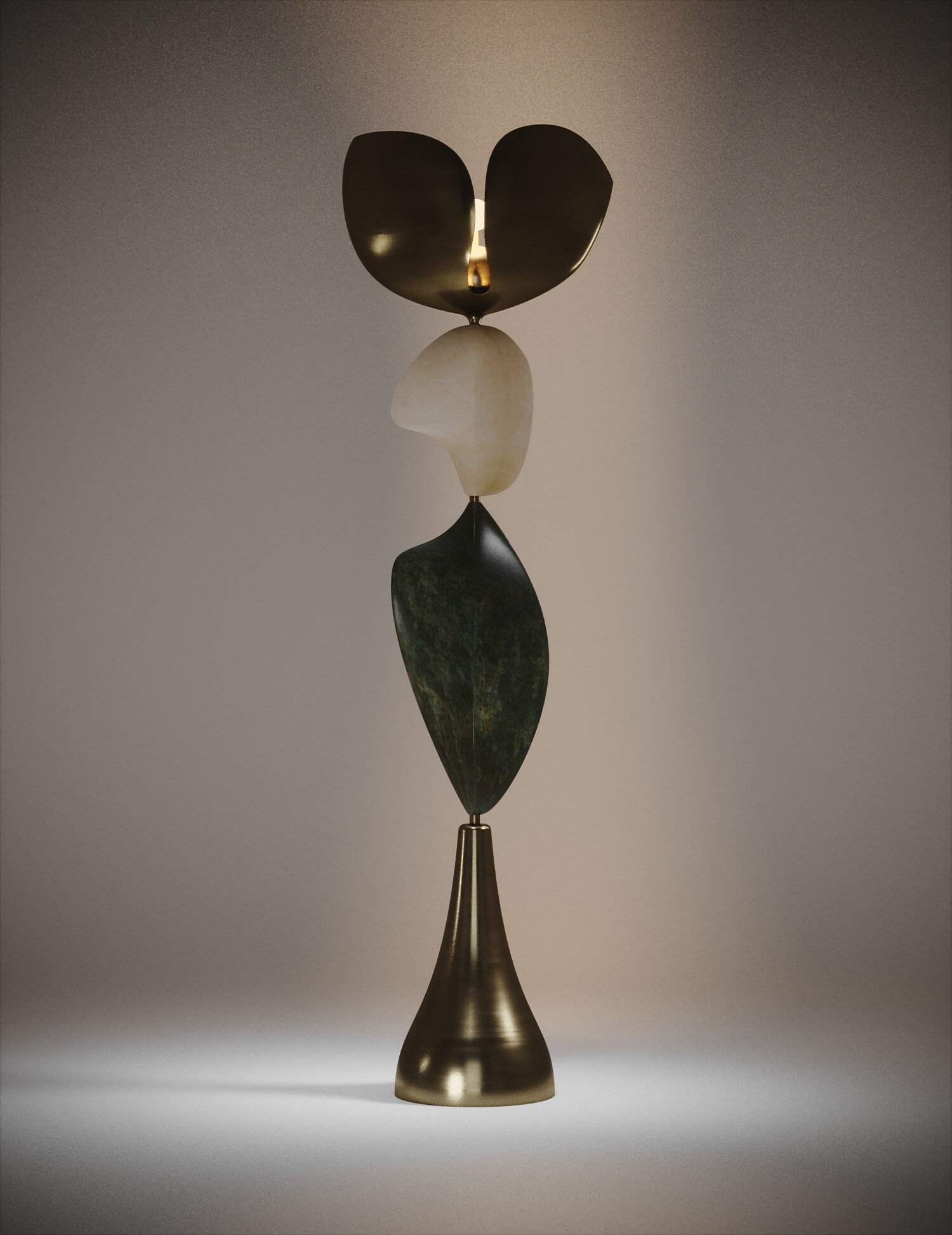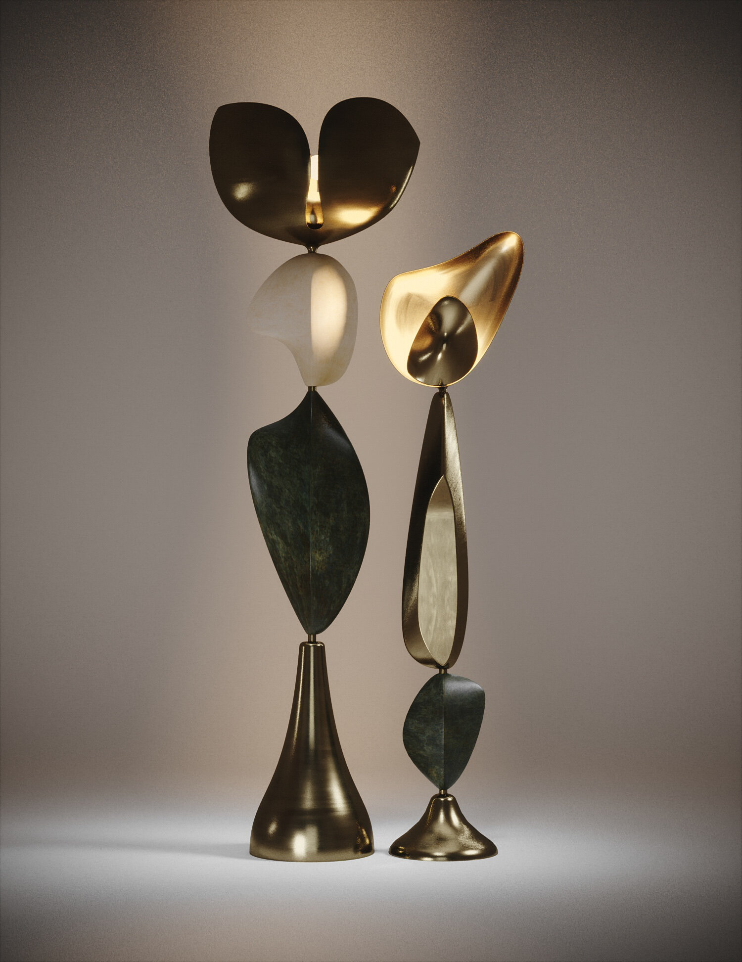 The Cosmo Sky and Cosmo Moon floor lamps by Kifu Paris are whimsical and sculptural pieces, inlaid in bronze-patina brass and each with a beautiful parchment or shell inlaid piece. The amorphous shapes are an abstract and poetic reinterpretation of a star-filled cosmic sky. This piece is a part of the Cosmo II Capsule, see images at end of slide. This piece is designed by Kifu Augousti, the daughter of Ria and Yiouri Augousti.
