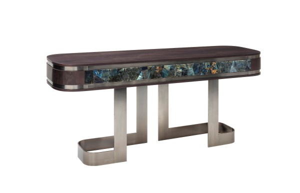 Consolle in essenza, 2 cassetti, dettagli in acciaio effetto satinato opaco o spazzolato.