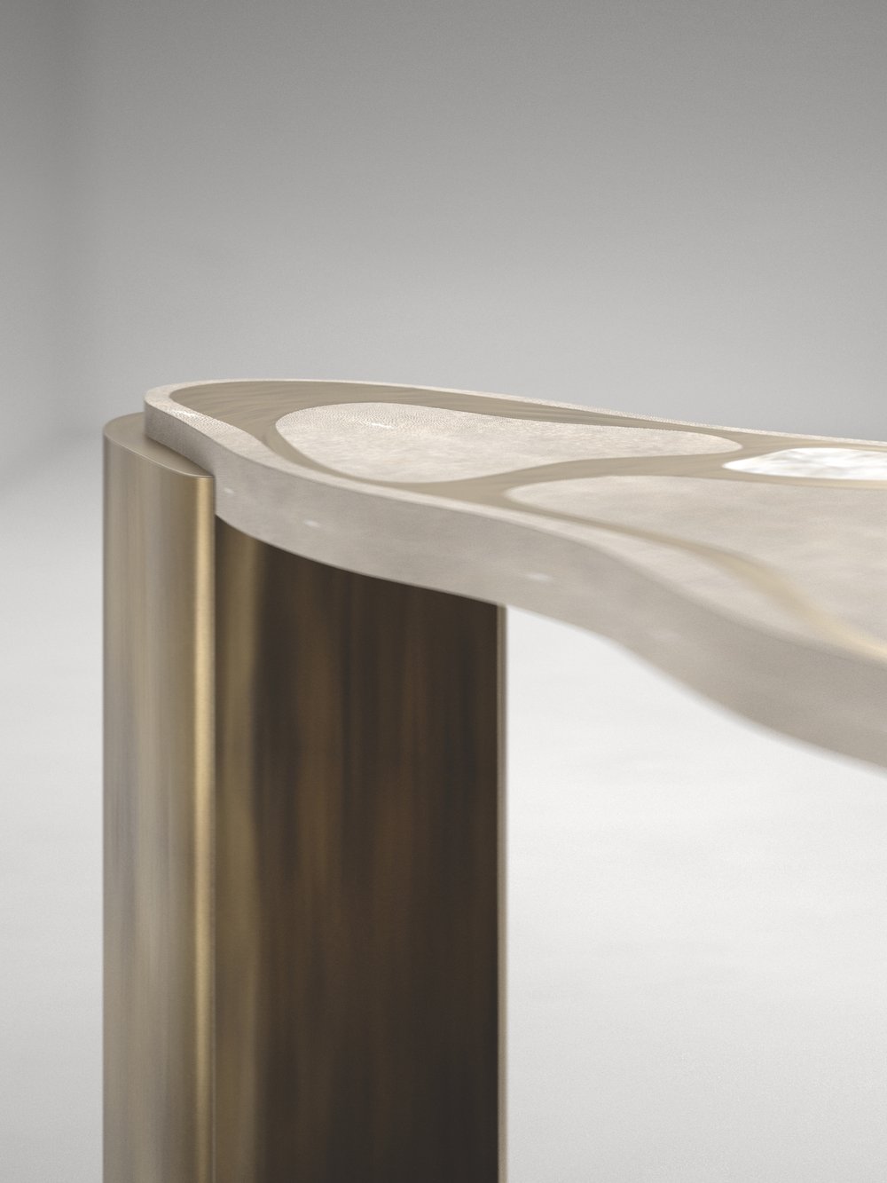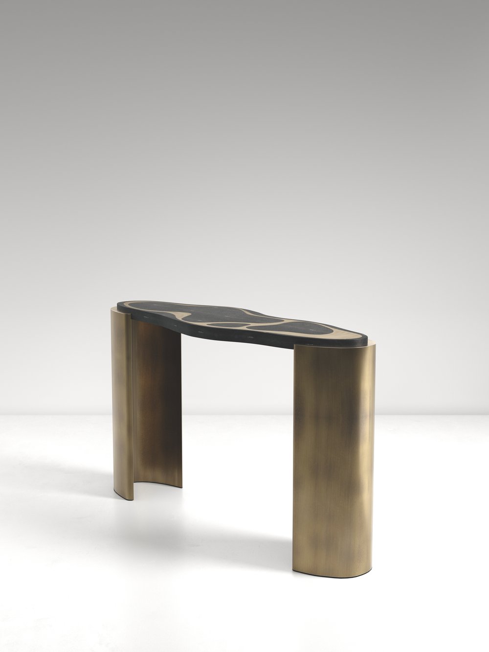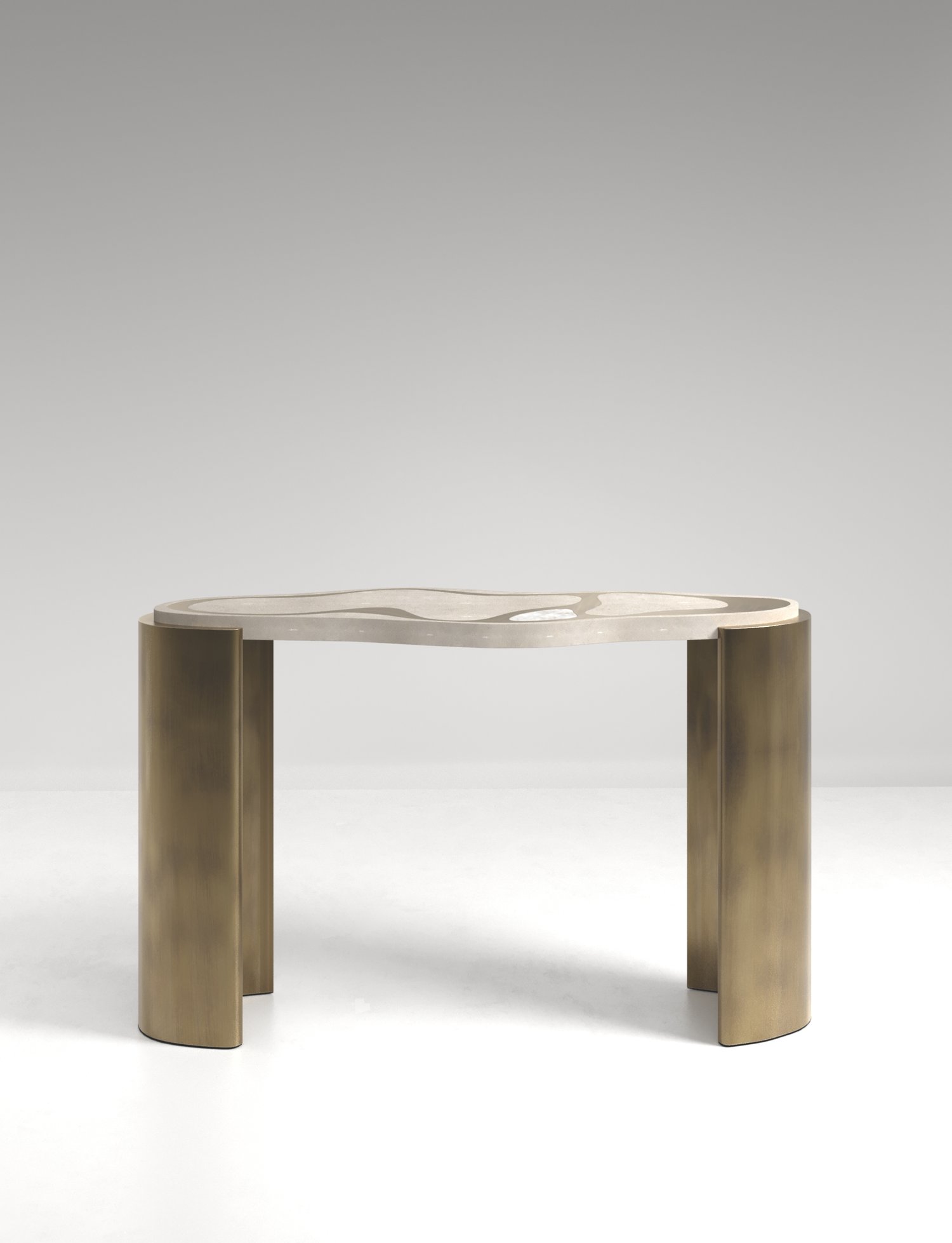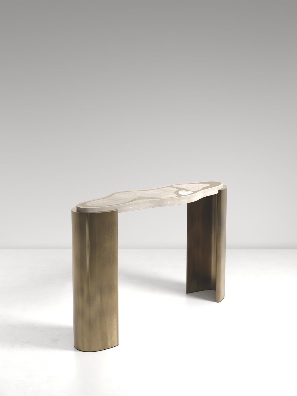 The Mask Console Table by Kifu Paris is a versatile and organic piece. The amorphous top and base are inlaid in a mixture of shagreen, white quartz or shell and bronze-patina brass. This piece is designed by Kifu Augousti the daughter of Ria and Yiouri Augousti. Available as a nesting side table and a coffee table