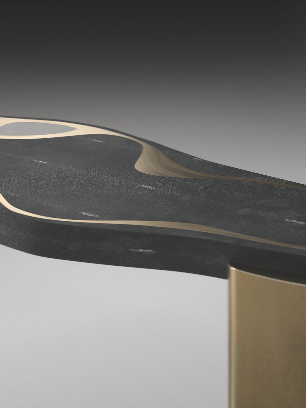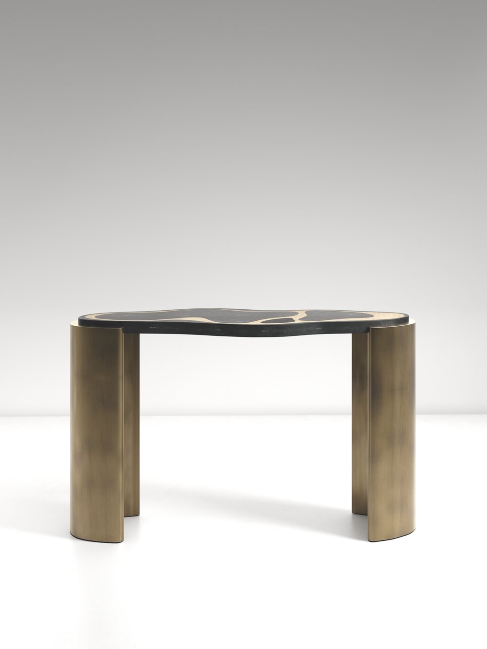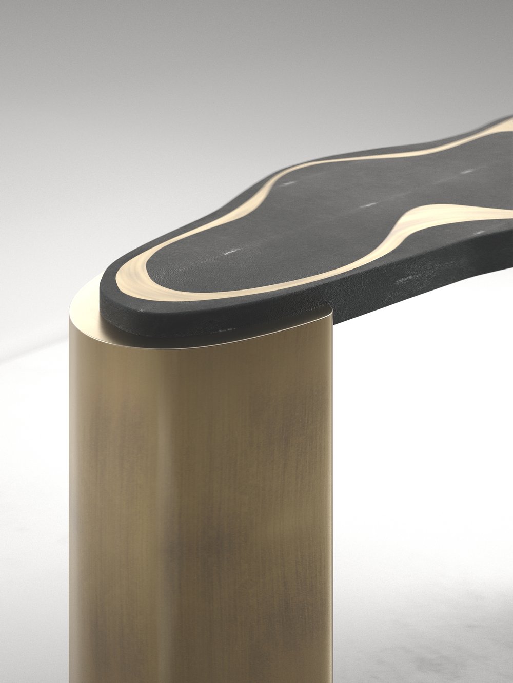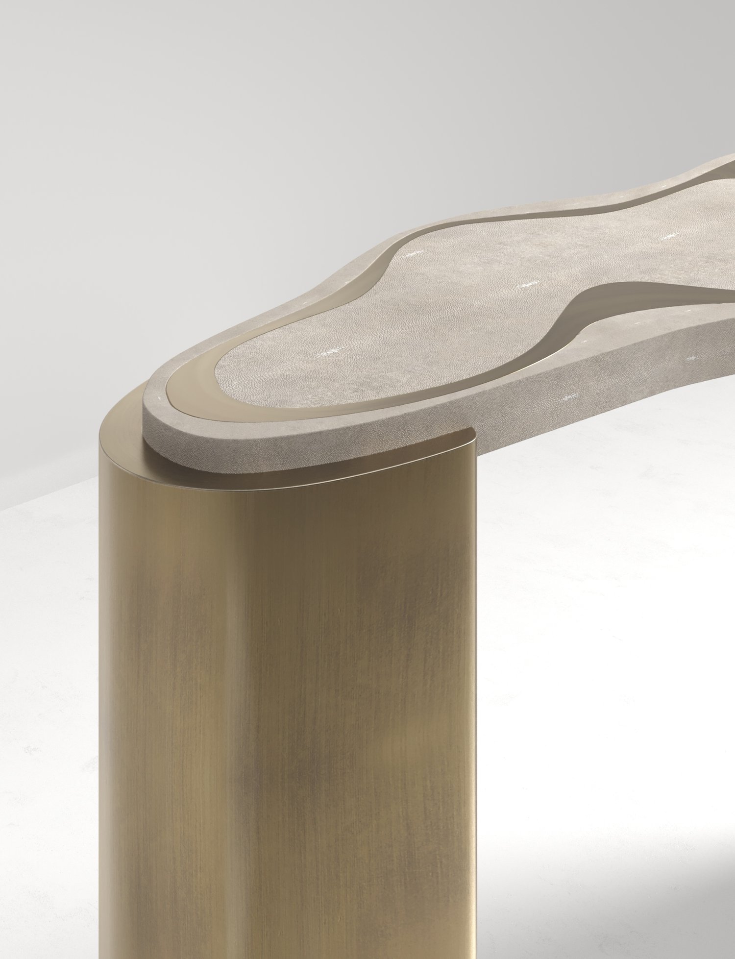 The Mask Console Table by Kifu Paris is a versatile and organic piece. The amorphous top and base are inlaid in a mixture of shagreen, white quartz or shell and bronze-patina brass. This piece is designed by Kifu Augousti the daughter of Ria and Yiouri Augousti. Available as a nesting side table and a coffee table