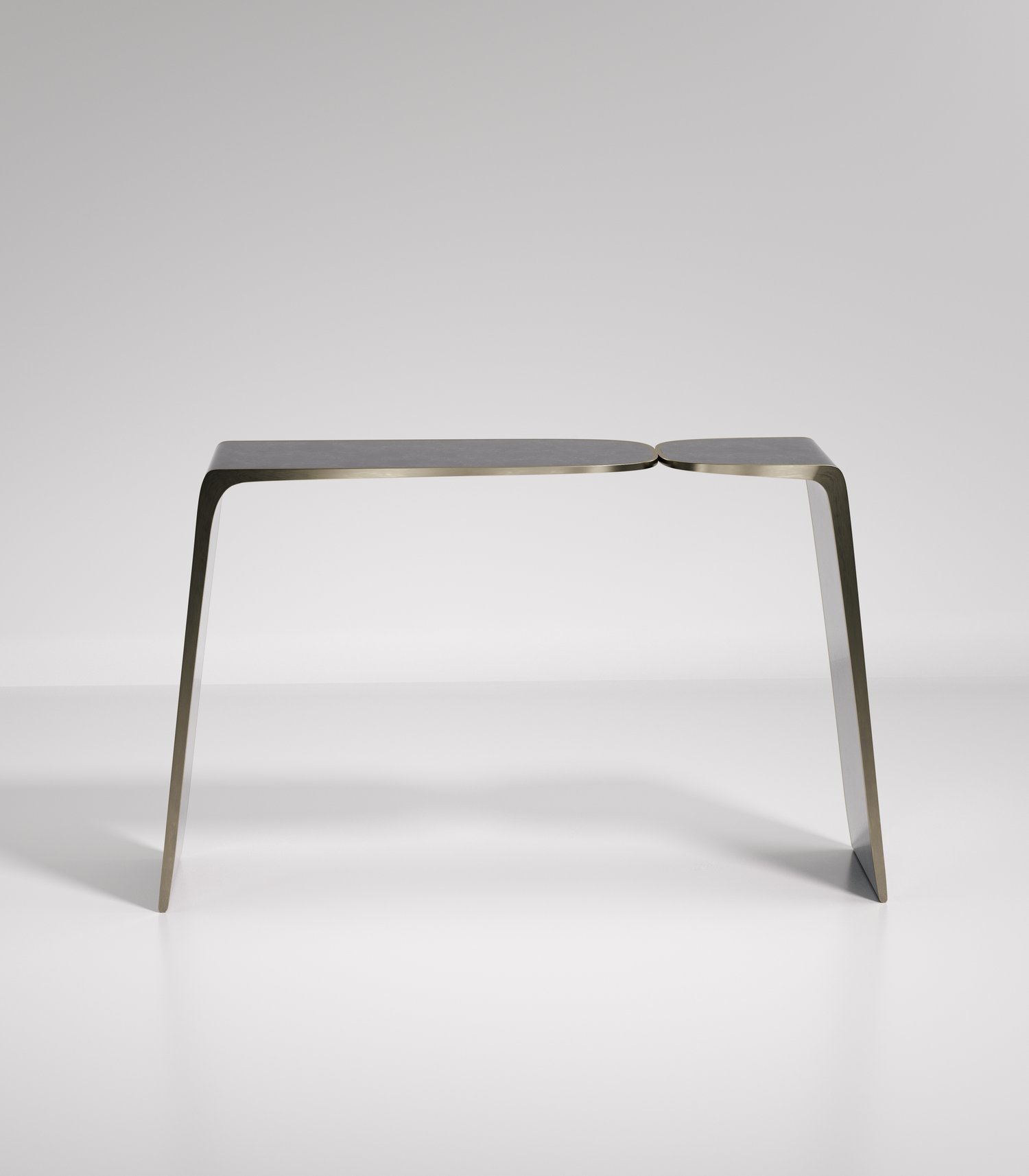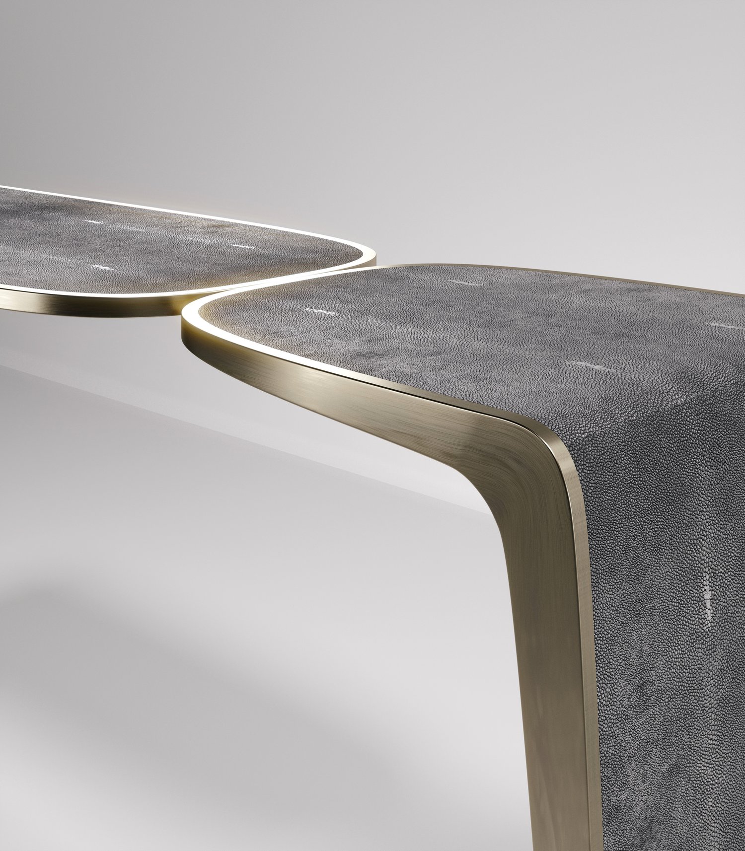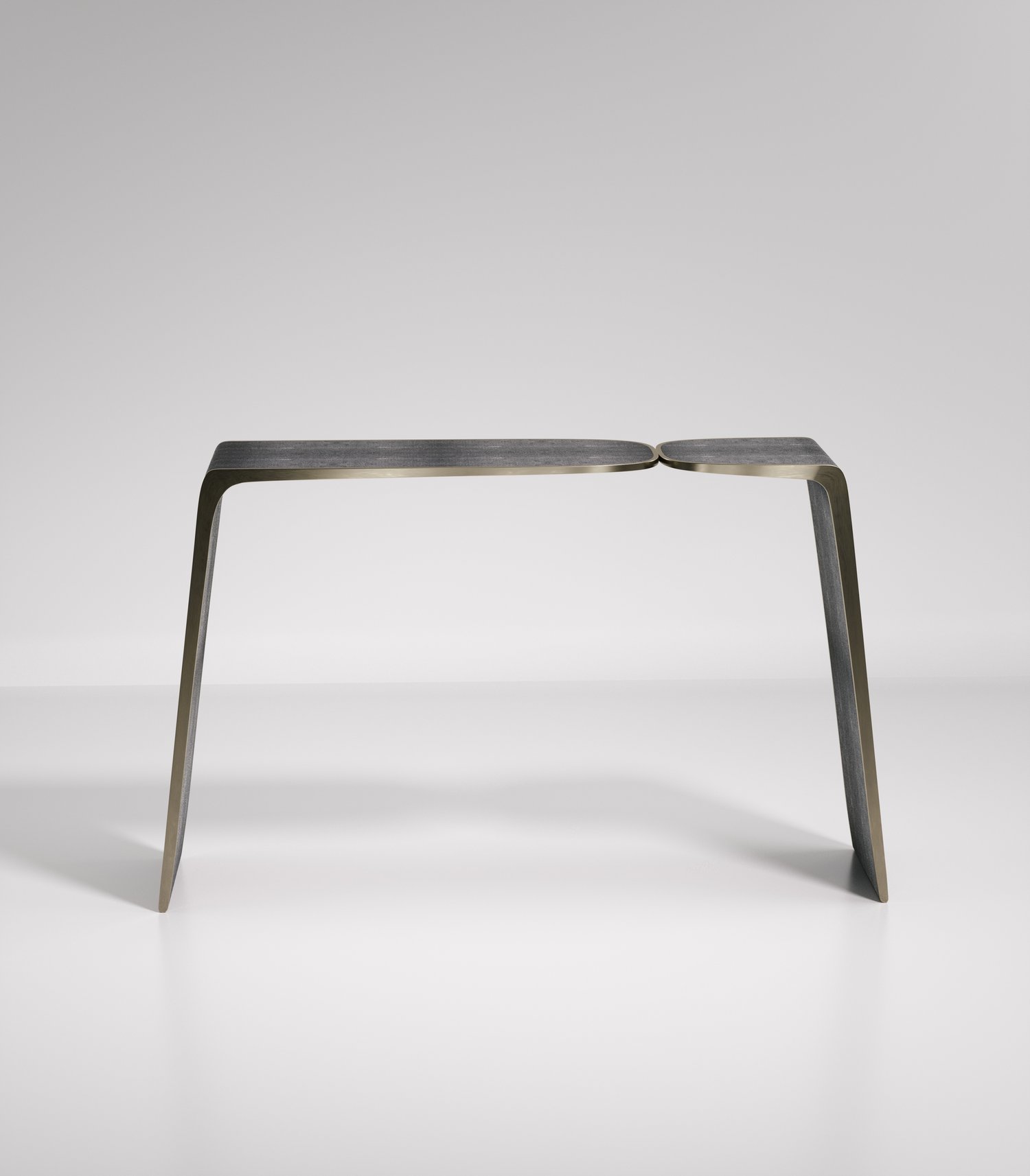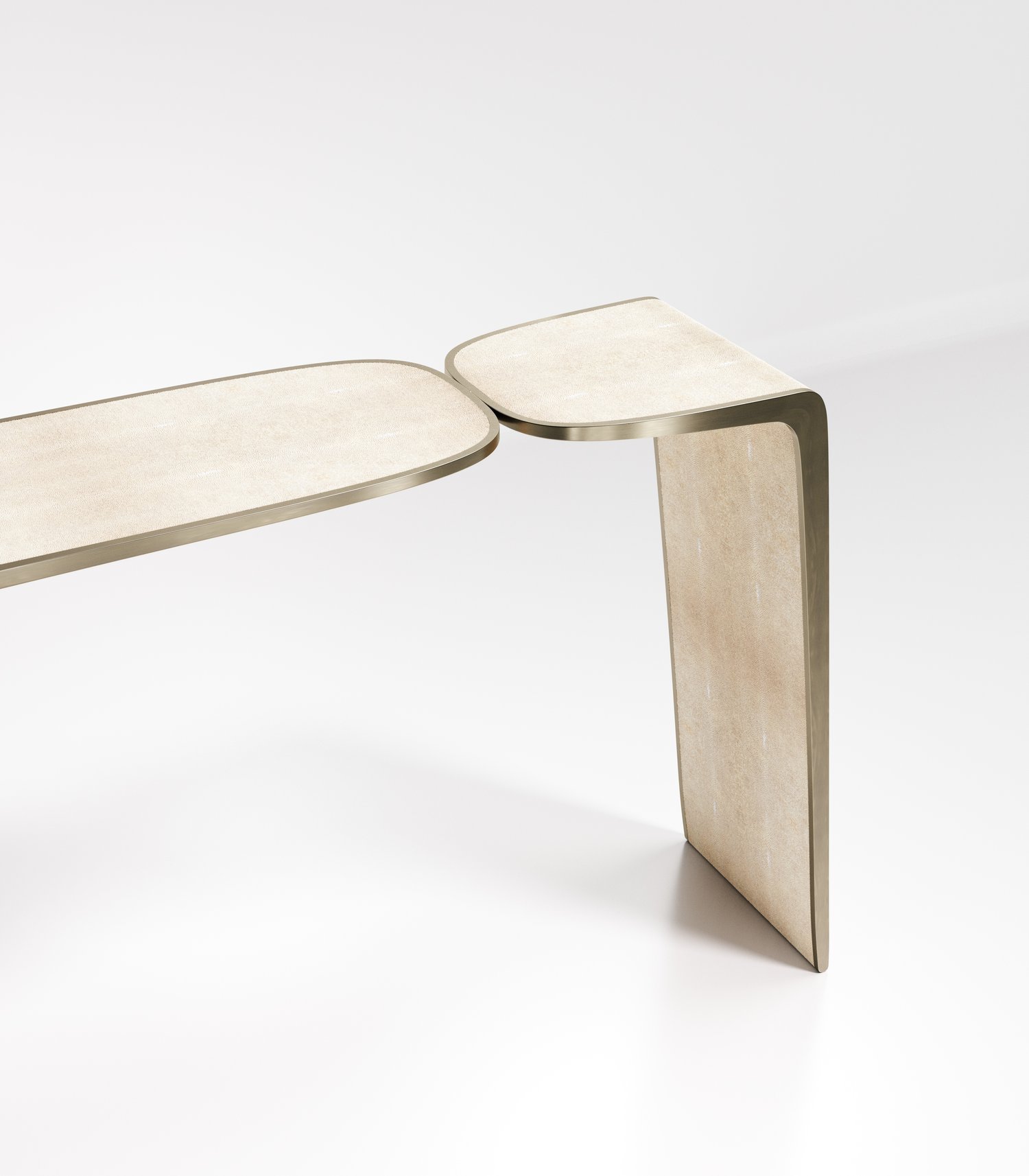 The Kiss Console by Kifu Paris is an elegant and organic piece in it's unique design. The cream shagreen inlaid piece curves inwards to create the "kiss" effect. The borders are accentuated by bronze-patina brass. This piece is designed by Kifu Augousti the daughter of Ria and Yiouri Augousti. Available in other finishes. Part of the Kiss Capsule.