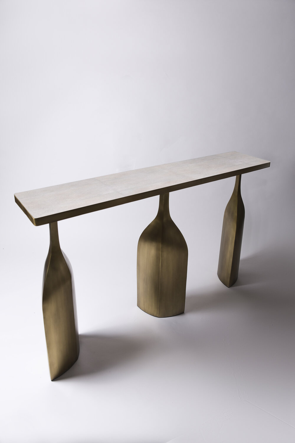 The Trinity Console is bold and exquisite in design. The top is inlaid either with the dreamy semi-precious stone: tiger eye blue or with our signature Antique Natural Shagreen. The Tiger Eye Semi-Precious Stone features incredible natural details with its mixture of blue, black and gold hues. The top sits on three stunning bronze-patina sculptural legs.