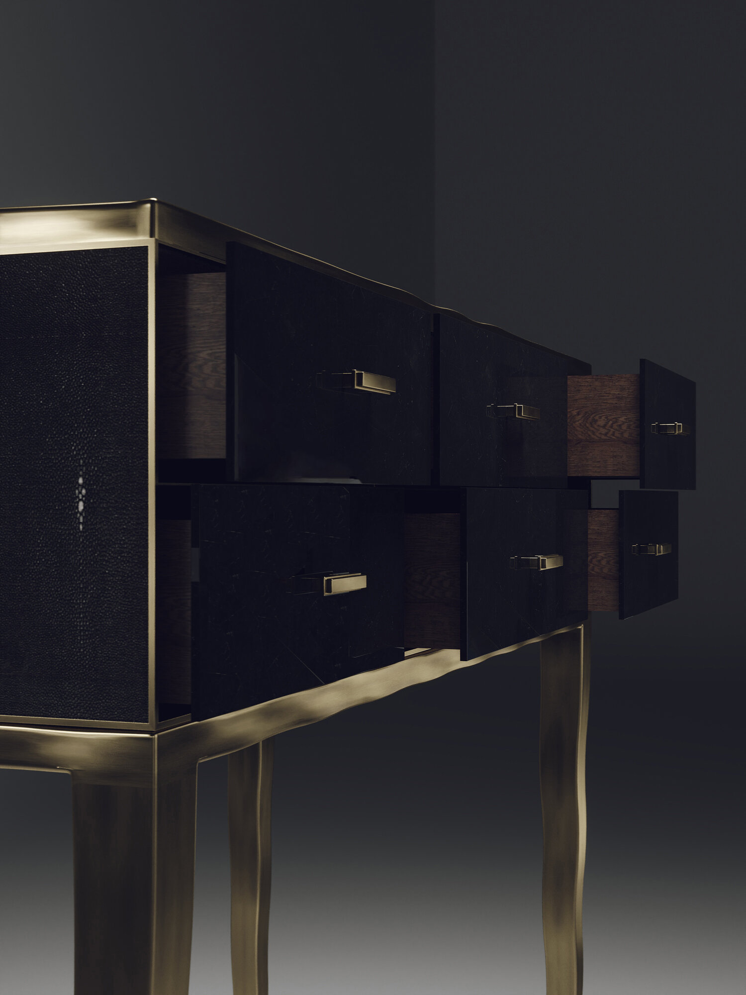 The Melting Cosima console table by R&Y Augousti is a stunning multi-faceted piece. The beautiful signature "melting" inlay work in bronze-patina brass demonstrates the incredible artisan work of Augousti. This piece includes 6 drawers total, and the tabletop is slightly dipped making this a great console for your entrance or vanity. This piece is inlaid in a mixture of patagonia and cream shagreen, available in other finishes. Custom sizing/finishing available on request.