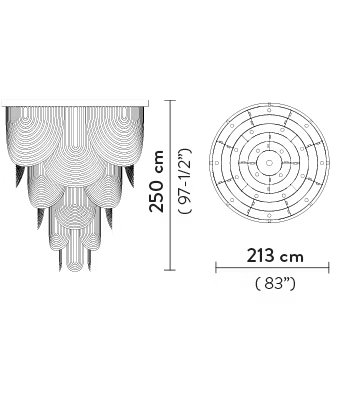 Le Grand Ceremony is a ball gown, a pearl necklace, and the draping of a neckline. Its imposing size contrasts with an intrinsic lightness that makes it easily installable in large-scale projects. 21 spotlights encircle a customizable iron ring (finishing to be determined per project), inserted in the lowered or false ceiling necessary to electrical connection. The light from the light sources spreads among the Cristalflex? 'necklaces,' creating broad and enveloping lighting effects.