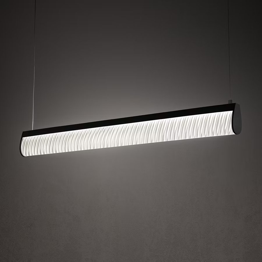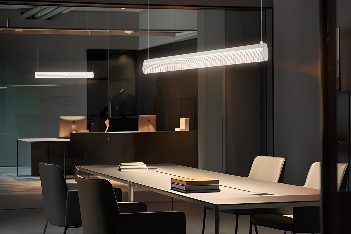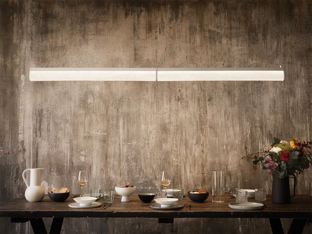 Modula is a versatile collection that creates unexpected plays of light. Columns from Medieval cloisters inspired a Plissé effect, and sparkling stones are reflected in a Crystal effect, each taking a lamp that is outwardly minimal to an explosion of creativity, where even, linear light liquifies throughout. Modula is compliant with the UNI EN 12464-1:2011, regulation establishing requirements for workplace lighting to meet safety and visual comfort needs.