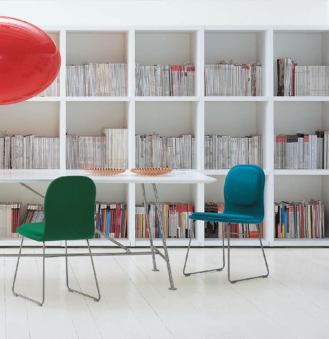 The structure of these seats is made of beech plywood, with a fixed cover in the fabrics and leathers from the collection. The base is built of stainless steel with a satined or matte varnished finish in white, mud or anthracite.