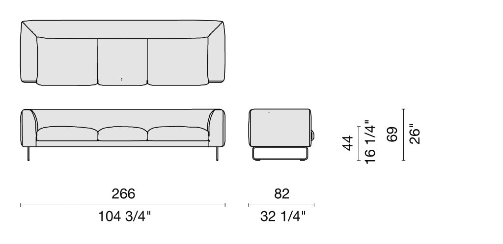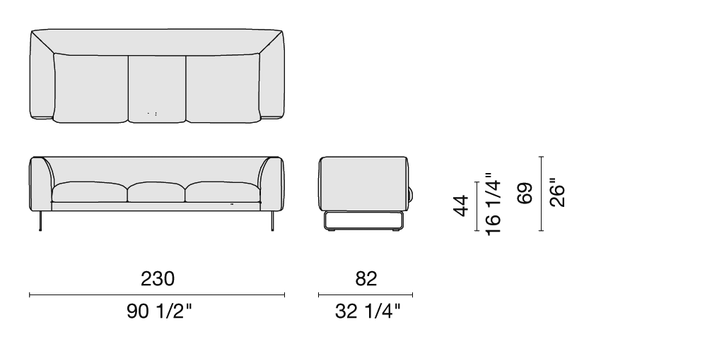 Elan sofas rest upon medium-density conglomerate panels, solid fir wood, poplar plywood and metal inserts on top of springy elastic belts; padded with polyurethane foam to ensure an optimal level of comfort and durability. The feather-stuffed cushions can also be made of foam, upon request. The removable cover is available in the fabrics and leathers from the collection; the legs are made of satined stainless steel or can be matte lacquered in white, mud or anthracite; the feet are made of grey polypropylene.