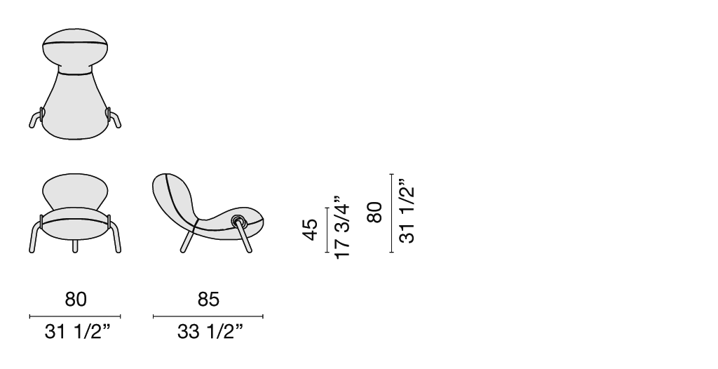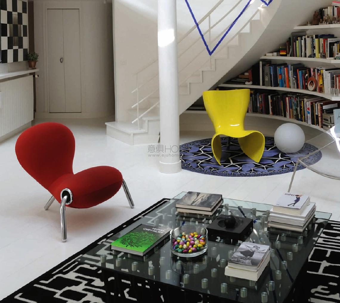 Designed by Marc Newson, the Embryo Chair has three legs and a chromed steel structure padded with moulded polyurethane foam. The fixed bi-elastic fabric cover is available in white, black, orange, yellow and turquoise.