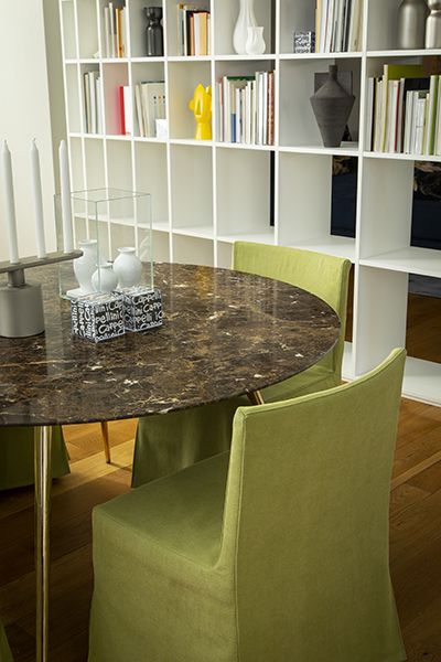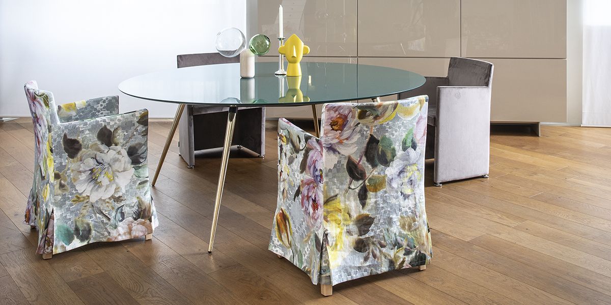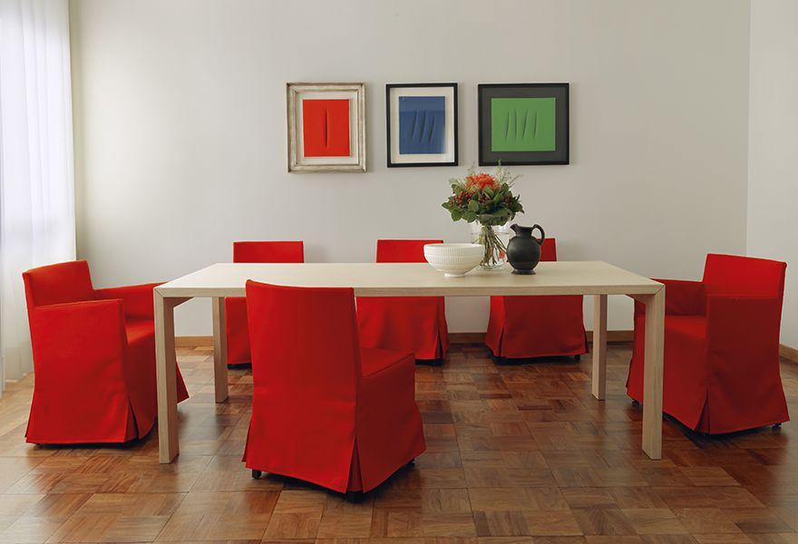 The stylistic purity of the Hard Dress chair by Piero Lissoni invites multiple interpretations. For a more solemn and discrete version, with or without armrests, the piece can be upholstered with a removable cover with a traditional inverted pleat, in a selection of the fabrics from the collection.