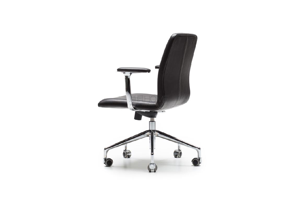 Born from the meticulous study of manufacturing to ensure greater comfort while seated, the chair is embellished with saddlery stitching and a double-shell back. The Lotus Comfort chair is padded with soft polyurethane foam and upholstered with a fixed cover in the fabrics and leathers in the collection. Easily adaptable in a wide variety of professional settings, these armchairs can be personalized by matching the seat upholstery with the various chromatic hues available for the swivelling base and armrests, which is made of aluminium finished with either polished chrome or matte lacquered in anthracite, mud or white.