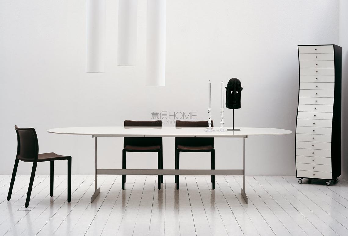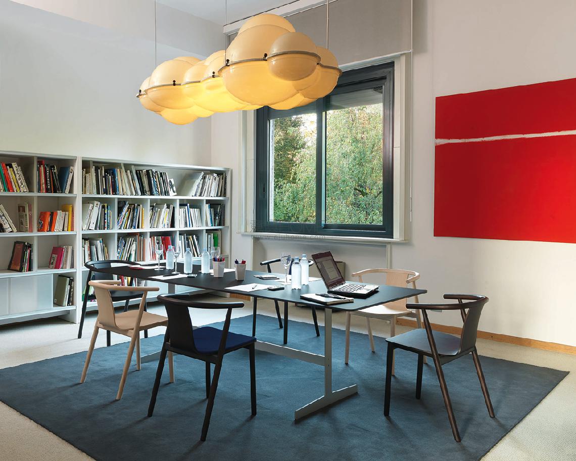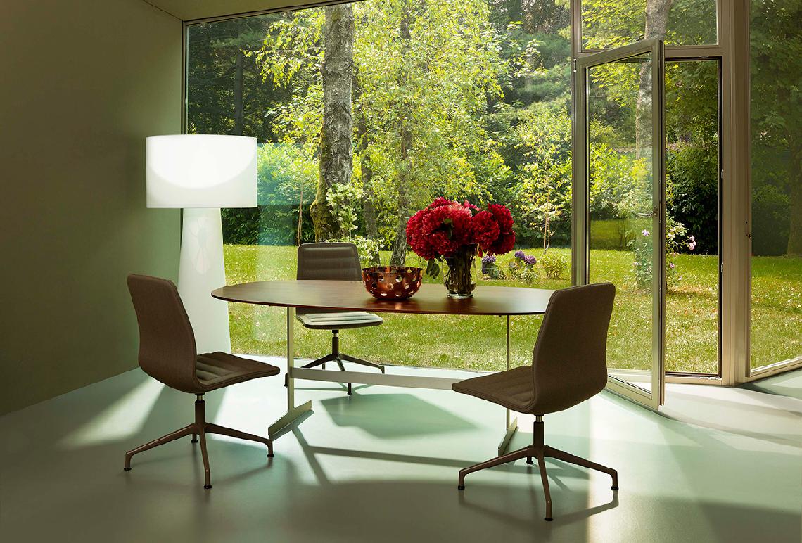 The delicacy of the contours define the Simplon table, designed for Cappellini by Jasper Morrison. The range includes tables and side tables with a base made of anodised aluminium, and a top in poplar plywood paired with polished aluminium, with a lacquered (matte or glossy) finish or oak (natural or wingé-stained); the top of the low-lying table is also available in elegant white Carrara marble.
