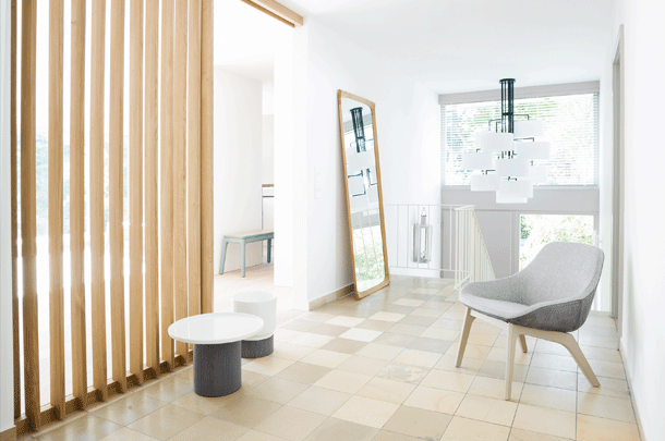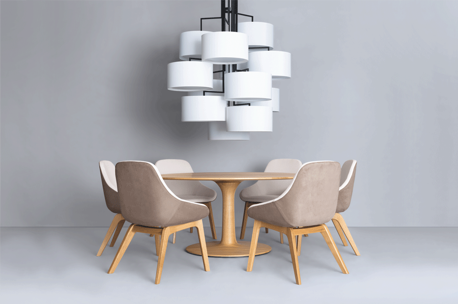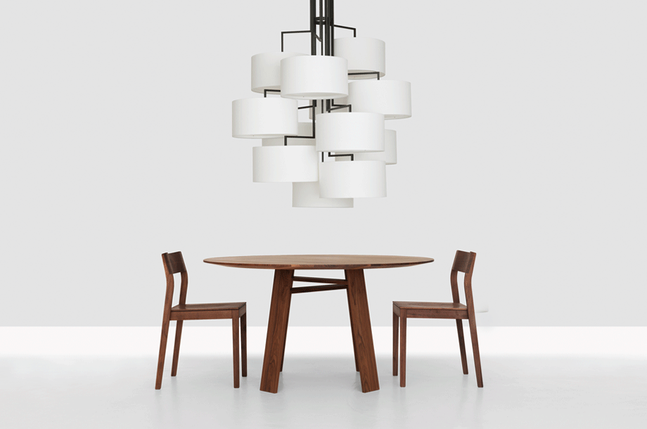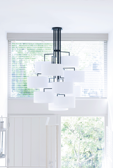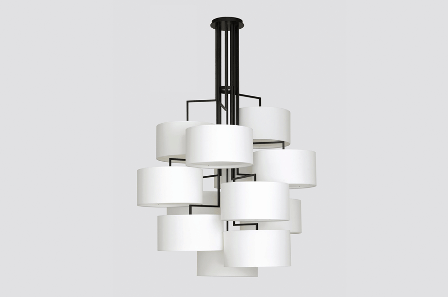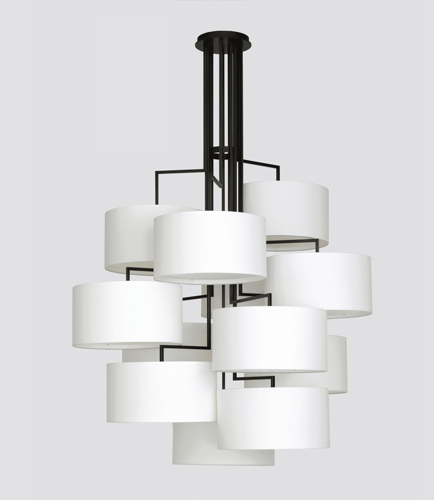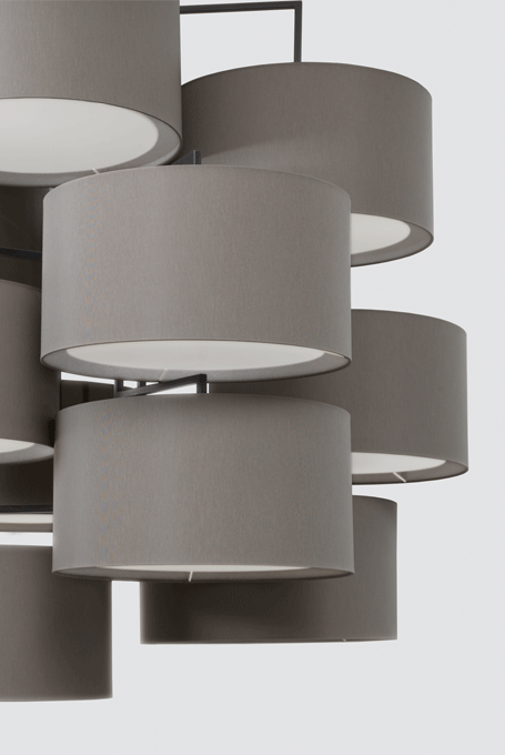 NOON 12 will take up all attention and always seeks to occupy a central position as object in the room. Alongside the long table it will upgrade every gallery level, staircase or reception area. The desire for simplicity and the pleasure in pure design led to a geometrical abstraction of natural branch forms. The NOON range of lamps is rigidly constructed, the textile lampshades give a soft light. The matt black or matt white powder coated finish gives the iron a soft and warm appearance. The intrinsic value of the lamps is a product of material and hand-crafted details.