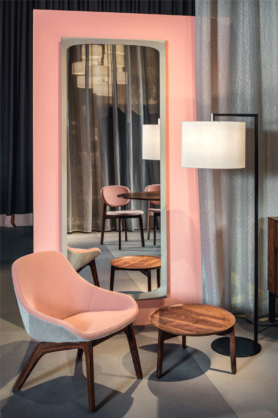 The three-dimensional deformation of its frame turns the BONNY mirror into a true jewel on the wall. The flowing transitions between the profiles combine into a clever interplay of arches and edges to offer the viewer a visually stunning spectacle. The soft movement lends the material an appearance as if it was gently sliding from the wall.