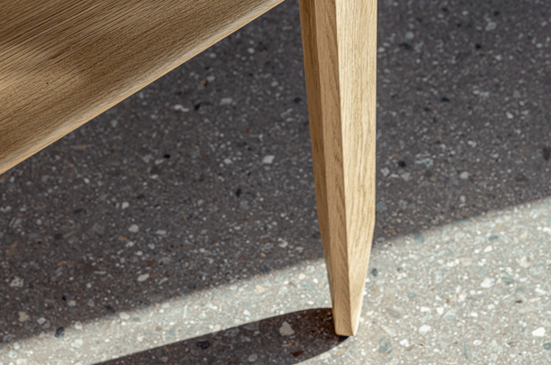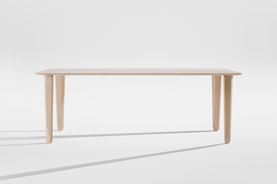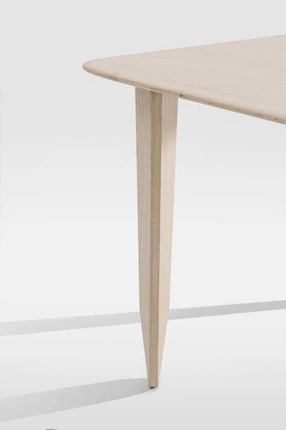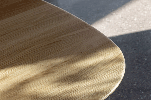 KUYU DINE – cut diamonds from solid wood. Inspired by and abstracted from African masks, precision cut table legs have been created to carry the table top. The cut diamonds of solid wood appear sculpturally powerful and at the same time seem to float. You can choose from three tabletop shapes: Circle, rectangle and convex rectangle.
